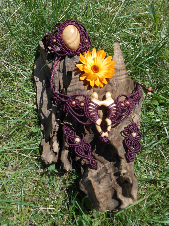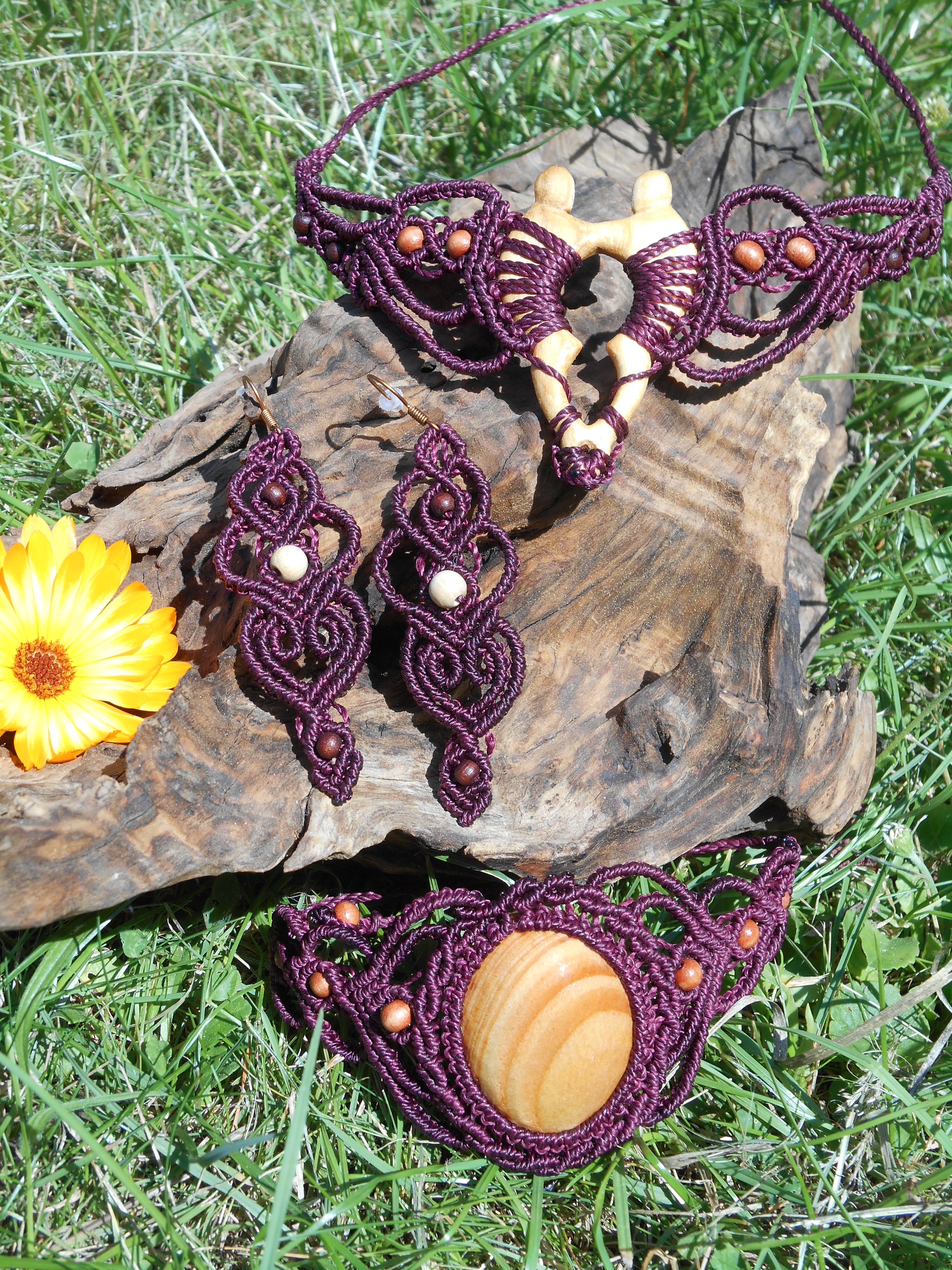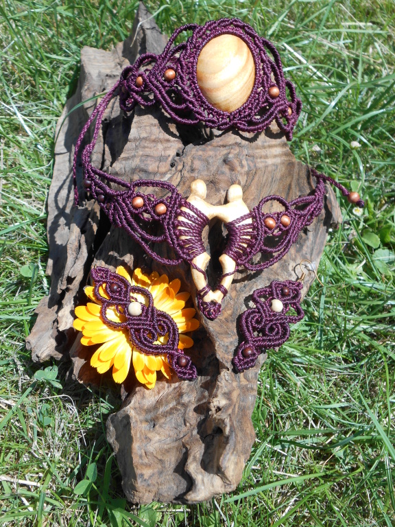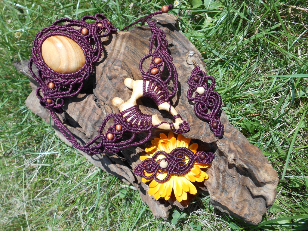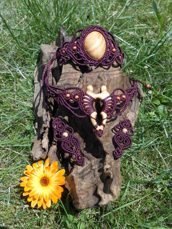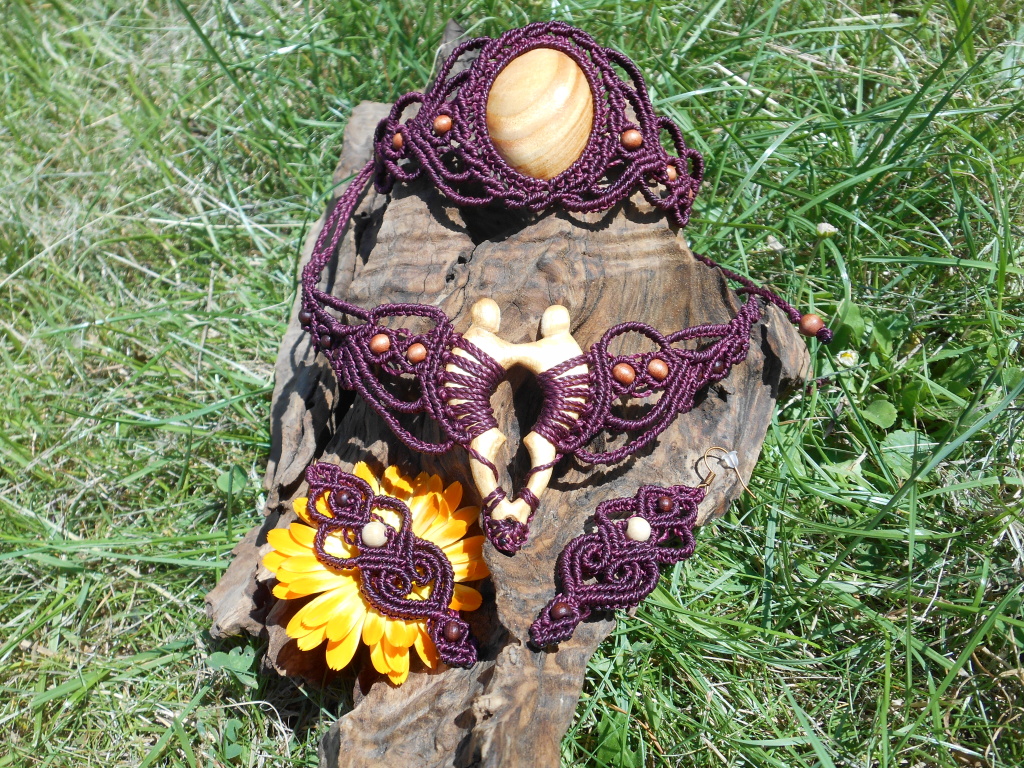 Lipové dřevo, ručně vyřezávané, spojené s technikou vázání uzlů, micro macramé. Pro ženu, která si je vědoma svého rozkvětu a své hodnoty, jedinečnosti i darů a která prožívá život plnými doušky.