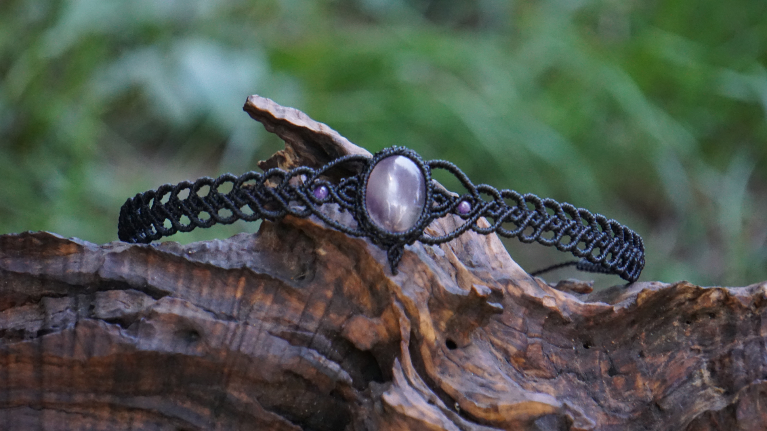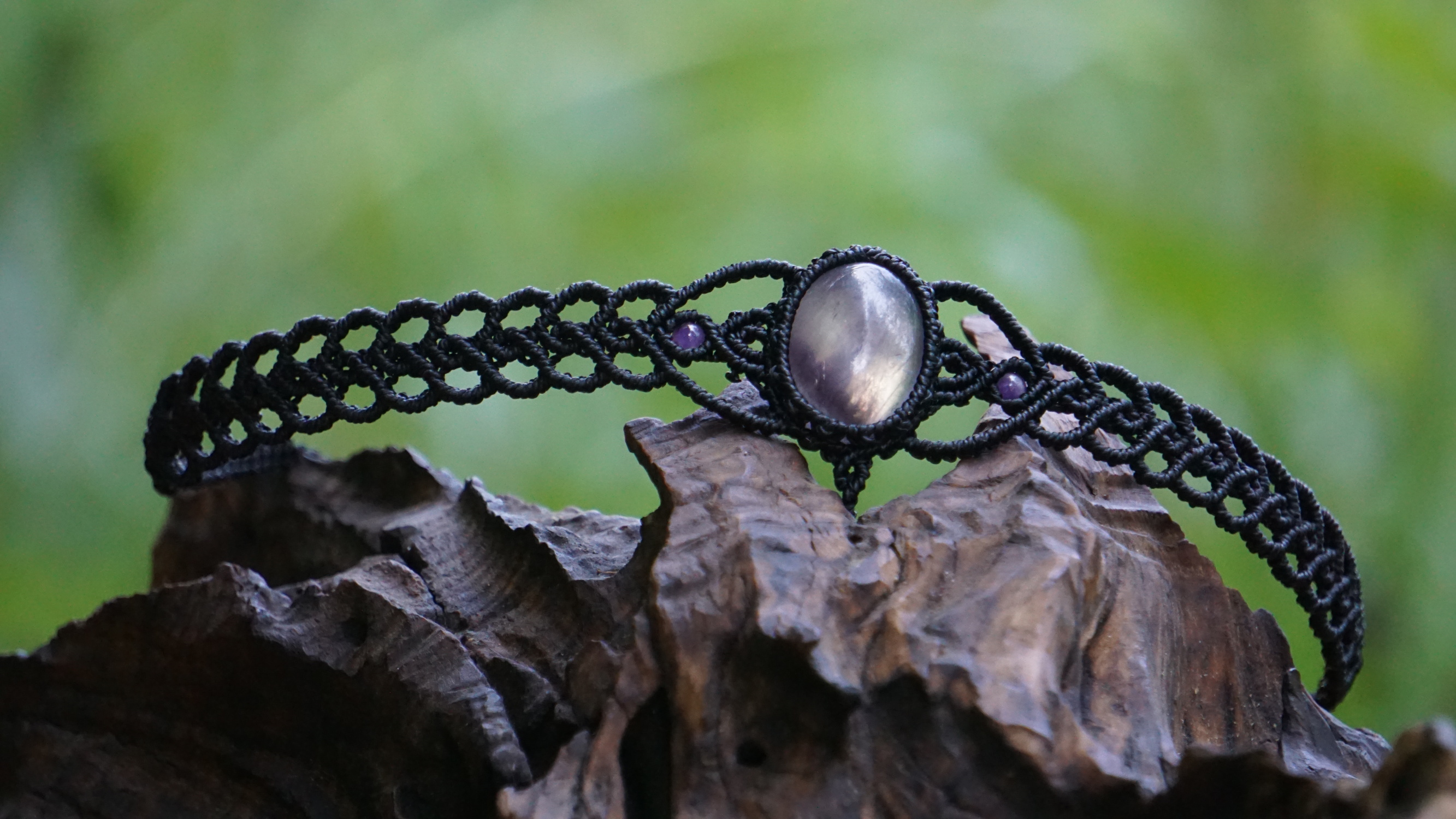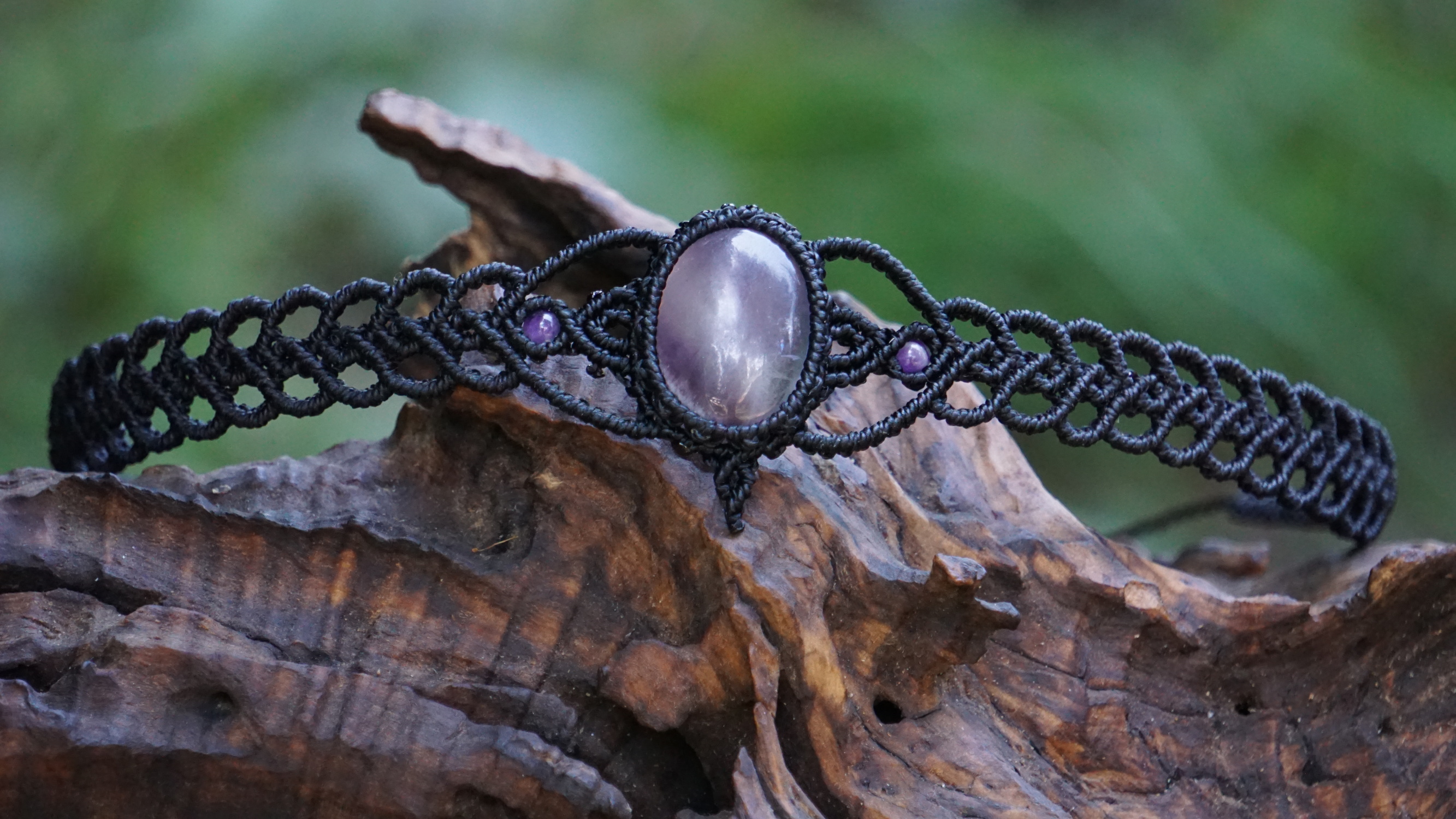 Šperk vznikl technikou micro macramé, což uzlíkování pouze za pomoci šikovných prstů a fantasie. Používám brazilské povoskované šňůrky, které jsou jedny z nejkvalitnějších na světě pro svou pevnost a stálobarevnost. Zapínání je na utahování, velikost je tedy univerzální. Barva nitek je černá, kámen uprostřed ametyst (přírodní, nedobarvovaný), korálky uprostřed jsou ametystové, na koncích je fluorit (též přírodní).