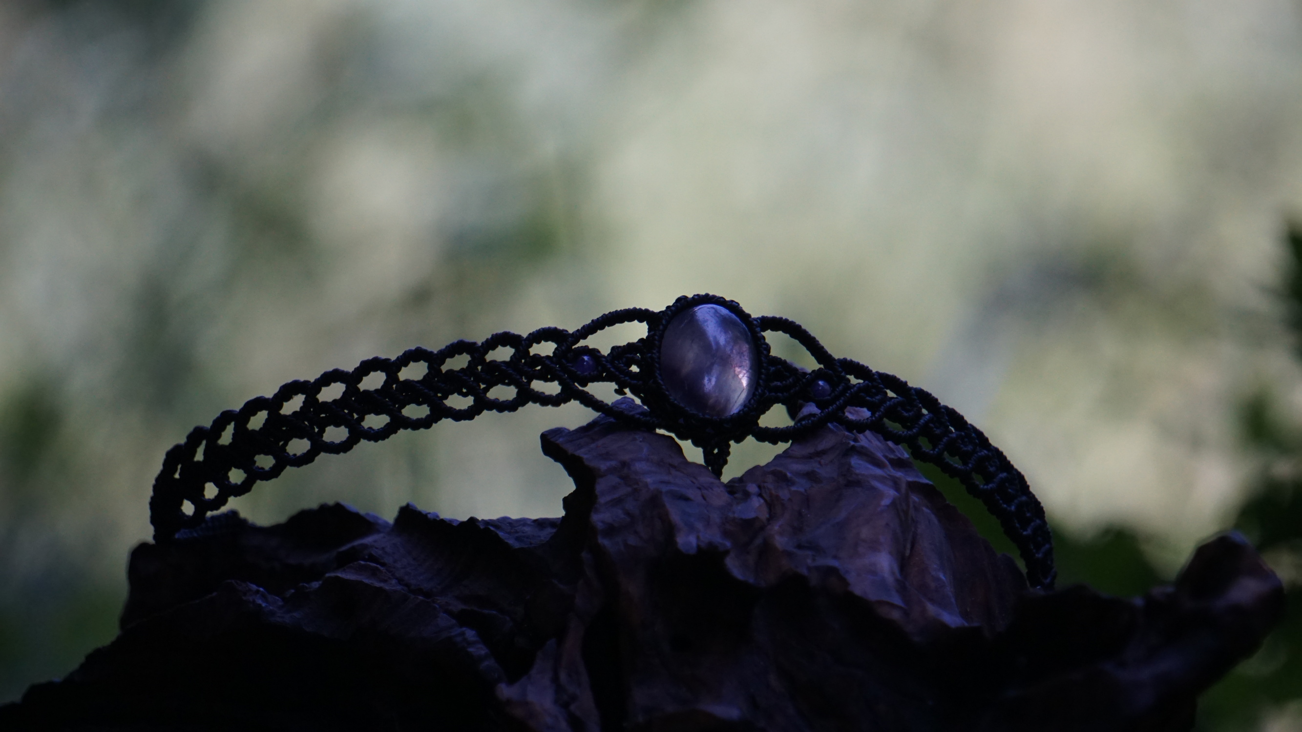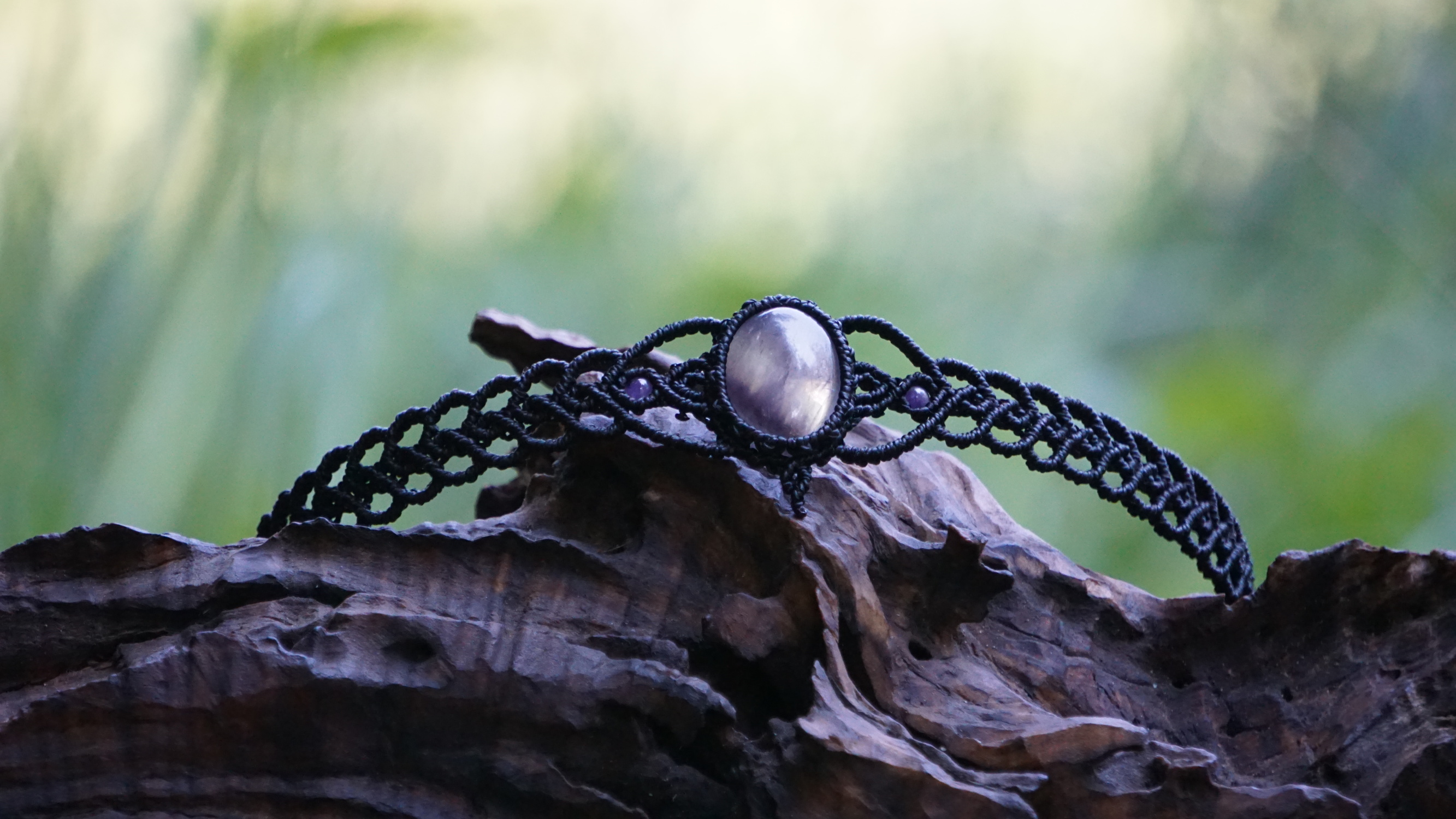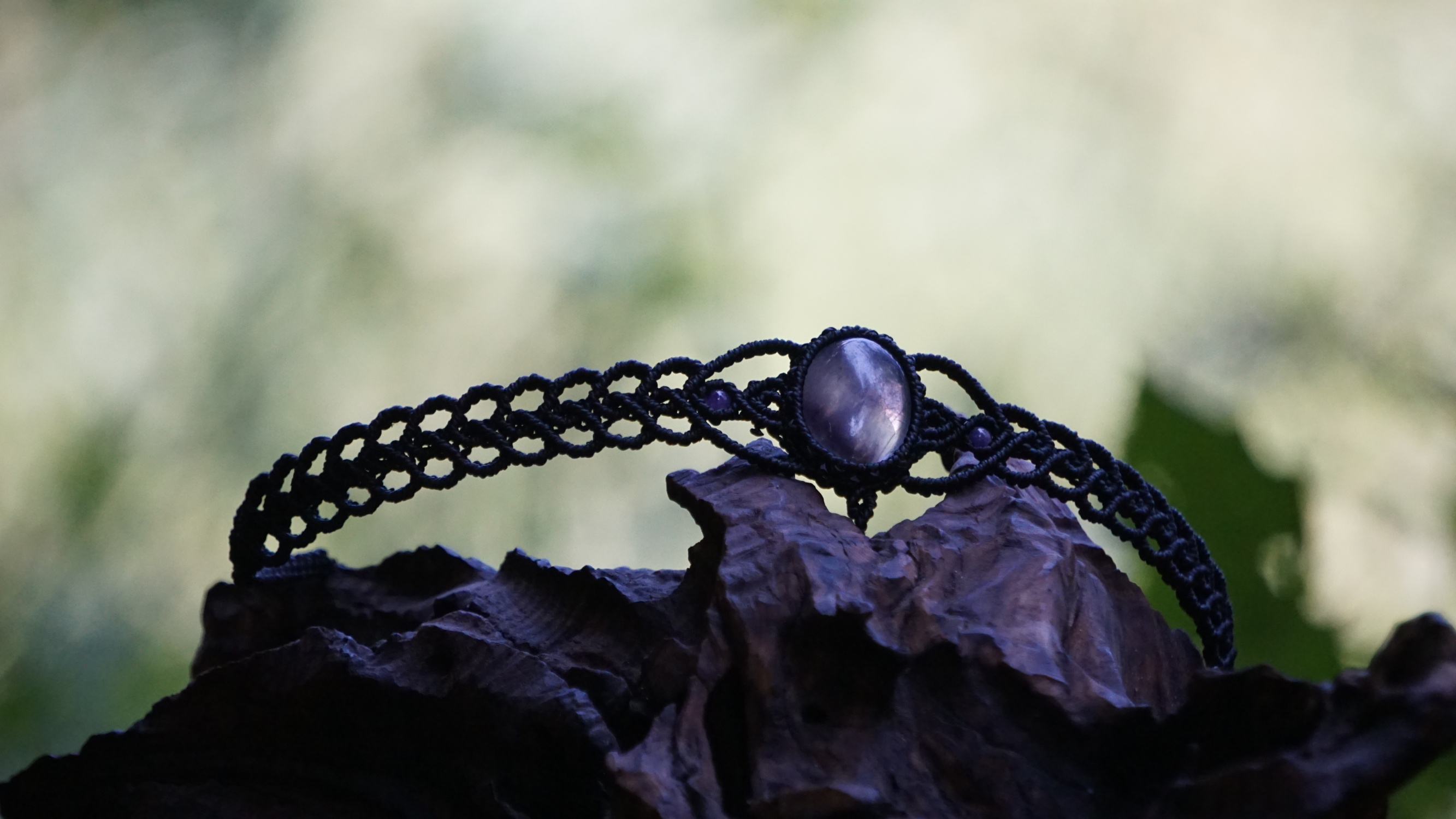 Šperk vznikl technikou micro macramé, což uzlíkování pouze za pomoci šikovných prstů a fantasie. Používám brazilské povoskované šňůrky, které jsou jedny z nejkvalitnějších na světě pro svou pevnost a stálobarevnost. Zapínání je na utahování, velikost je tedy univerzální. Barva nitek je černá, kámen uprostřed ametyst (přírodní, nedobarvovaný), korálky uprostřed jsou ametystové, na koncích je fluorit (též přírodní).