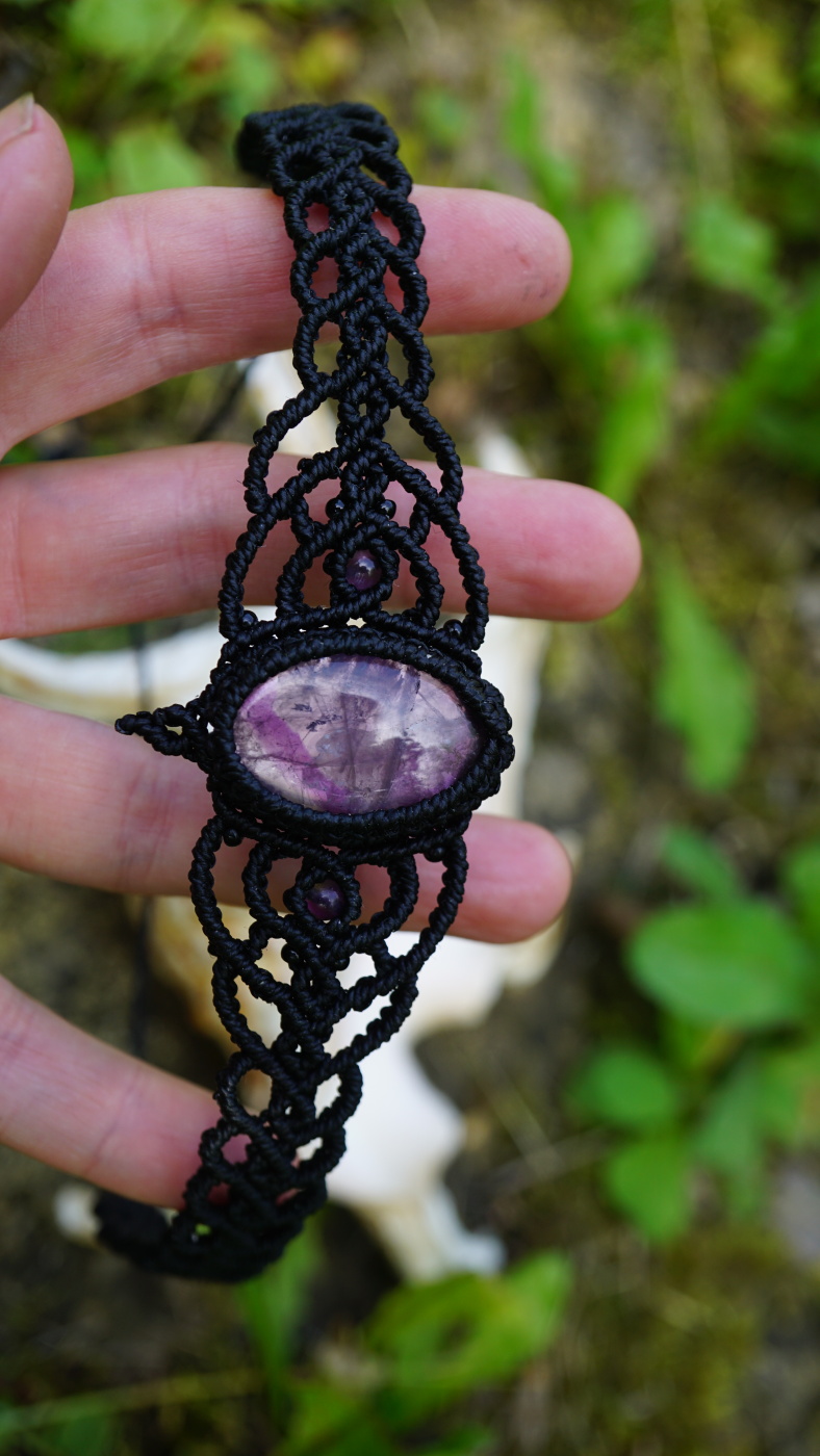 Šperk vznikl technikou micro macramé, což uzlíkování pouze za pomoci šikovných prstů a fantasie. Používám brazilské povoskované šňůrky, které jsou jedny z nejkvalitnějších na světě pro svou pevnost a stálobarevnost. Zapínání je na utahování, velikost je tedy univerzální. Barva nitek je černá, kámen uprostřed ametyst (přírodní, nedobarvovaný), korálky uprostřed jsou ametystové, na koncích je fluorit (též přírodní).