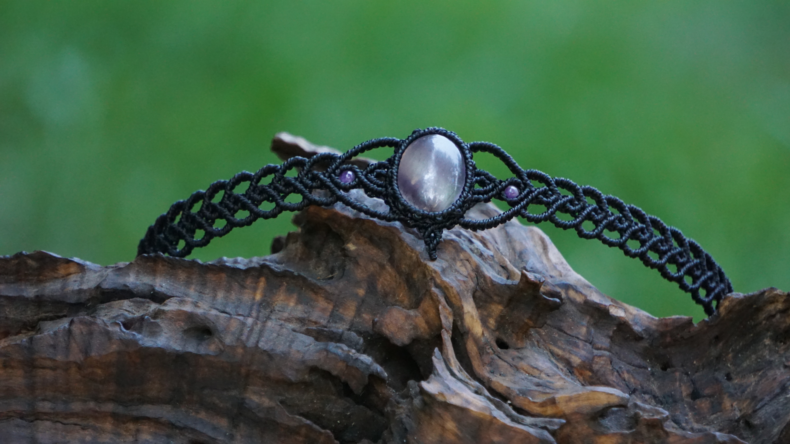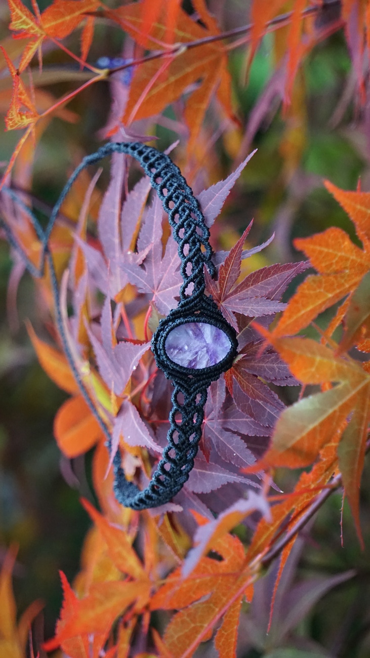 Šperk vznikl technikou micro macramé, což uzlíkování pouze za pomoci šikovných prstů a fantasie. Používám brazilské povoskované šňůrky, které jsou jedny z nejkvalitnějších na světě pro svou pevnost a stálobarevnost. Zapínání je na utahování, velikost je tedy univerzální. Barva nitek je černá, kámen uprostřed ametyst (přírodní, nedobarvovaný), korálky uprostřed jsou ametystové, na koncích je fluorit (též přírodní).