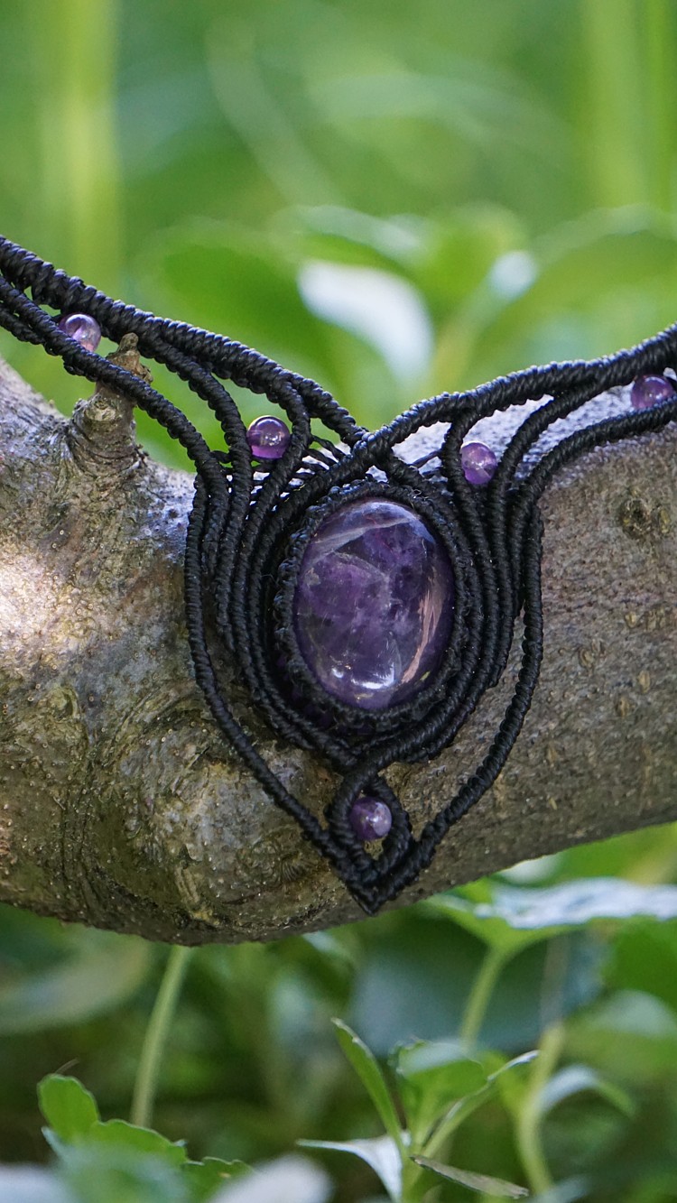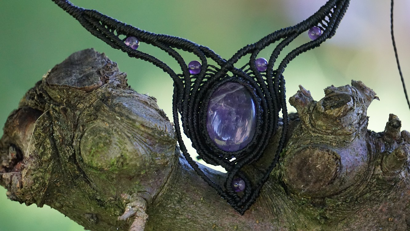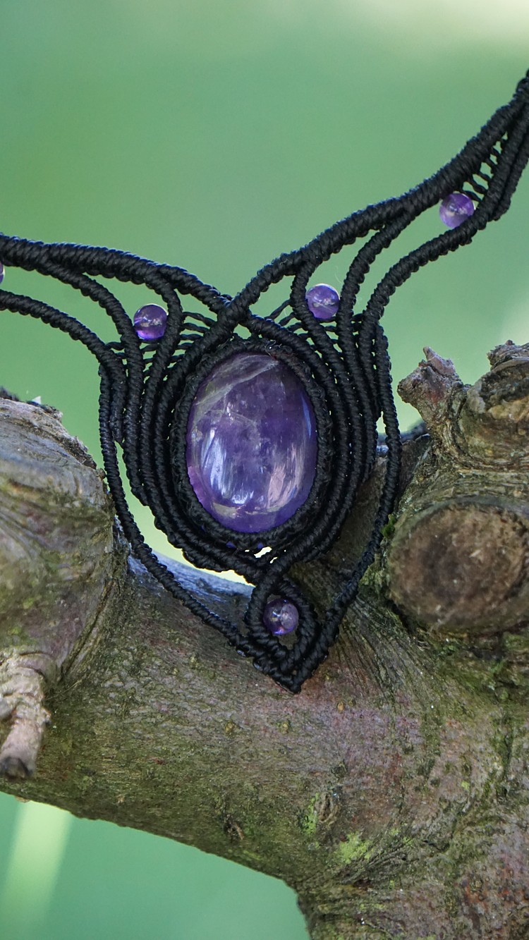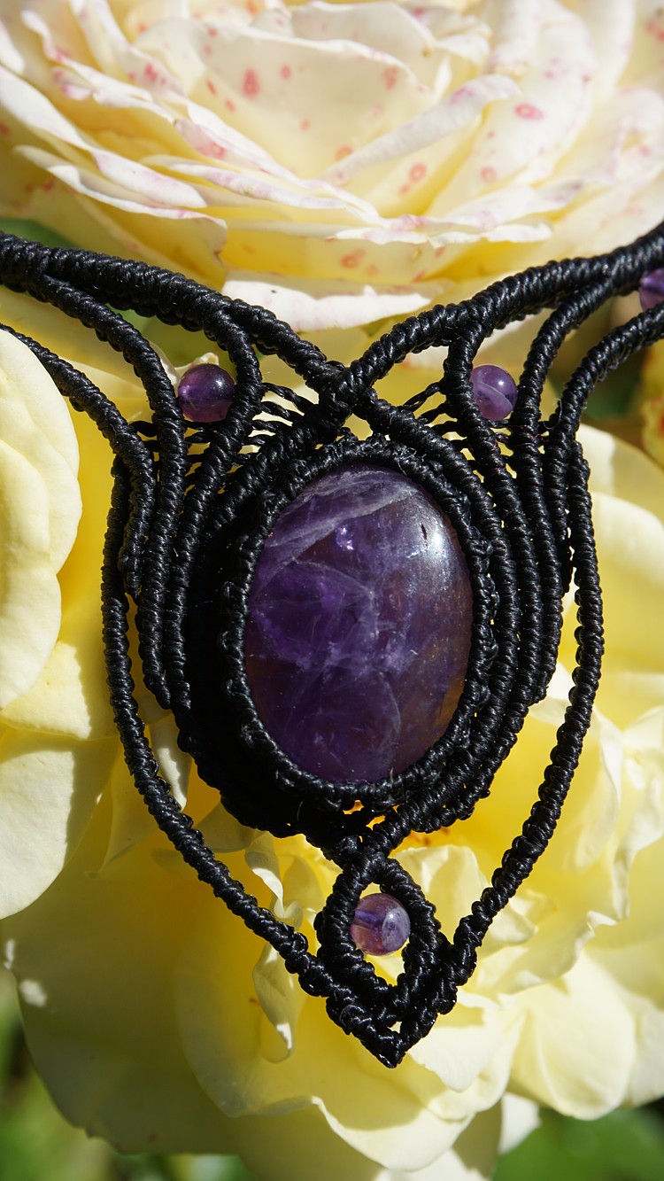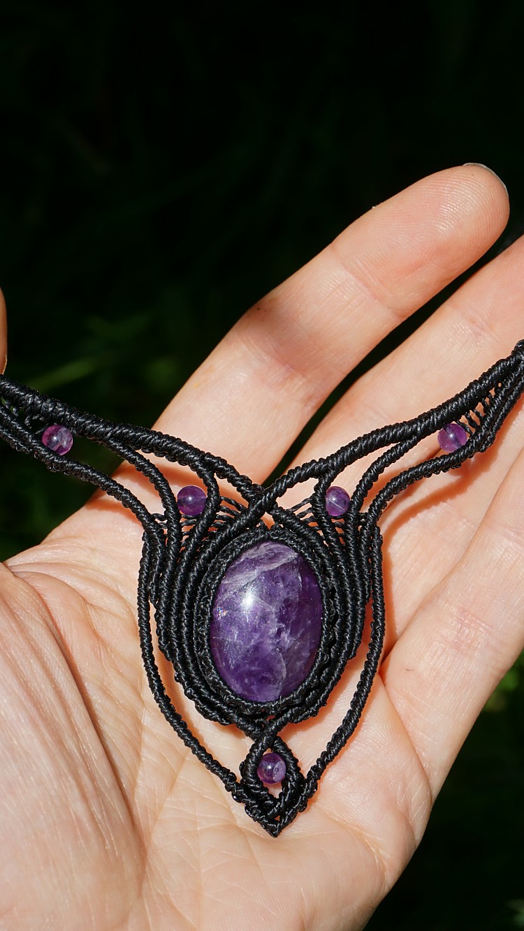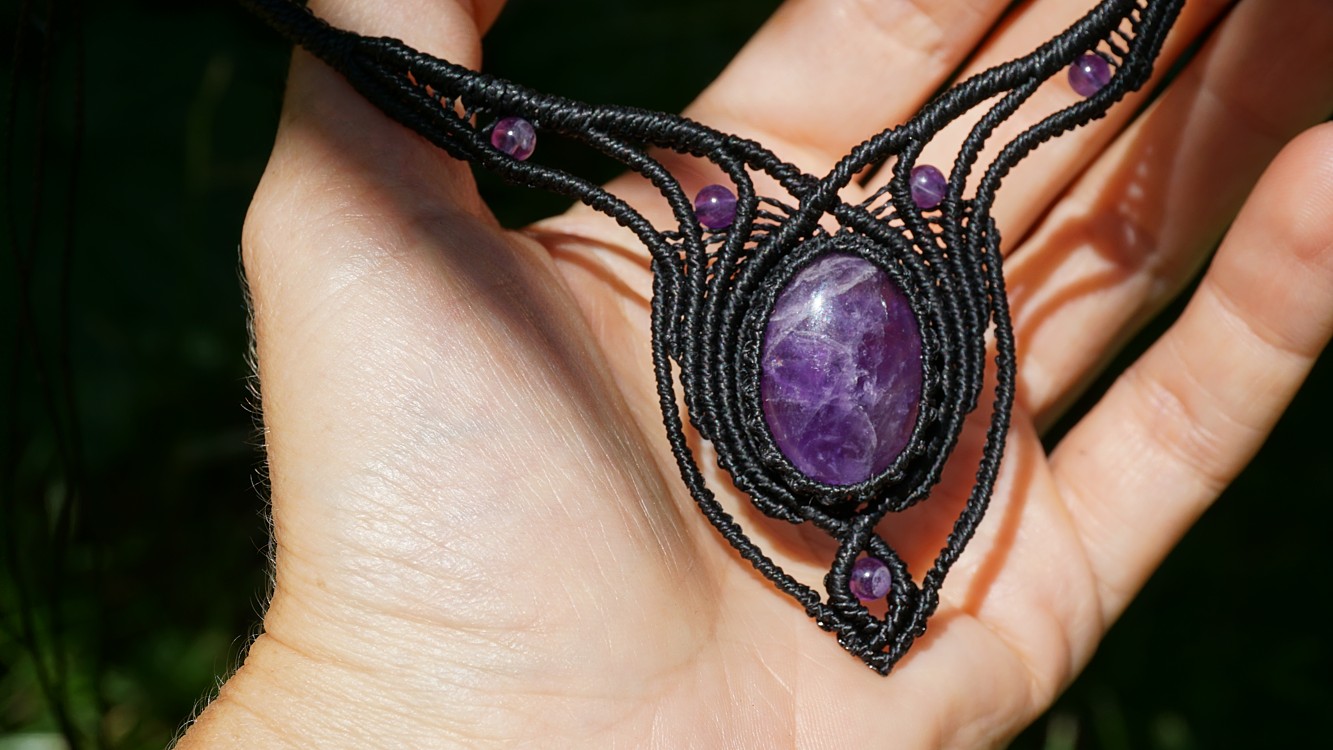 Náhrdelník je na utahování, takže též umožňuje různou délku závěsu. Boky náhrdelníku jsou tvarovatelné, můžete tedy i jemně upravit tvar podle své šíje. Velikost ametystů je 25 x 18 mm.