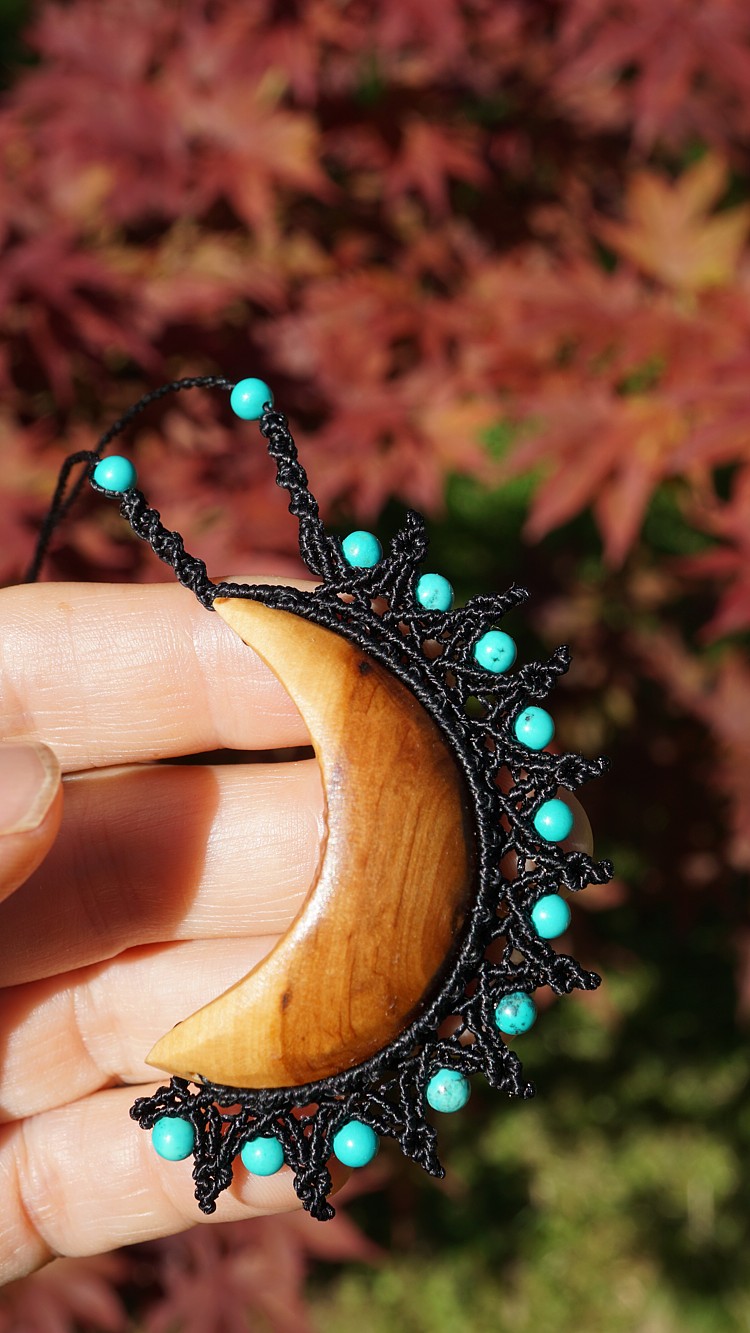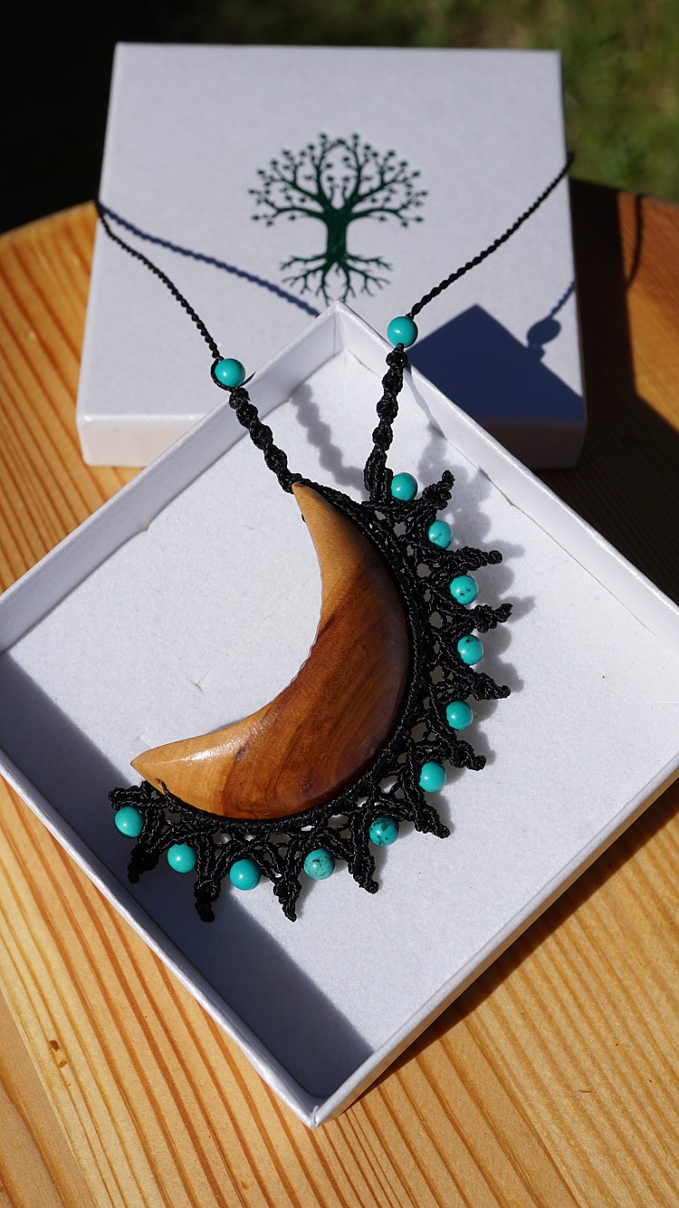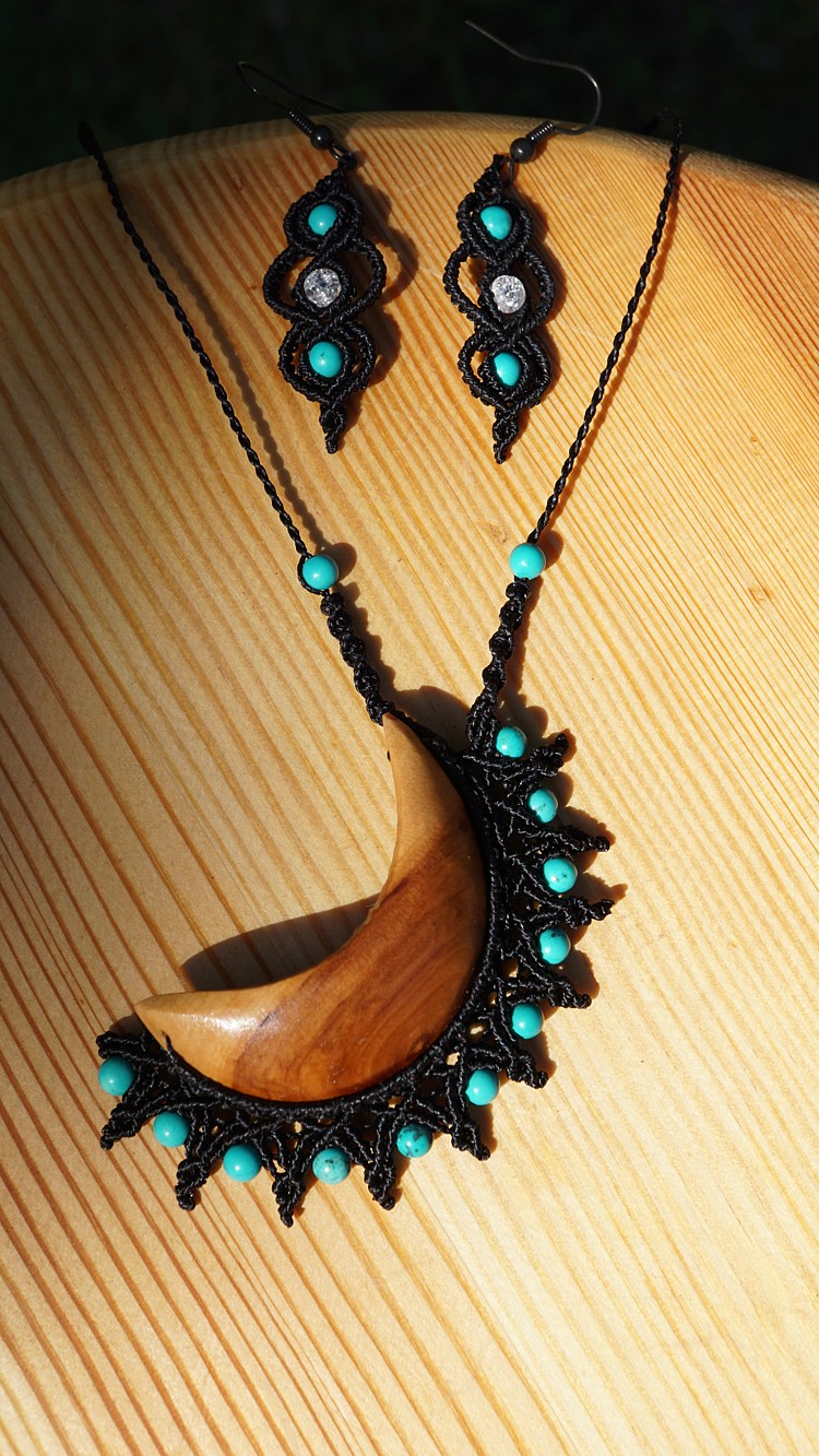 Šperk vznikl technikou micro macramé, což uzlíkování pouze za pomoci šikovných prstů a fantasie. Používám brazilské povoskované šňůrky velmi tenké a jemné (jako povoskovaná režná nit), které jsou jedny z nejkvalitnějších na světě pro svou pevnost a stálobarevnost.