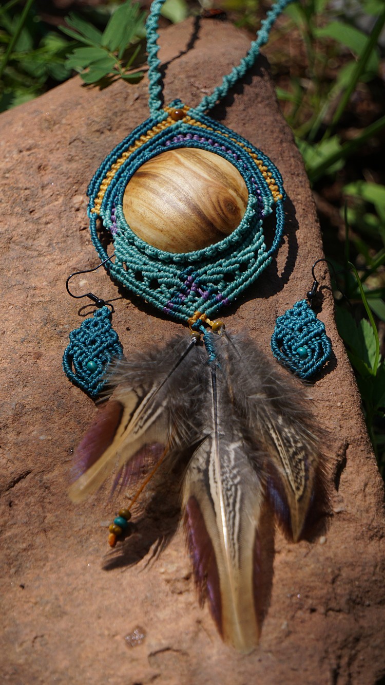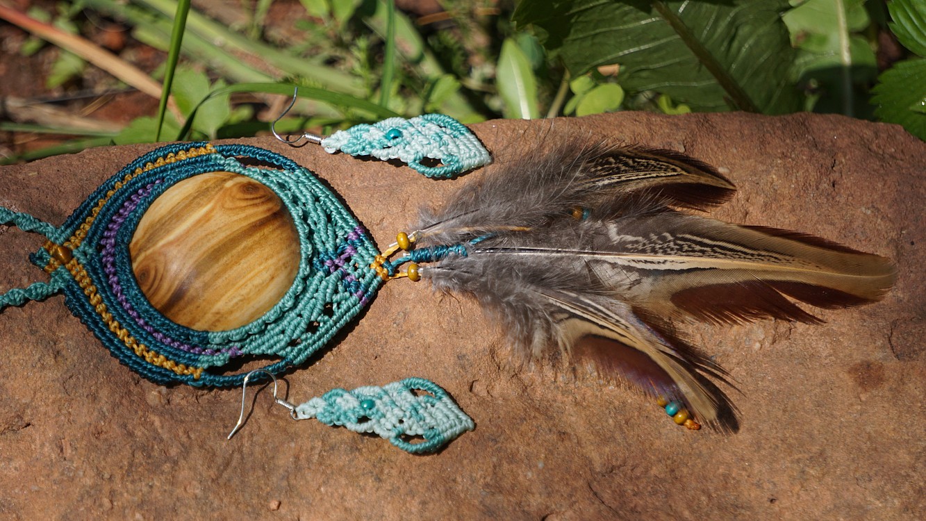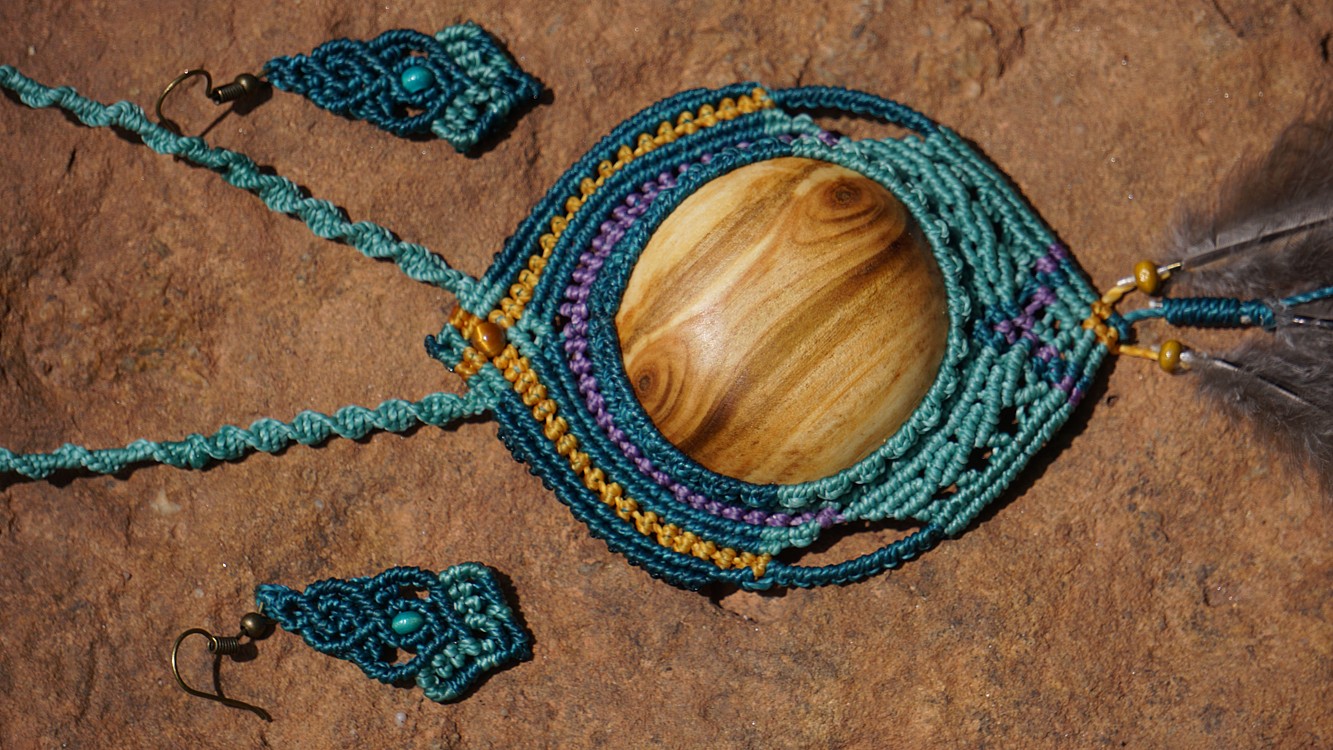 Brazilské povoskované šňůrky jsou v odstínech tyrkysové barvy doplněné teplou žlutou a fialovou, korálky jsou dřevěné. Technika se jmenuje micro macramé, což je v podstatě vázání uzlů. Takovýto šperk vzniká několik hodin (spíš dní).