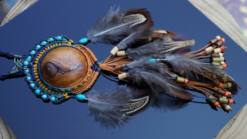 Brazilské povoskované šňůrky jsou v zemitých barvách, korálky jsou z minerálů (tyrkys v čelence) a dřevěné (ohon). Technika se jmenuje micro macramé (vázání uzlů), je to umění bez háčků, drátků a lepidel. Zkrátka jen šikovné prsty a dřevo.