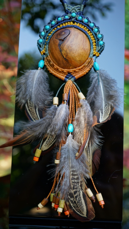 Brazilské povoskované šňůrky jsou v zemitých barvách, korálky jsou z minerálů (tyrkys v čelence) a dřevěné (ohon). Technika se jmenuje micro macramé (vázání uzlů), je to umění bez háčků, drátků a lepidel. Zkrátka jen šikovné prsty a dřevo.