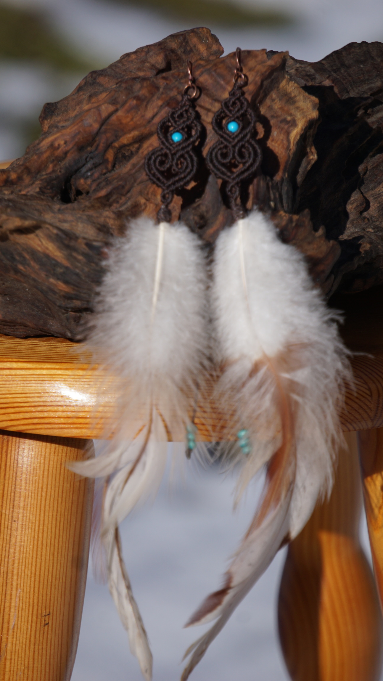 Barva nitek je temně hnědá. Minerální korálky jsou z tyrkenitu, pírka kohoutí.
