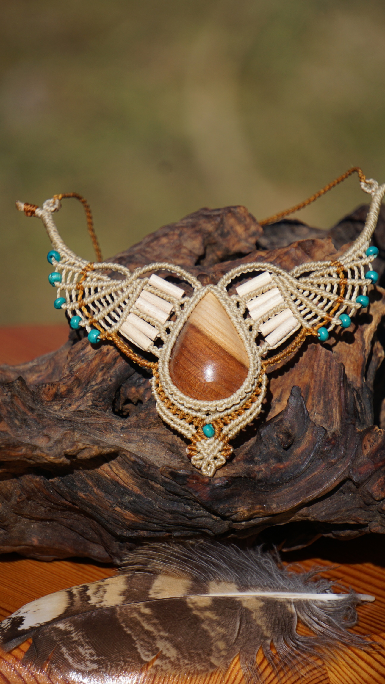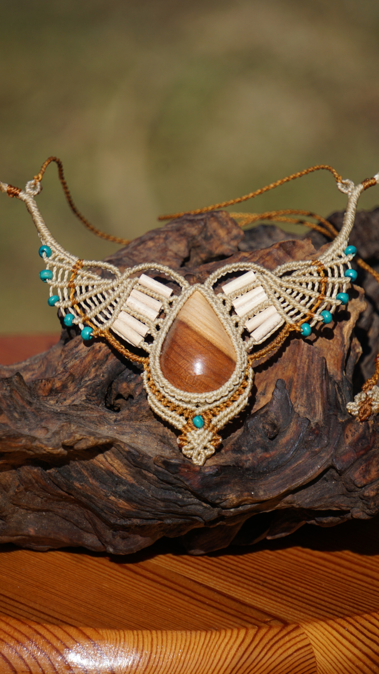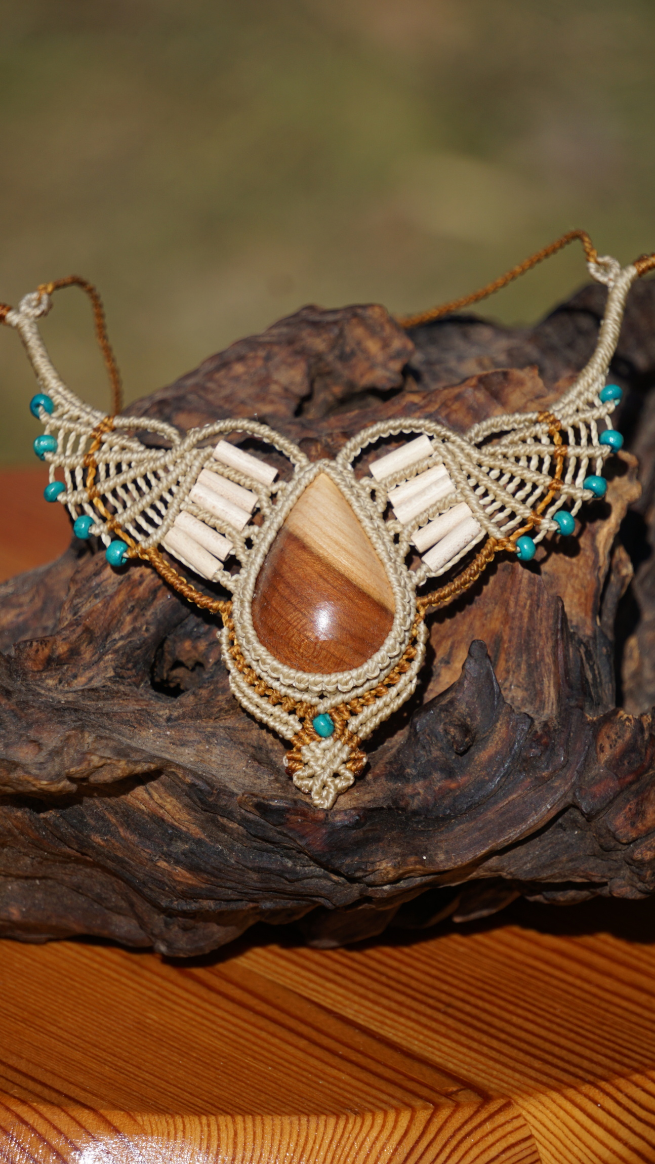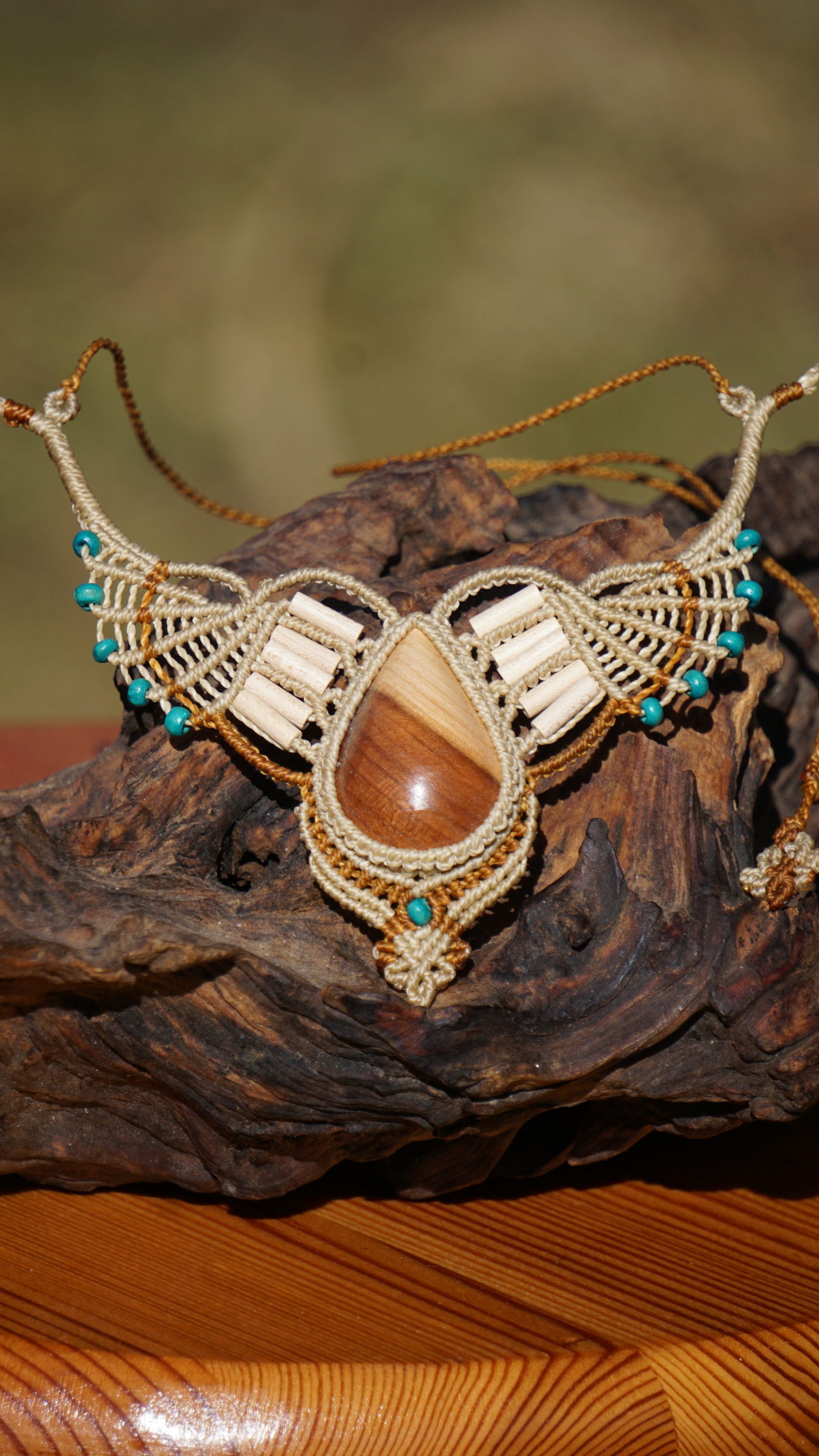 Šperk vznikl technikou micro macramé, což uzlíkování pouze za pomoci šikovných prstů a fantasie. Používám brazilské povoskované šňůrky, které jsou jedny z nejkvalitnějších na světě pro svou pevnost a stálobarevnost.