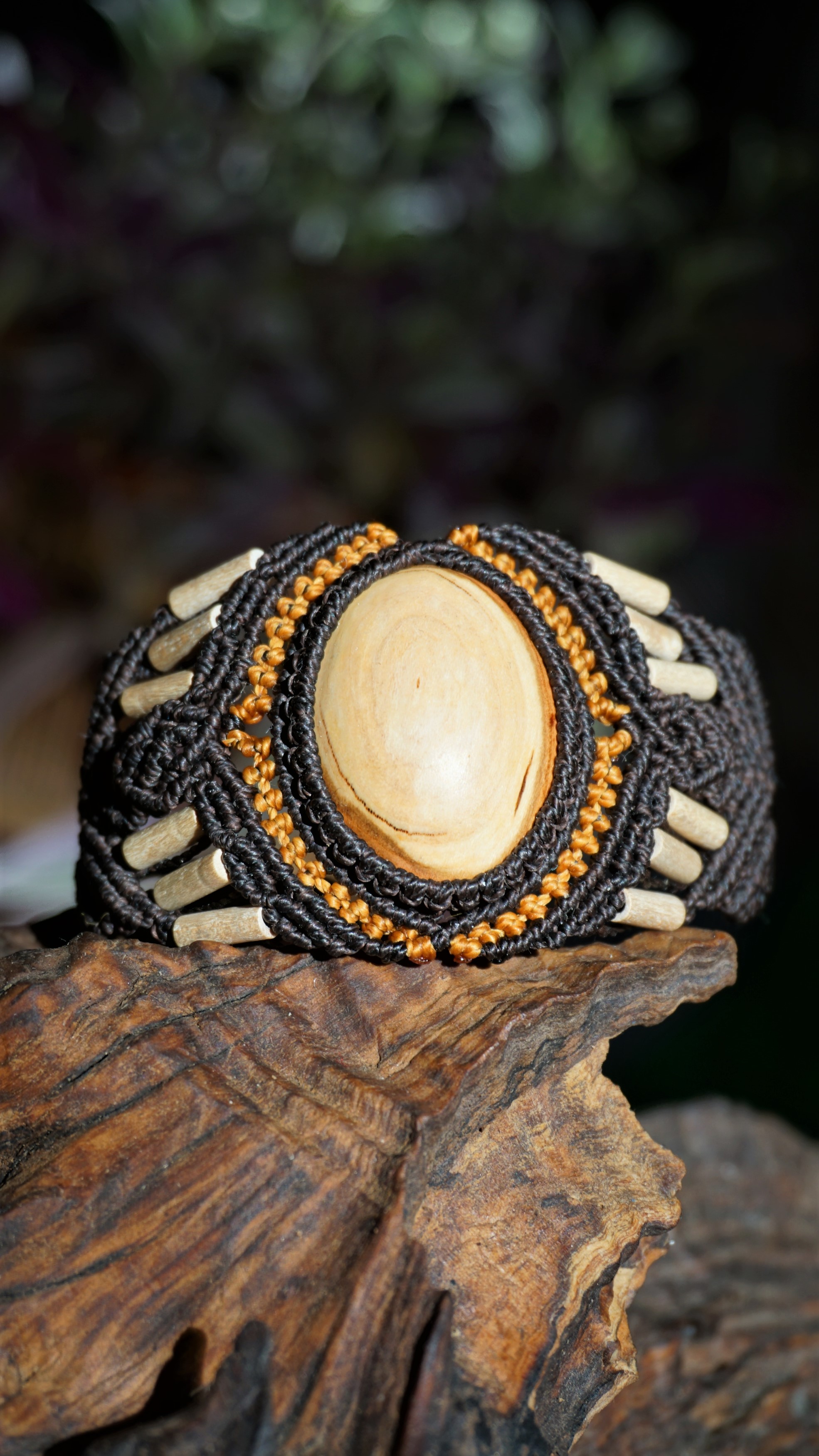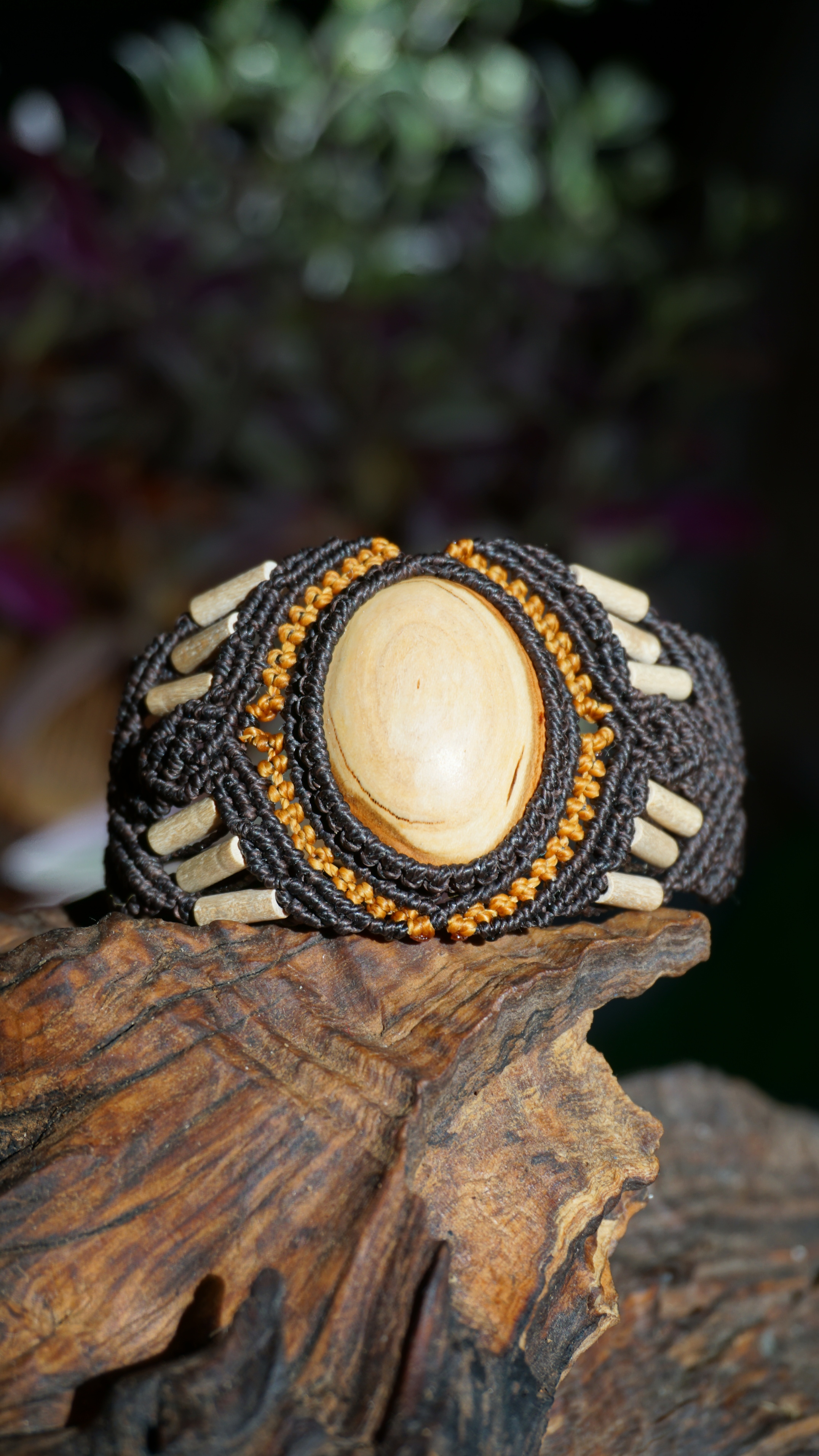 Dřevo uprostřed je ručně vyráběno v domácí dílně od kmene (mým partnerem), vybrušováno, ošetřeno směsí olejů a vosků. Výhodou dřeva je absorbování vonných olejů. Pokud si na spodní stranu šperku kápnete esenciální olej s vaší osobní vůní, proměníte svůj šperk v nositele příjemého aroma nejen pro vás, ale i pro vaše okolí ve velmi jemné a přitažlivé podobě. Stačí 1 kapka za den (týden), podle kvality esence :-). Centimetrová kostička dřeva má totiž v sobě v podobě cestiček a průduchů plochu o velikosti fotbalového stadionu. Vaše kůže olej zahřívá a proto je esence voňavá velmi dlouho.