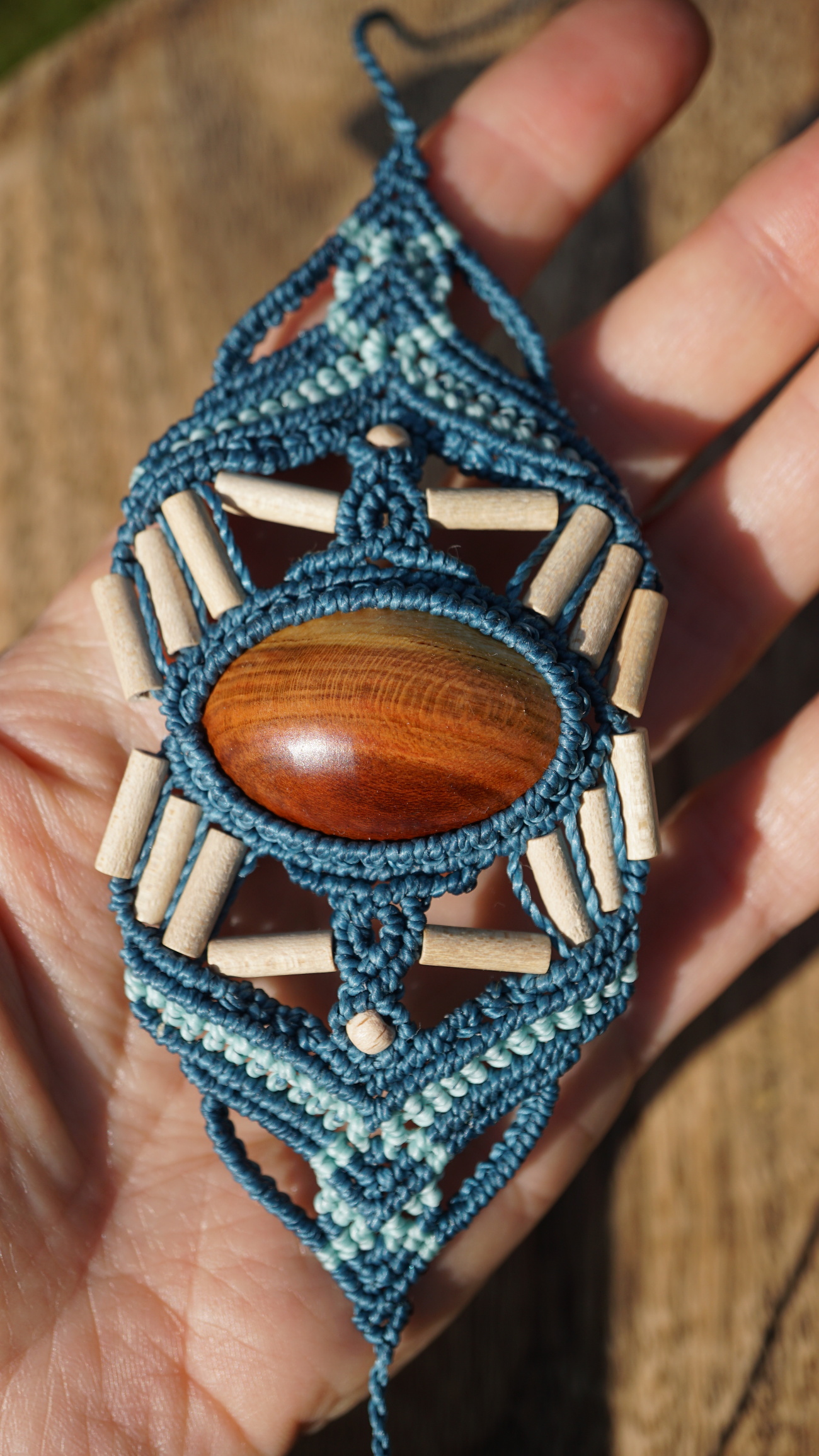 Barva šňůrek je ve světle a tmavě tyrkysové barvě, doplněno dřevěnými korálky.