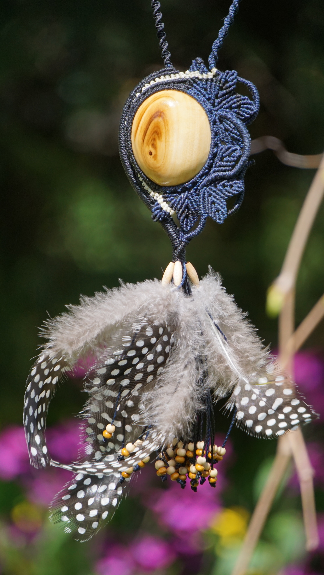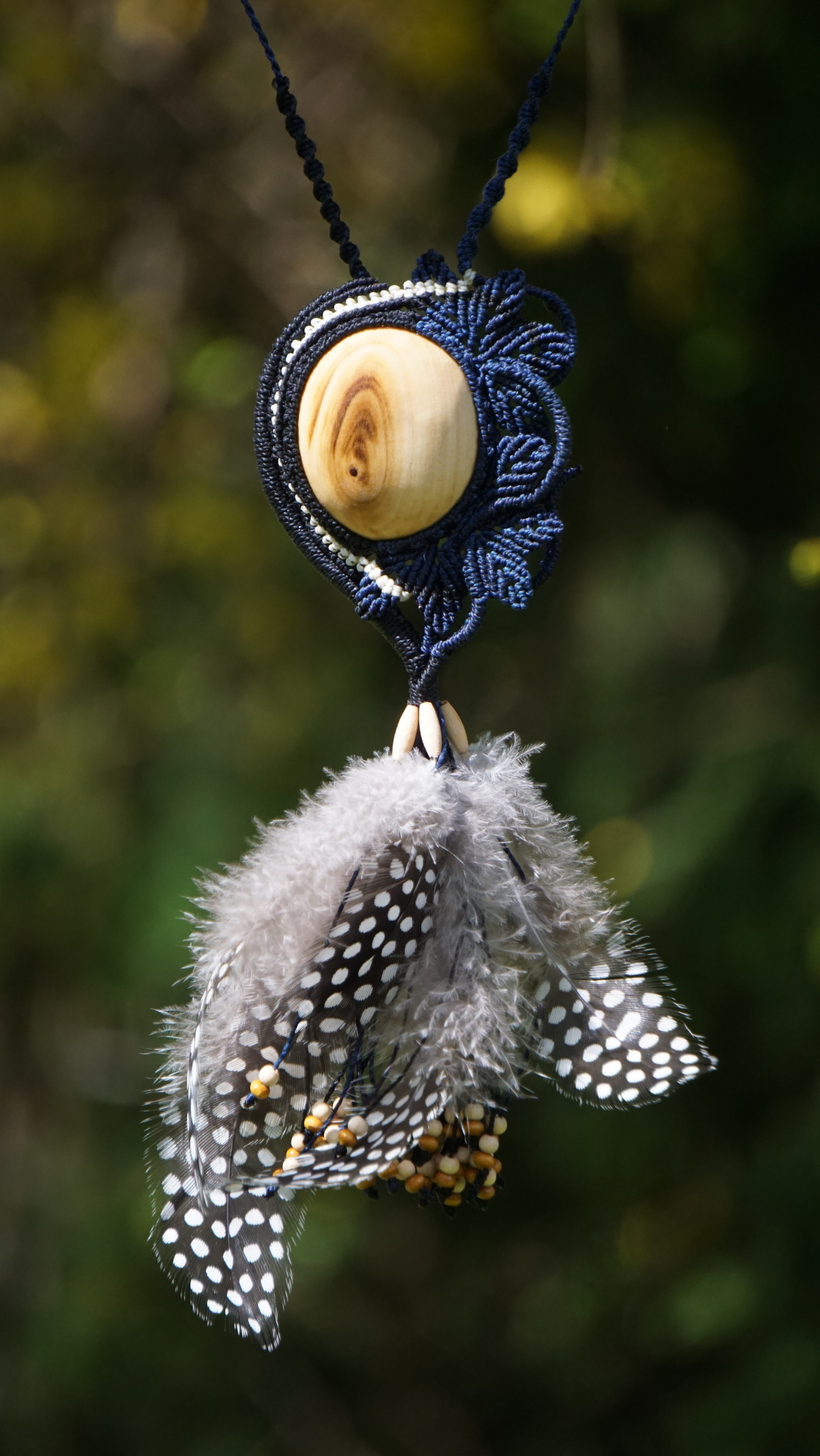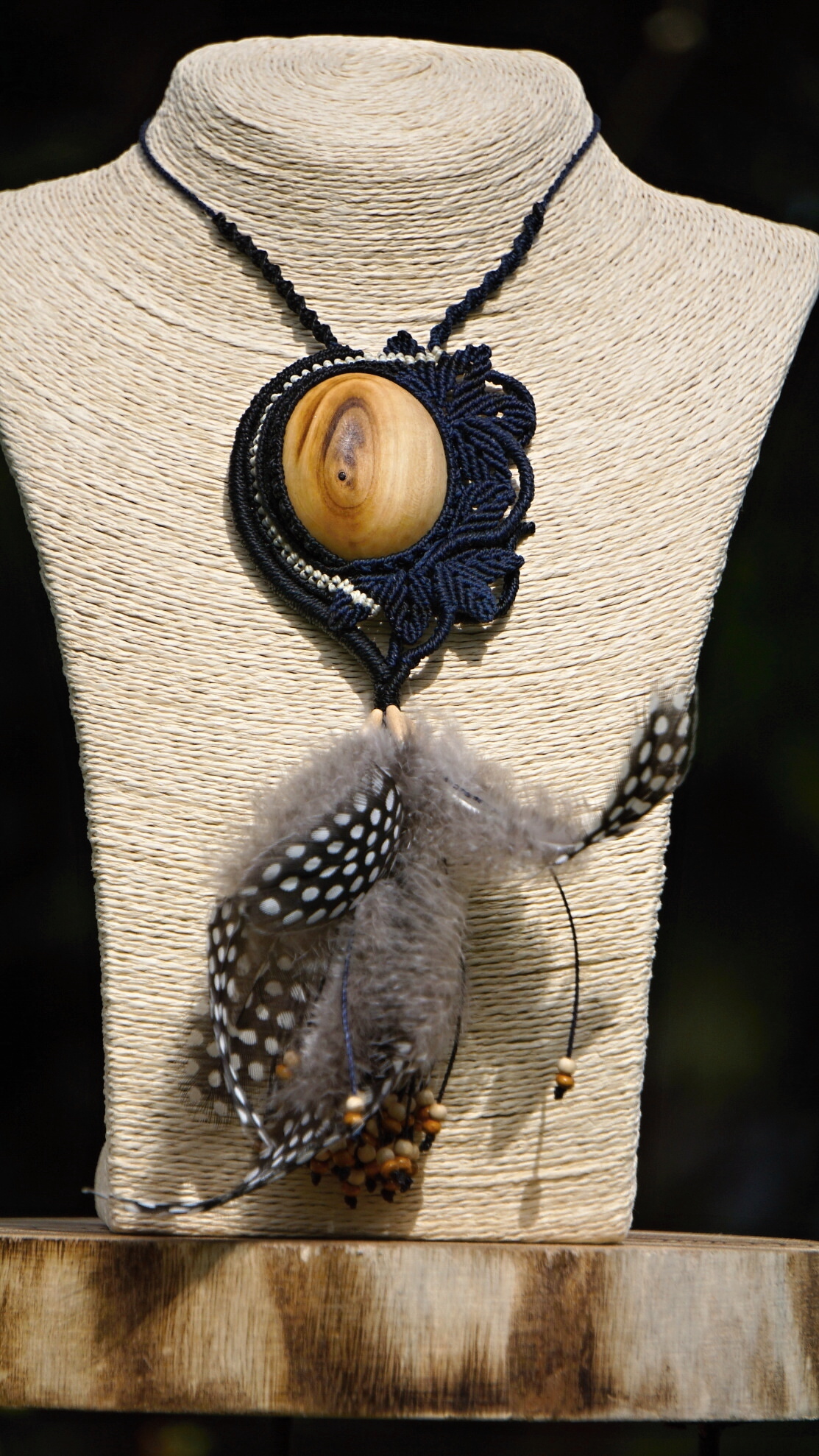 Brazilské povoskované šňůrky jsou v černé a temně modré barvě, korálky jsou dřevěné. Technika se jmenuje micro macramé, což je v podstatě vázání uzlů. Takovýto šperk vzniká několik hodin (spíš dní).