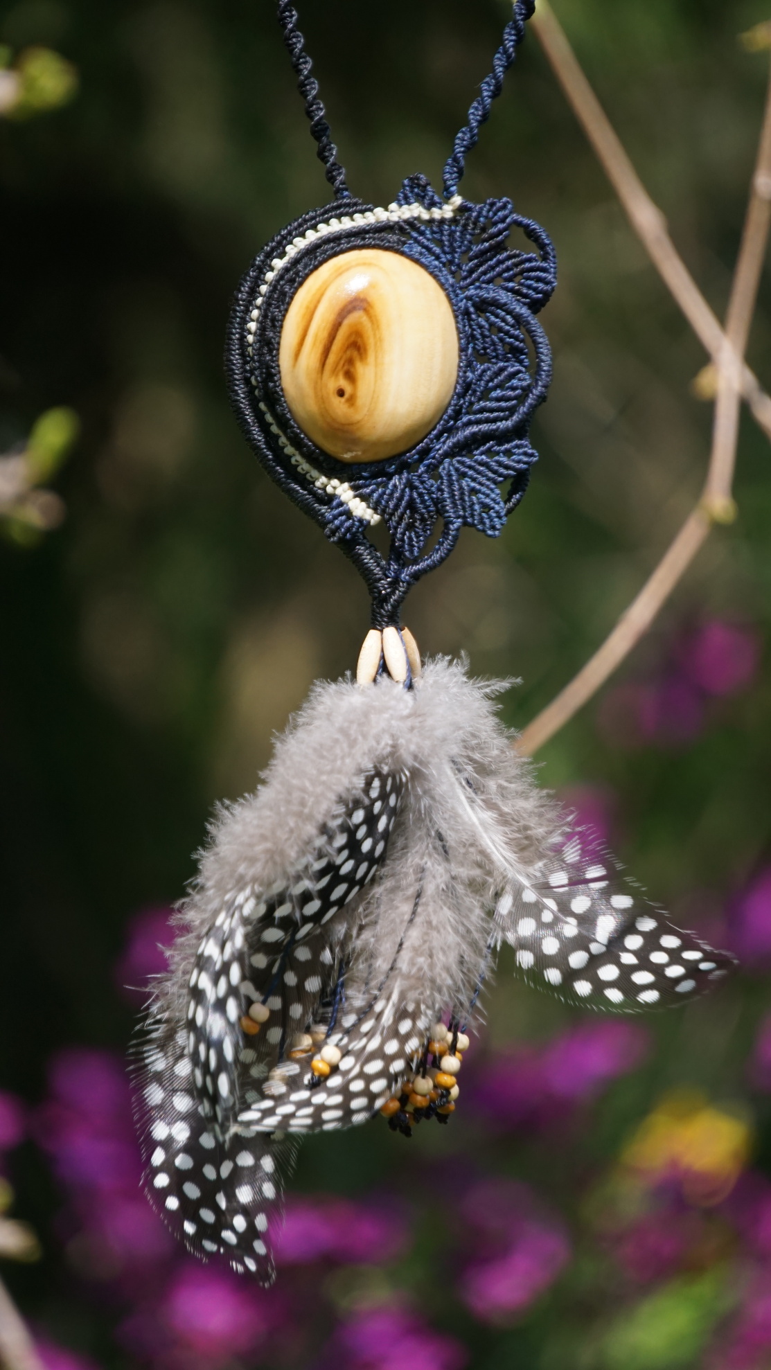 Brazilské povoskované šňůrky jsou v černé a temně modré barvě, korálky jsou dřevěné. Technika se jmenuje micro macramé, což je v podstatě vázání uzlů. Takovýto šperk vzniká několik hodin (spíš dní).