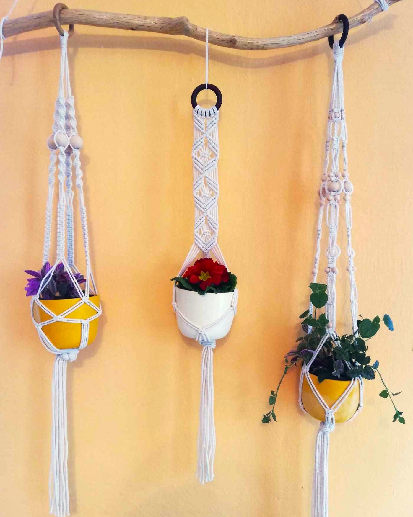 Závěs na květny je složený ze tří úchytů na malé květináče, které jsou zavěšené na dekorativní větvi. Je možné je též sudnat a použít samostatně. Ceny půjčovného je za celý komplet (bez květin a květináčů).