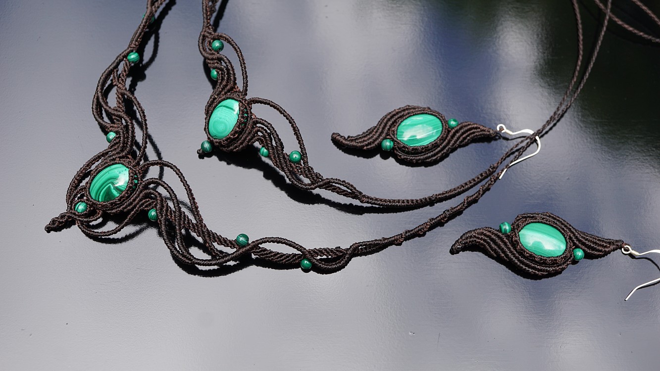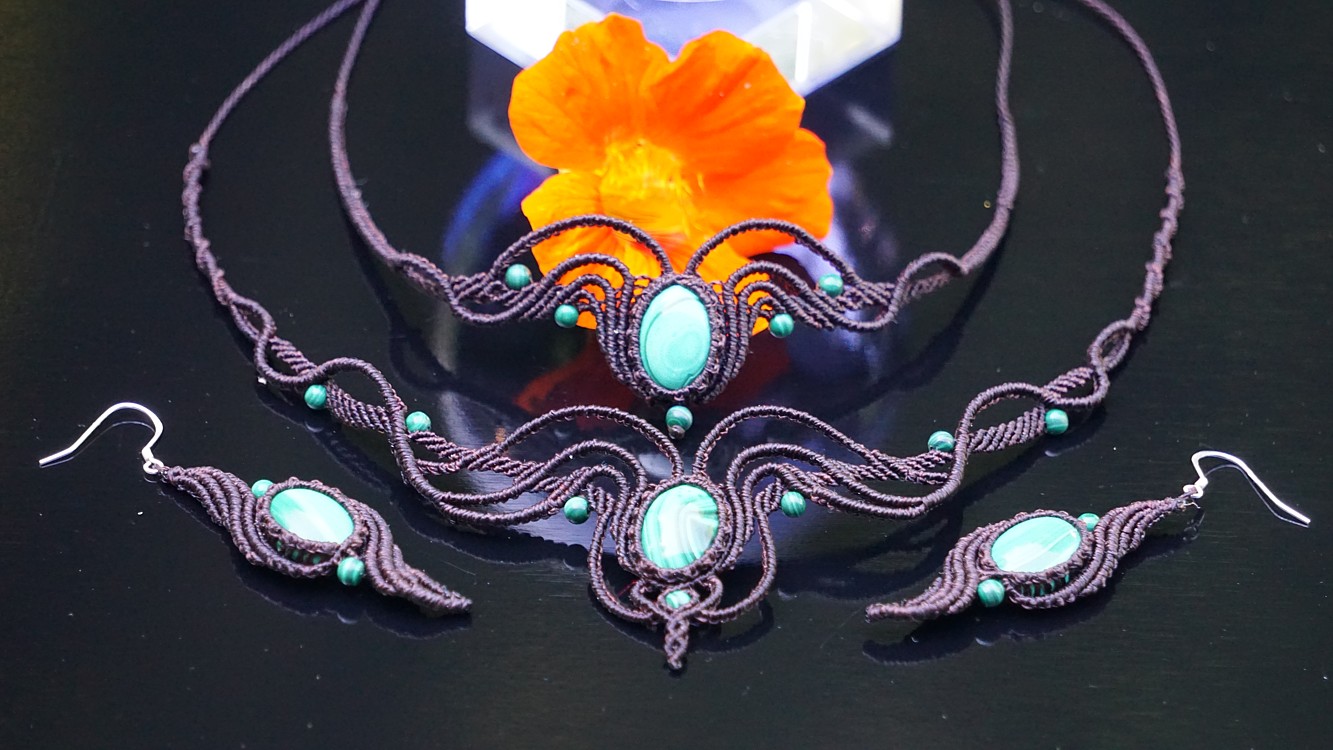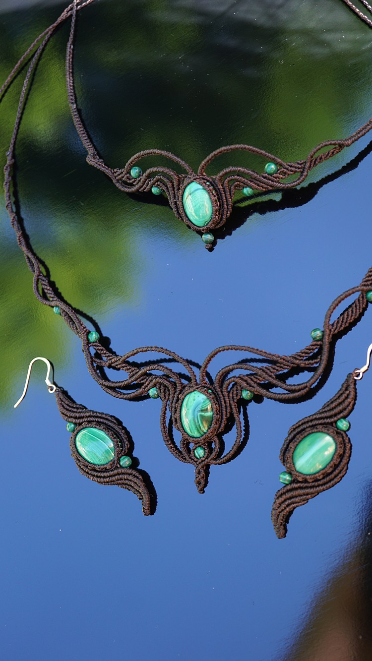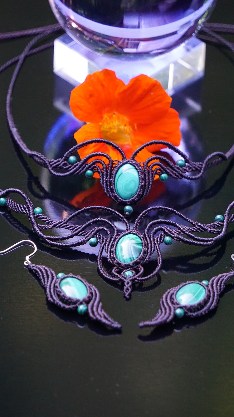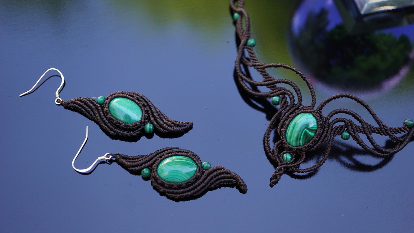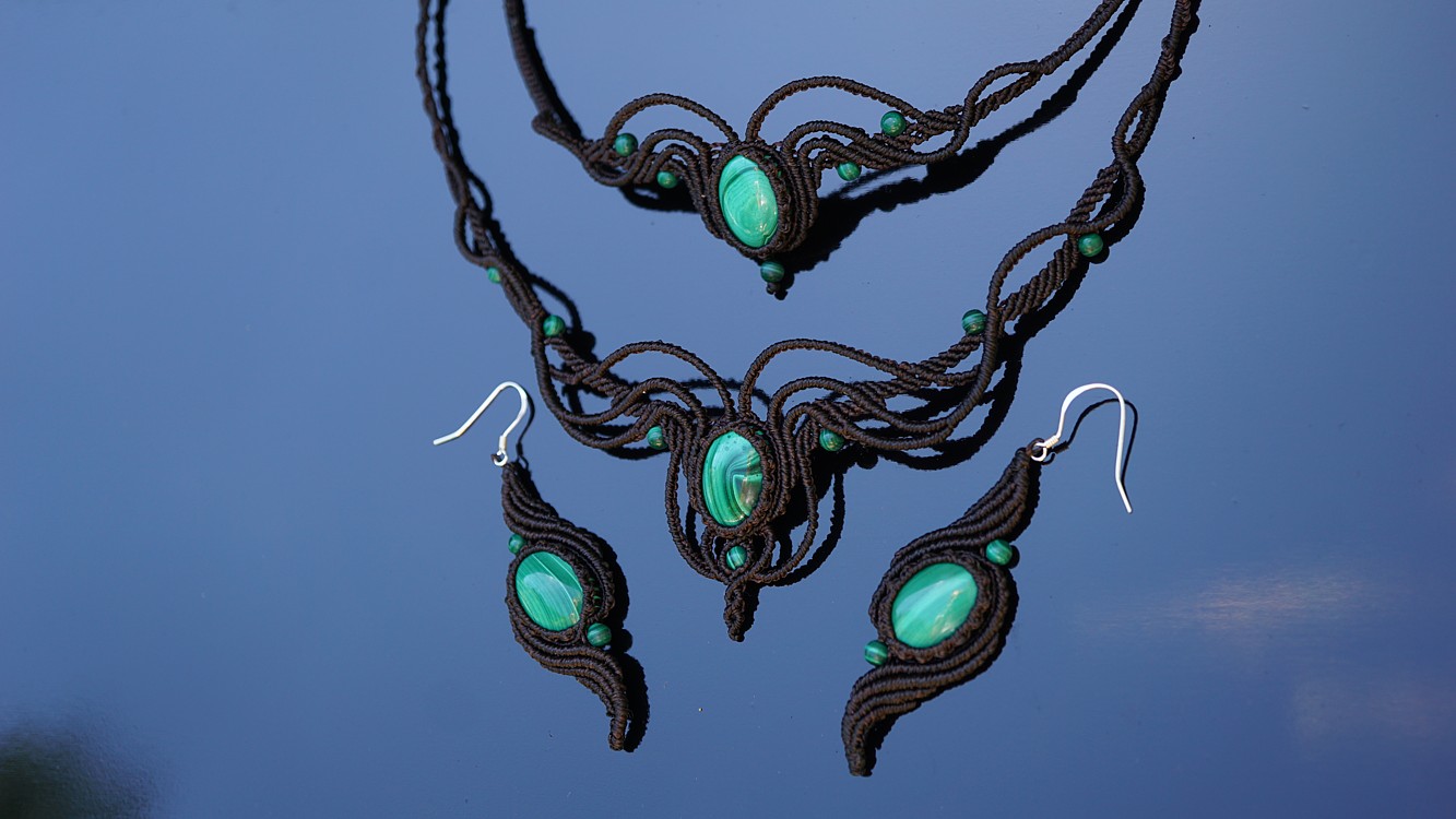 Do kolekce patří náhrdelník, čelenka a náušnice s háčkami ze stříbra. Malachity jsou 100% přírodní a nedobarvované (kameny i korálky). Technika šperku se jmenuje micro macramé a zde je použita ve velmi precizním jemném provedení z neobvykle tenkých brazilských povoskovaných šňůrek. Veliká zručnost, dlouholetá zkušenost, designová inspirace pocházející ze snění a lupa byly u vzniku této jedinenčé sady.