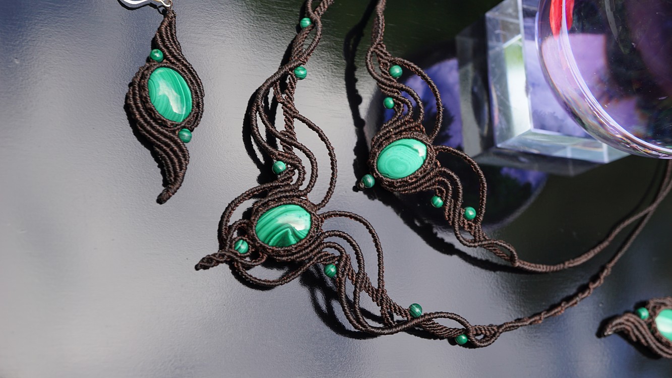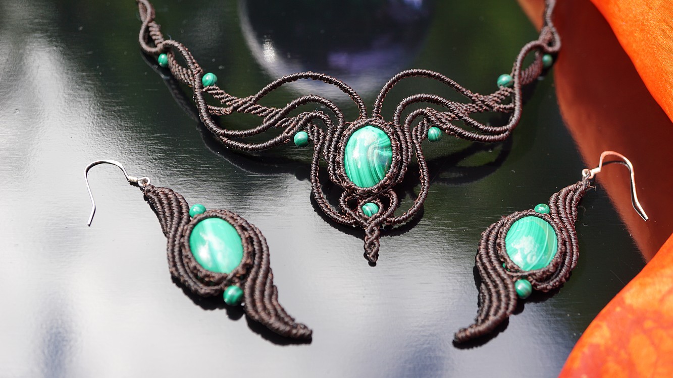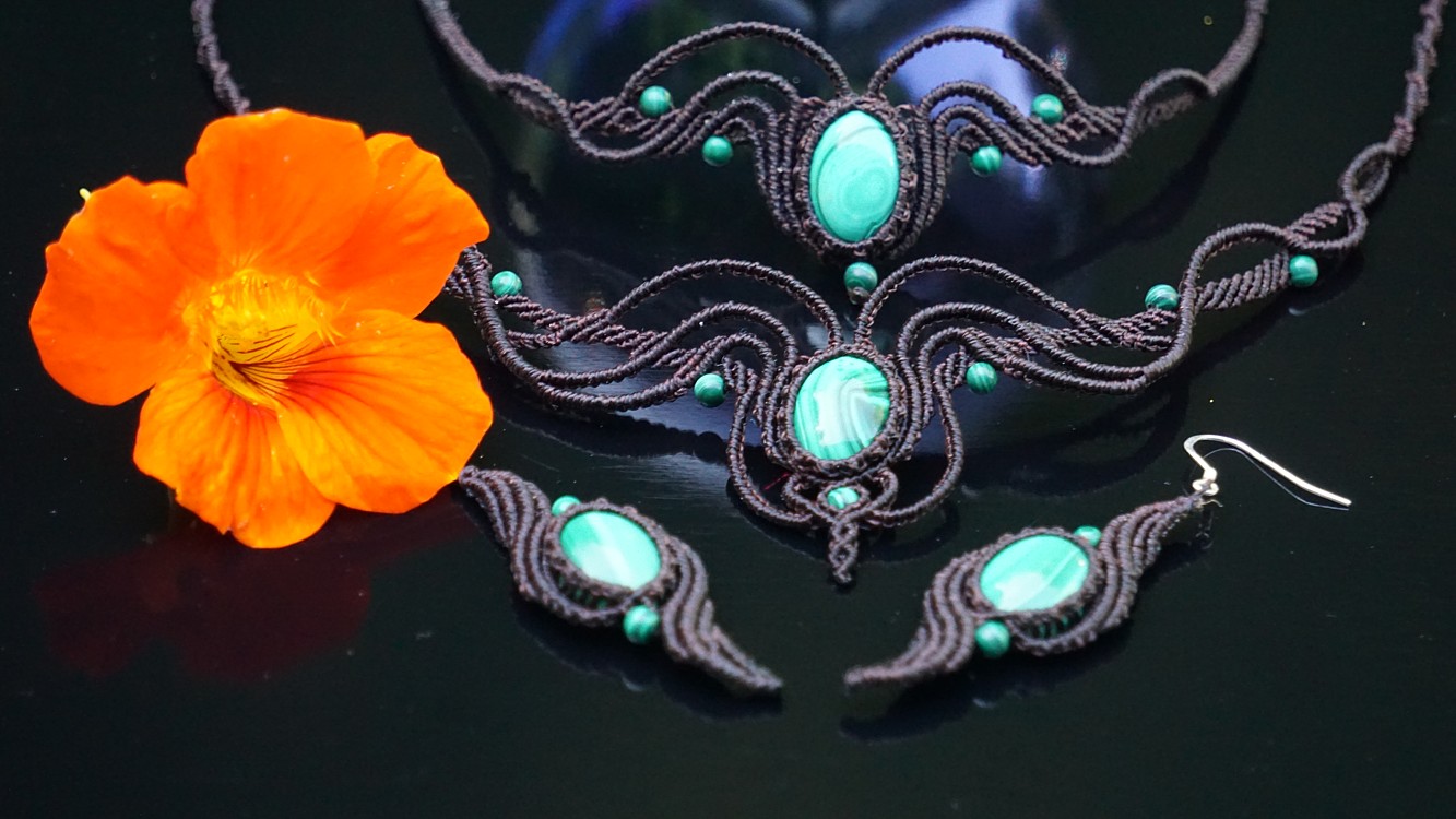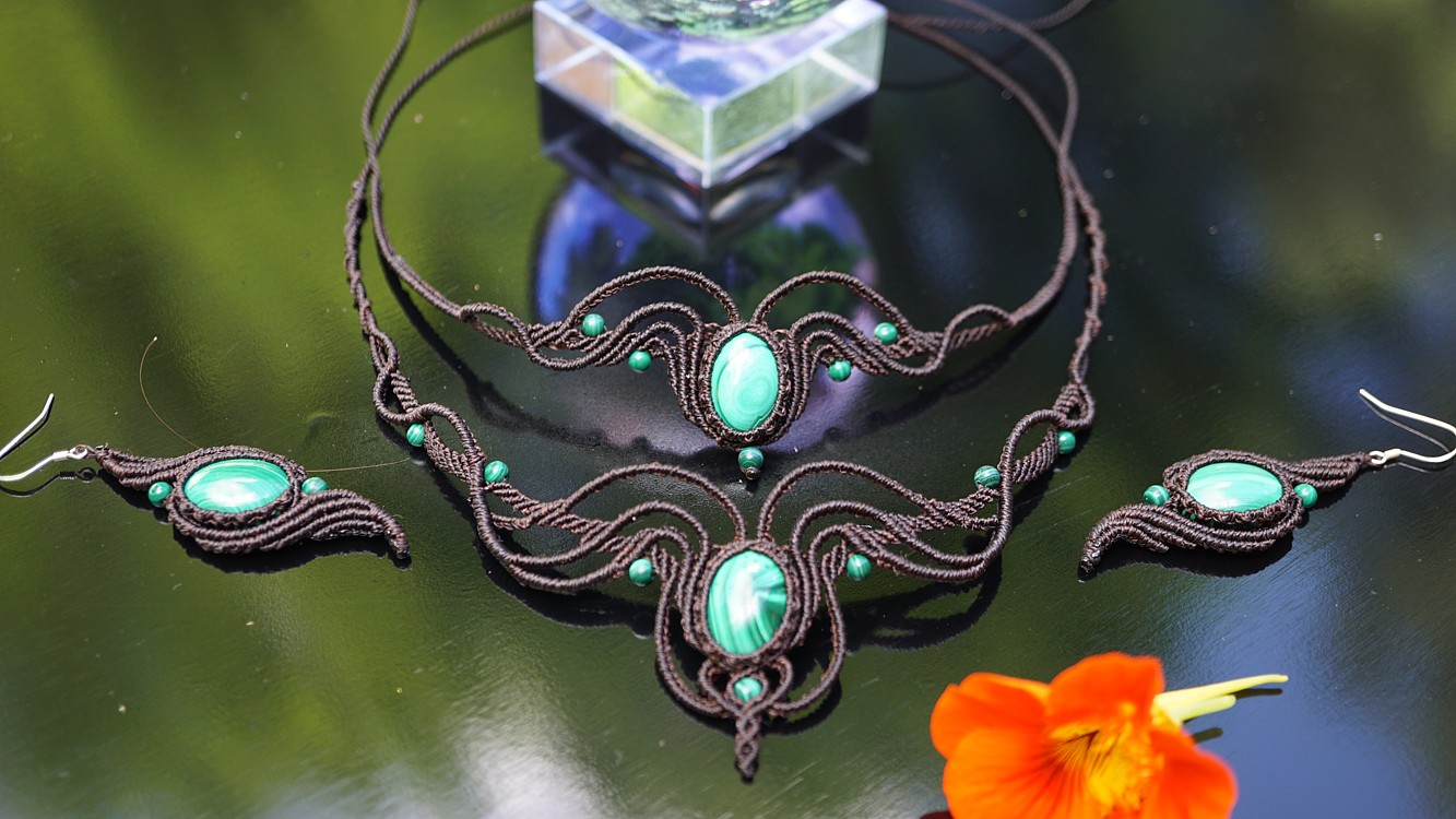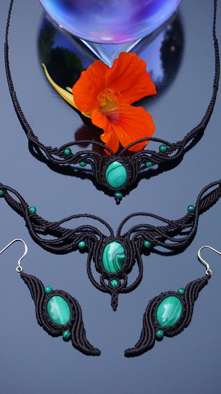 Do kolekce patří náhrdelník, čelenka a náušnice s háčkami ze stříbra. Malachity jsou 100% přírodní a nedobarvované (kameny i korálky). Technika šperku se jmenuje micro macramé a zde je použita ve velmi precizním jemném provedení z neobvykle tenkých brazilských povoskovaných šňůrek. Veliká zručnost, dlouholetá zkušenost, designová inspirace pocházející ze snění a lupa byly u vzniku této jedinenčé sady.