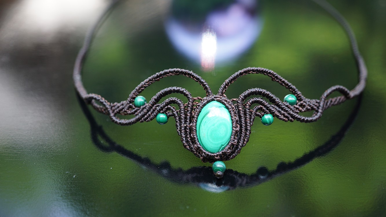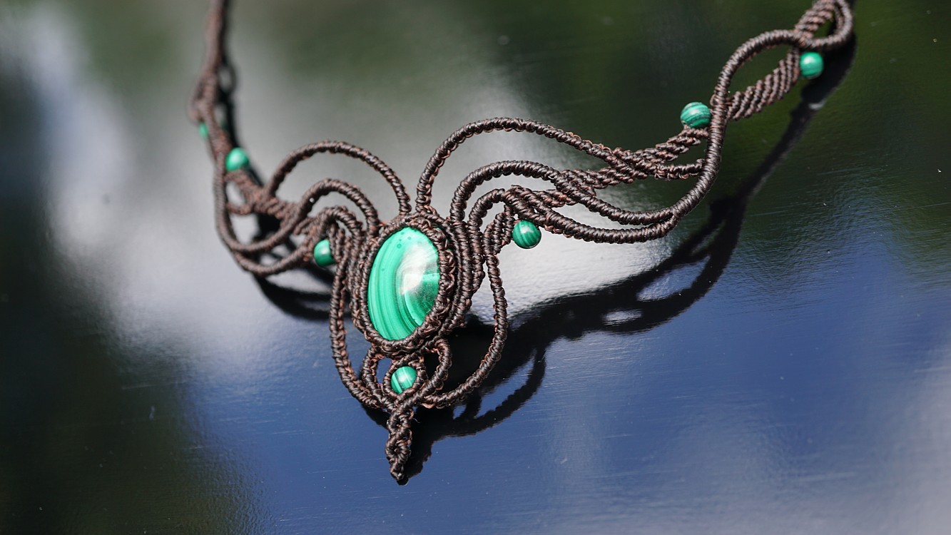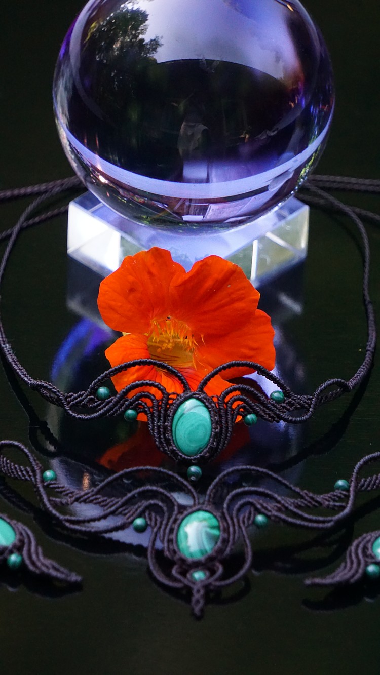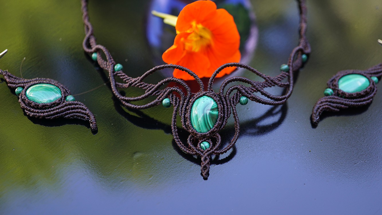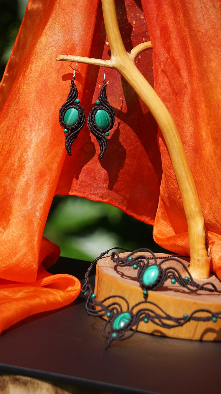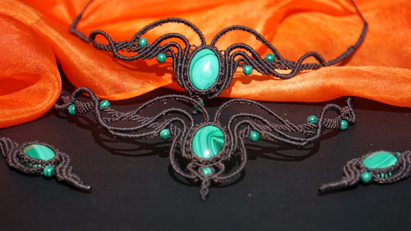 Do kolekce patří náhrdelník, čelenka a náušnice s háčkami ze stříbra. Malachity jsou 100% přírodní a nedobarvované (kameny i korálky). Technika šperku se jmenuje micro macramé a zde je použita ve velmi precizním jemném provedení z neobvykle tenkých brazilských povoskovaných šňůrek. Veliká zručnost, dlouholetá zkušenost, designová inspirace pocházející ze snění a lupa byly u vzniku této jedinenčé sady.