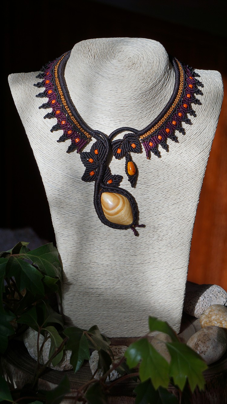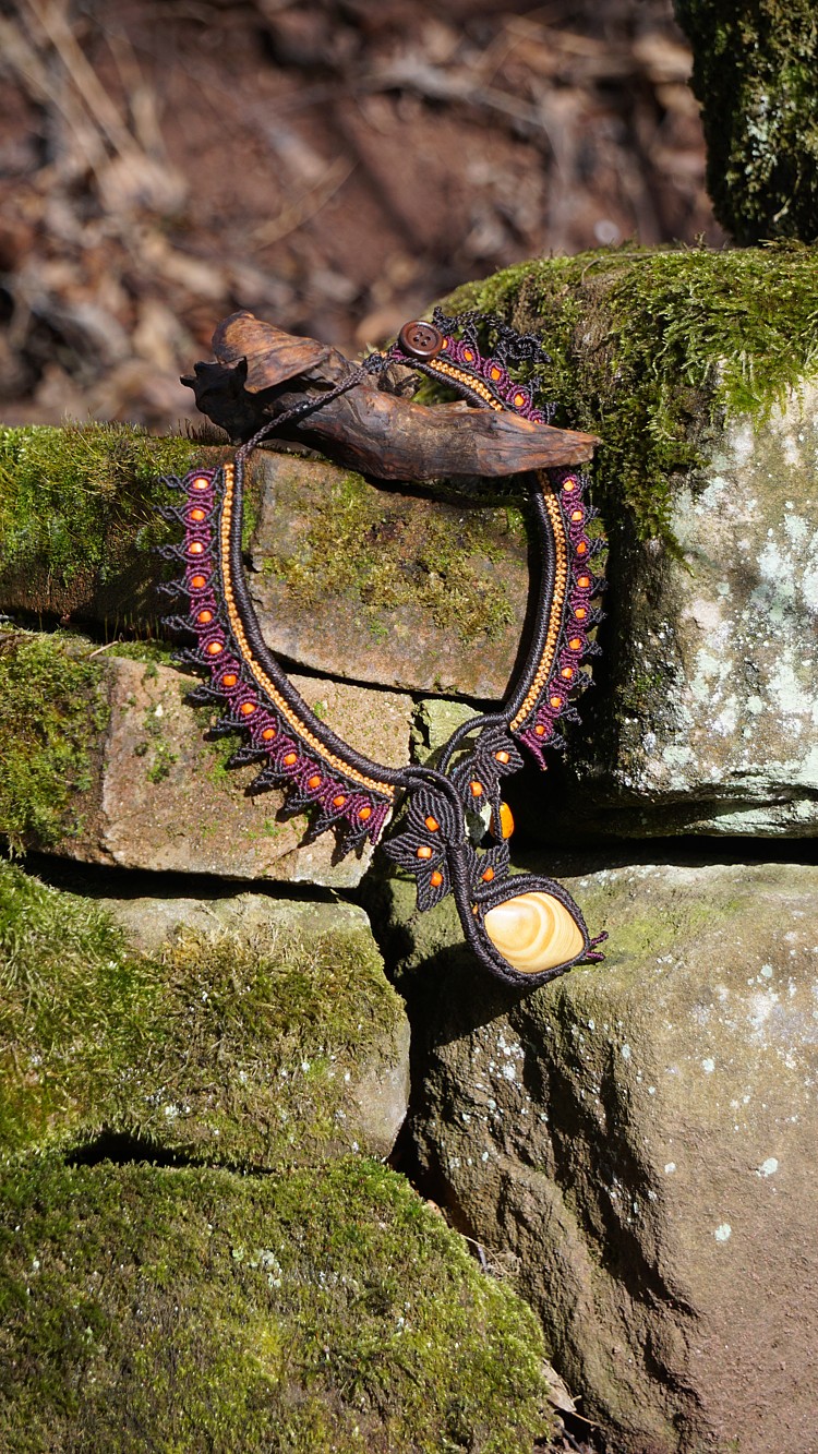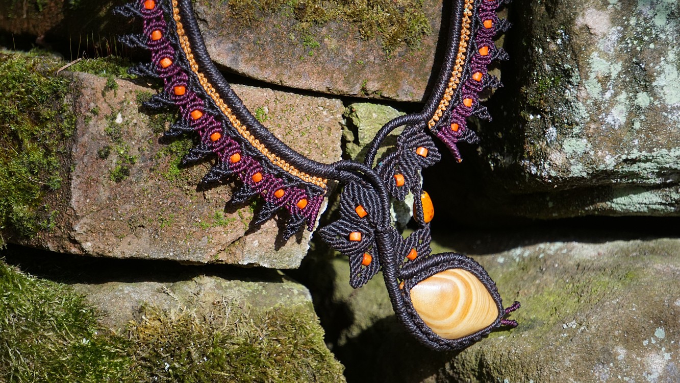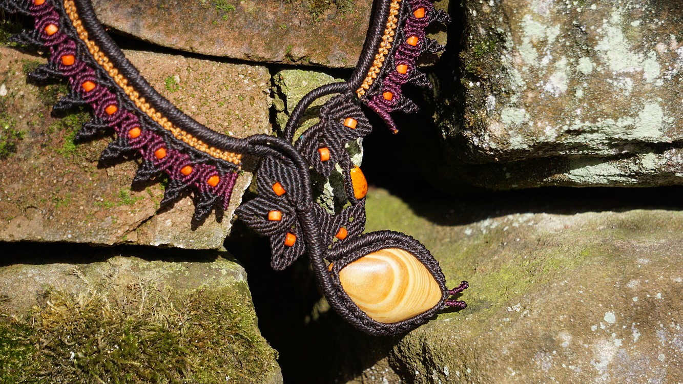 Šperk vznikl technikou micro macramé, což uzlíkování pouze za pomoci šikovných prstů a fantasie. Používám brazilské povoskované šňůrky, které jsou jedny z nejkvalitnějších na světě pro své kvality a stálobarevnost.
