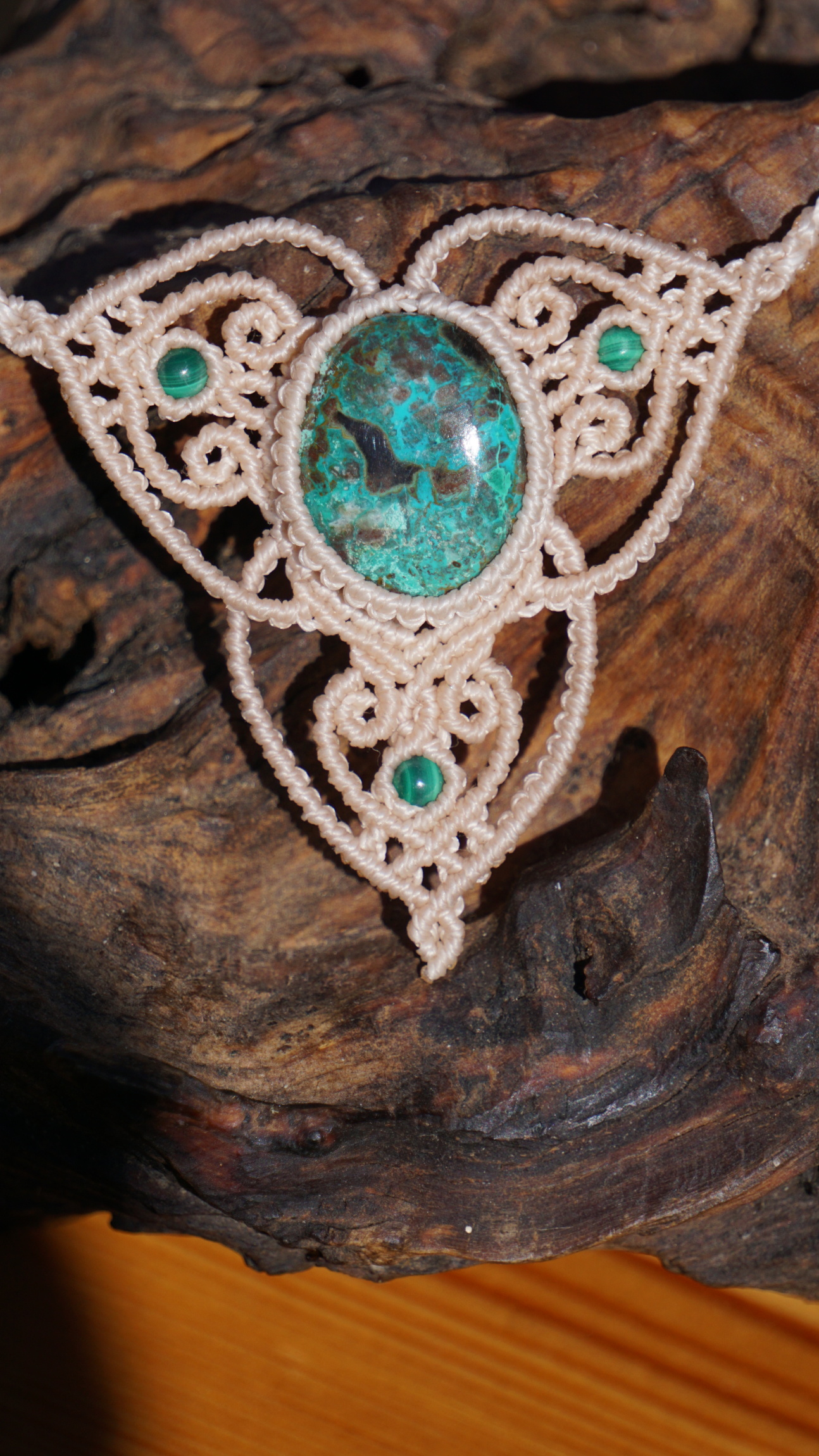 Šperk vznikl technikou micro macramé, což je uzlíkování pouze za pomoci šikovných prstů a fantasie. Používám brazilské povoskované šňůrky, které jsou jedny z nejkvalitnějších na světě pro svou pevnost a stálobarevnost. Šňůrky je možné ručně vyprat ve vlažné mýdlové lázni, vysušit v ručníku a nechat volně uschnout.