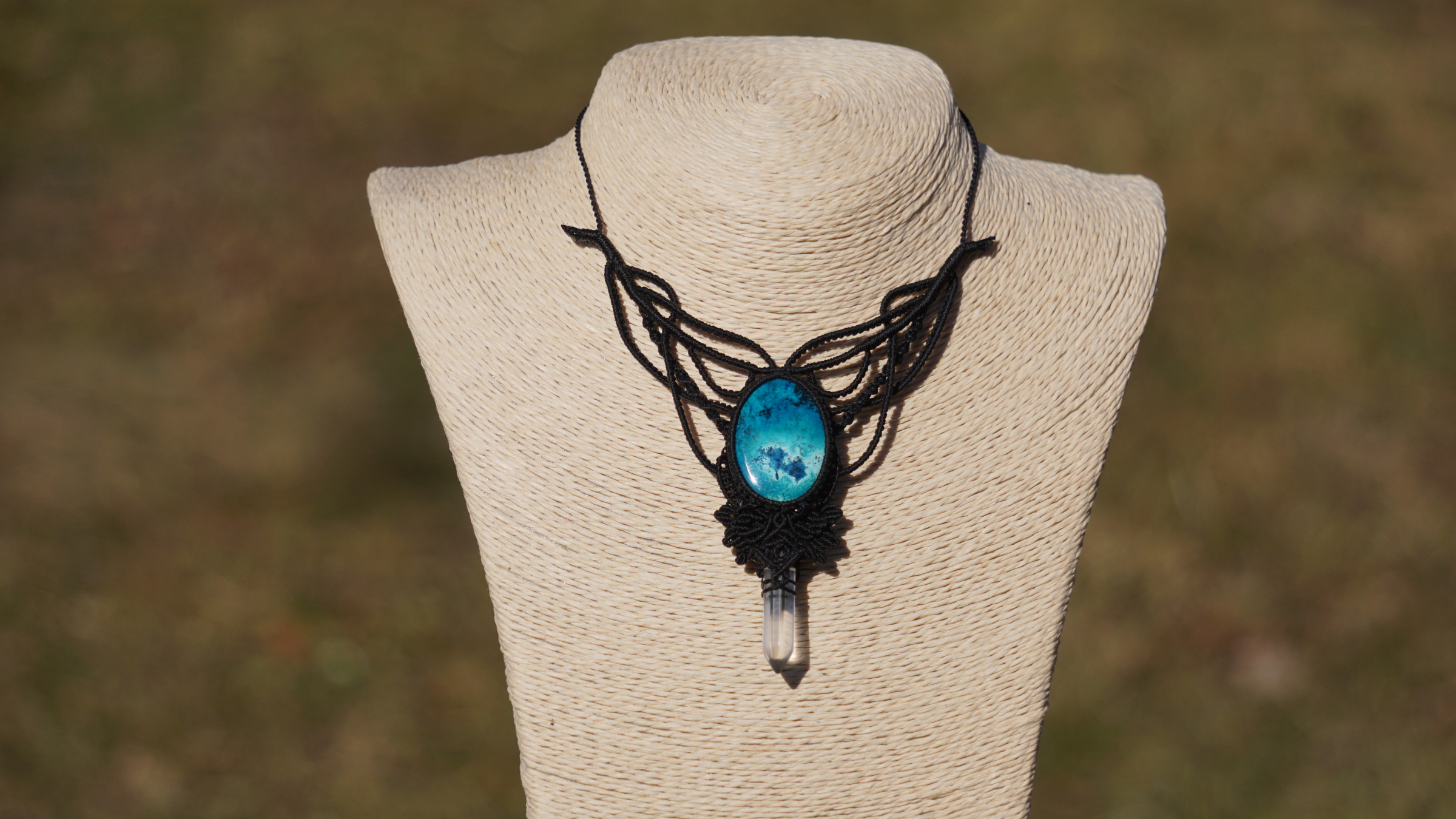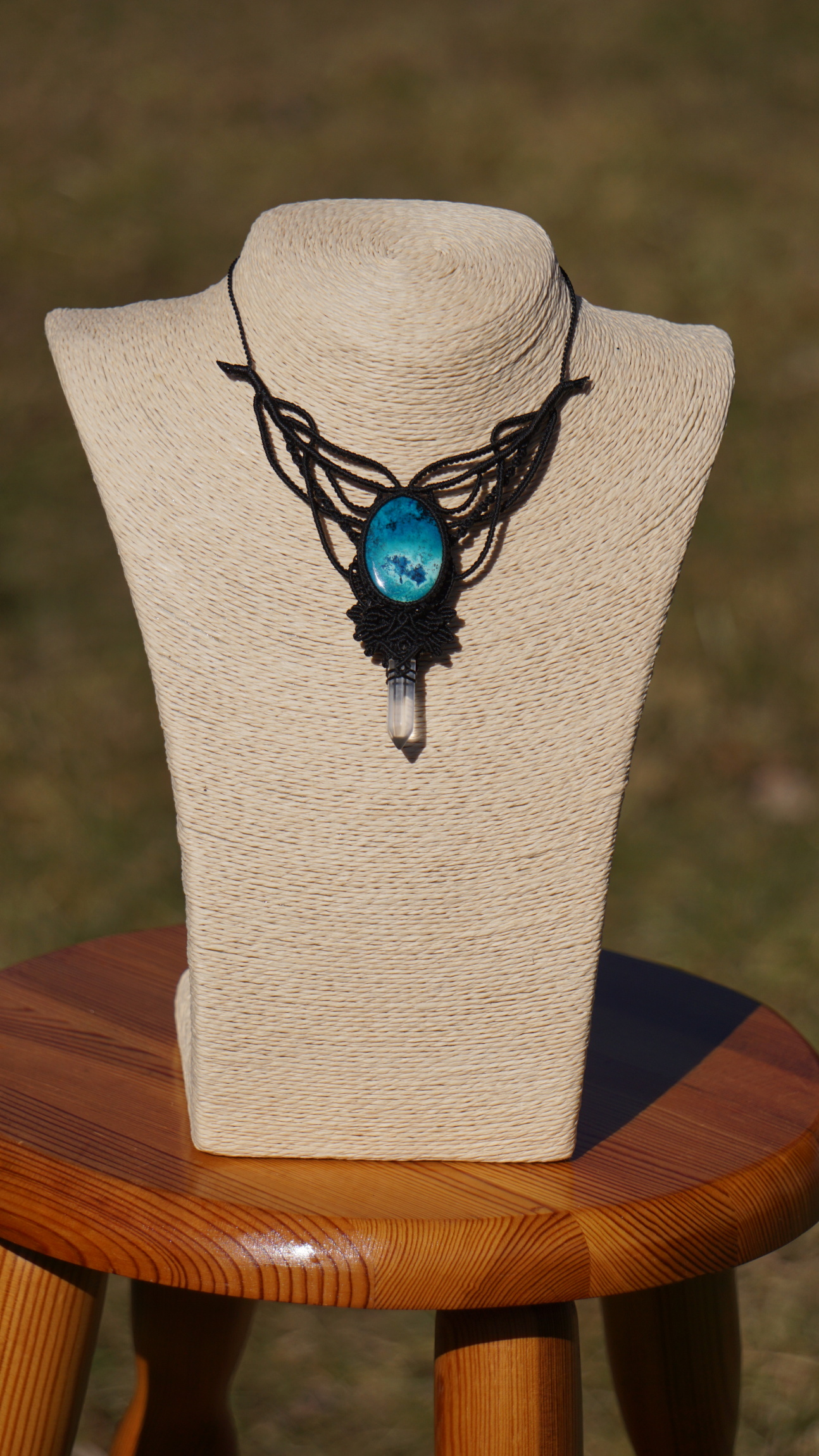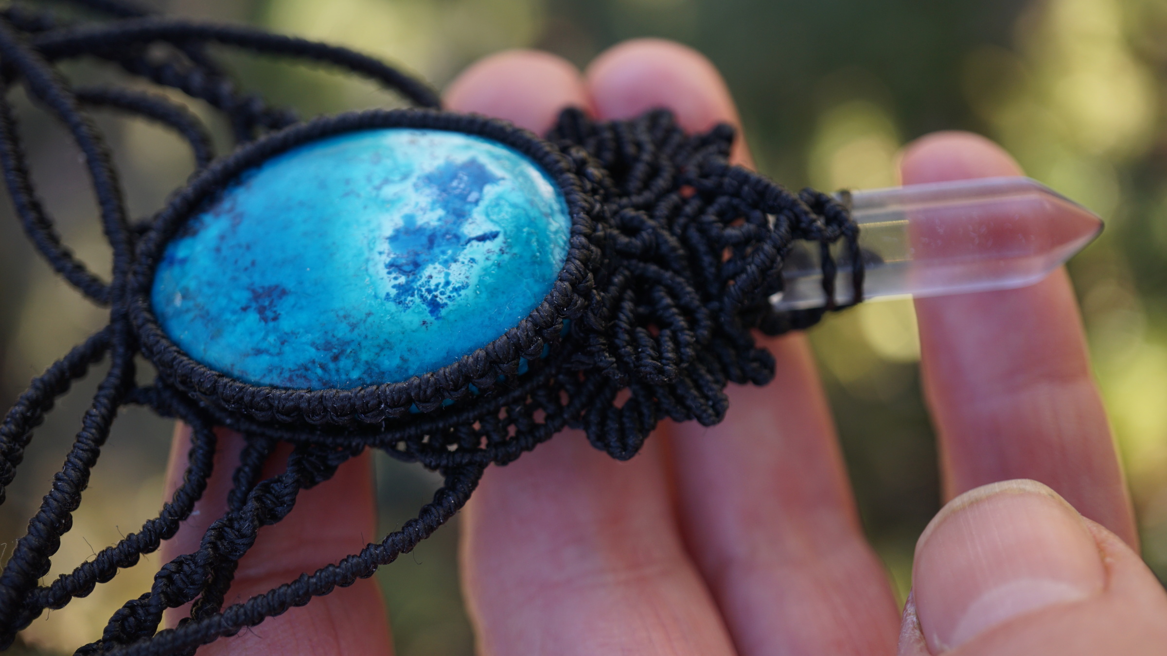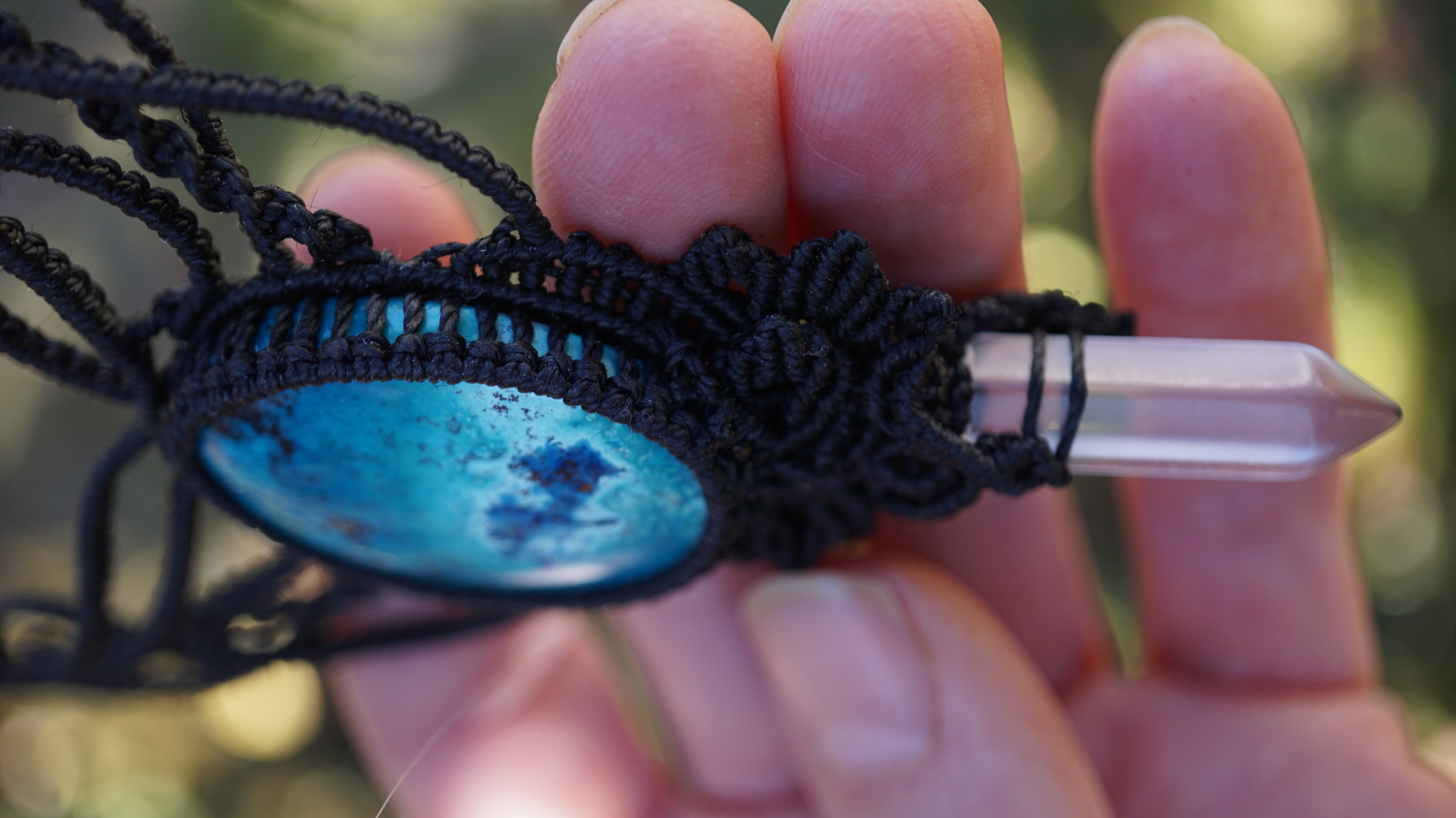 Šperk vznikl technikou micro macramé, což je uzlíkování pouze za pomoci šikovných prstů a fantasie. Používám brazilské povoskované šňůrky, které jsou jedny z nejkvalitnějších na světě pro svou pevnost a stálobarevnost. Šňůrky je možné ručně vyprat ve vlažné mýdlové lázni, vysušit v ručníku a nechat volně uschnout.