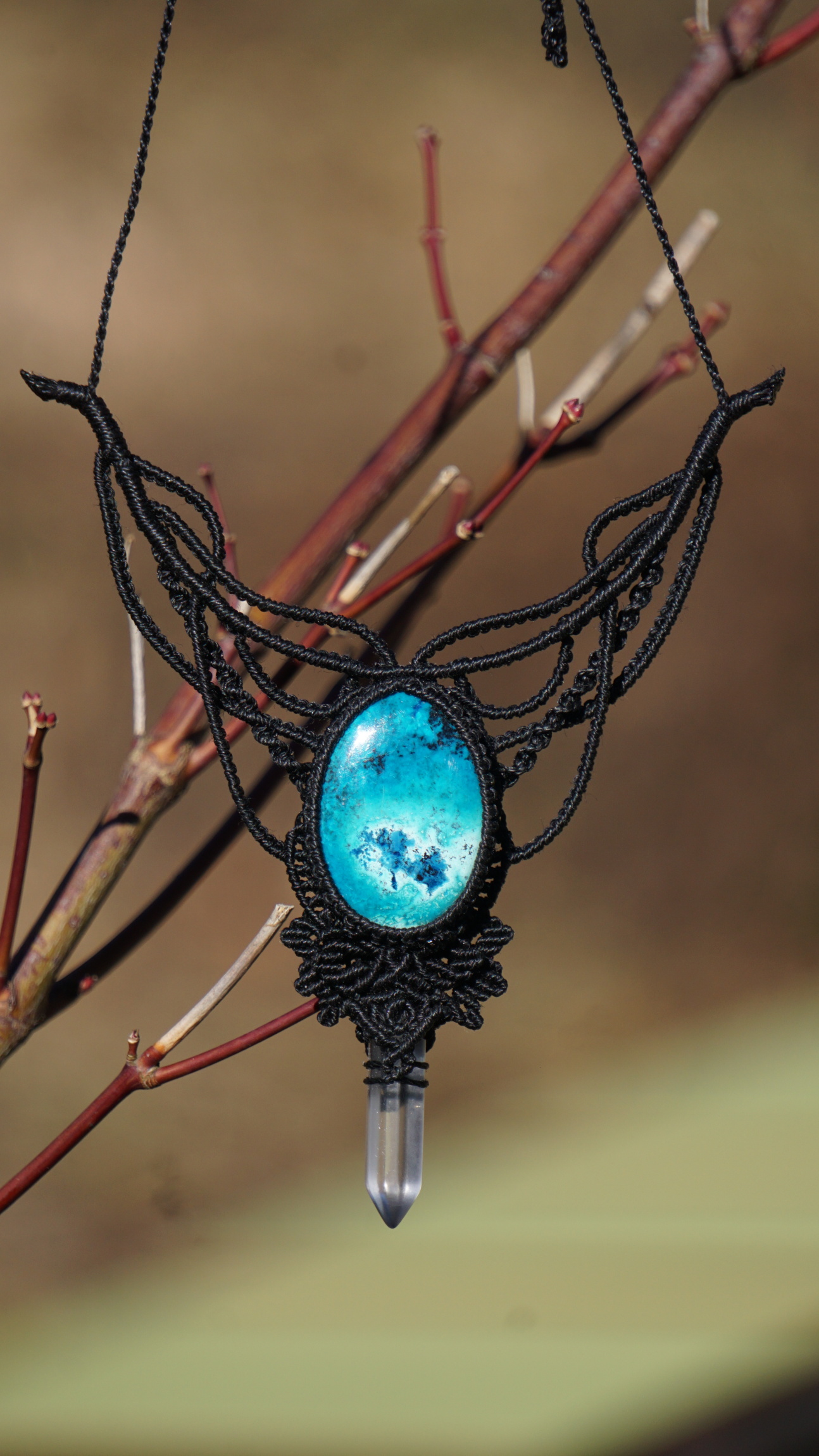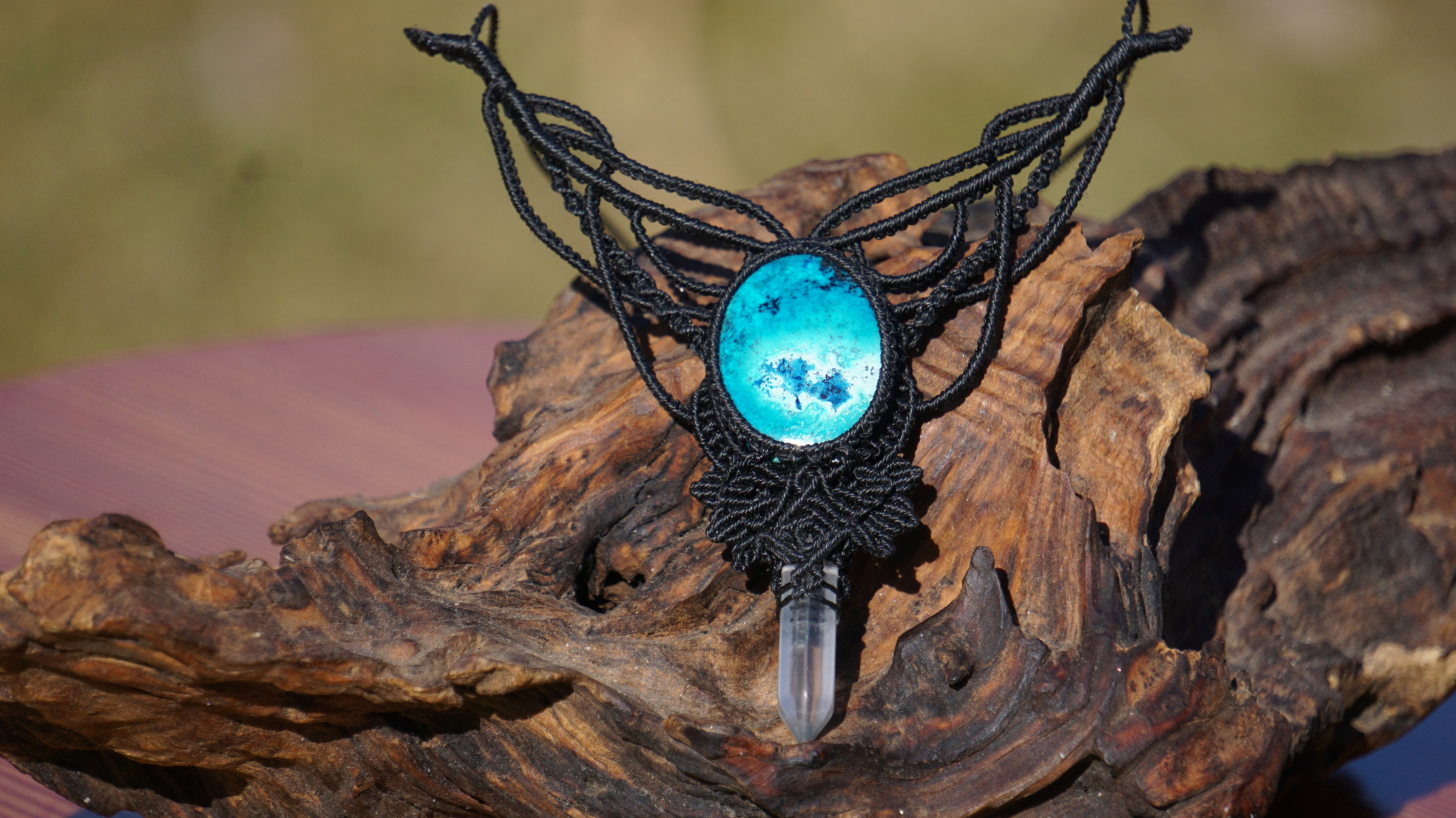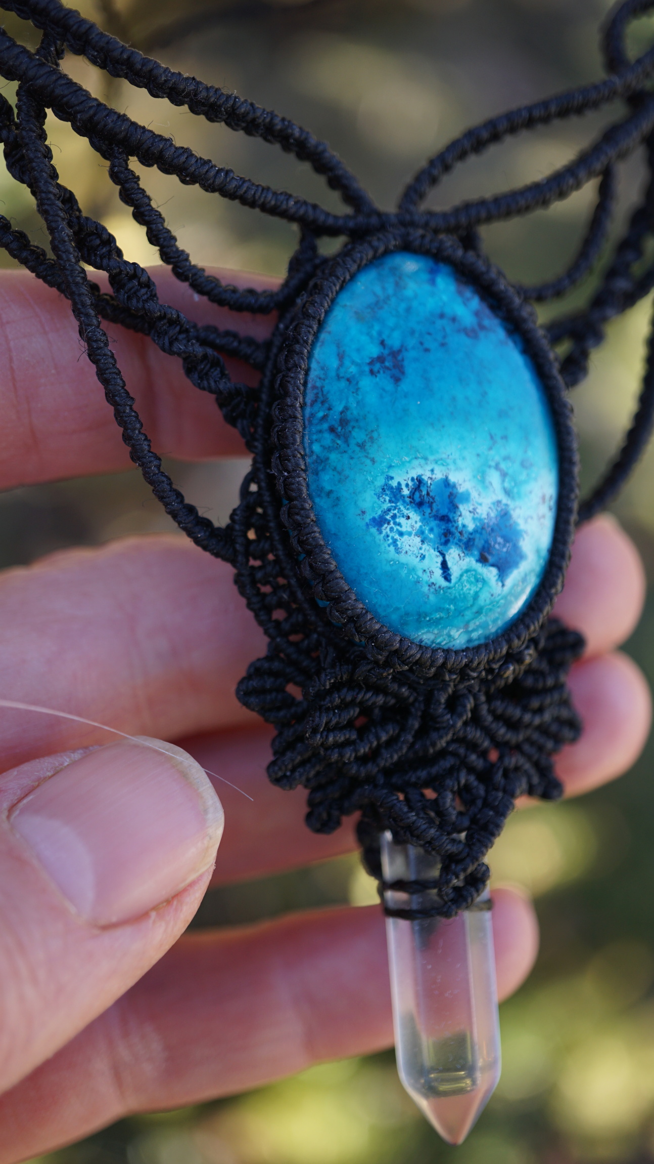 Šperk vznikl technikou micro macramé, což je uzlíkování pouze za pomoci šikovných prstů a fantasie. Používám brazilské povoskované šňůrky, které jsou jedny z nejkvalitnějších na světě pro svou pevnost a stálobarevnost. Šňůrky je možné ručně vyprat ve vlažné mýdlové lázni, vysušit v ručníku a nechat volně uschnout.