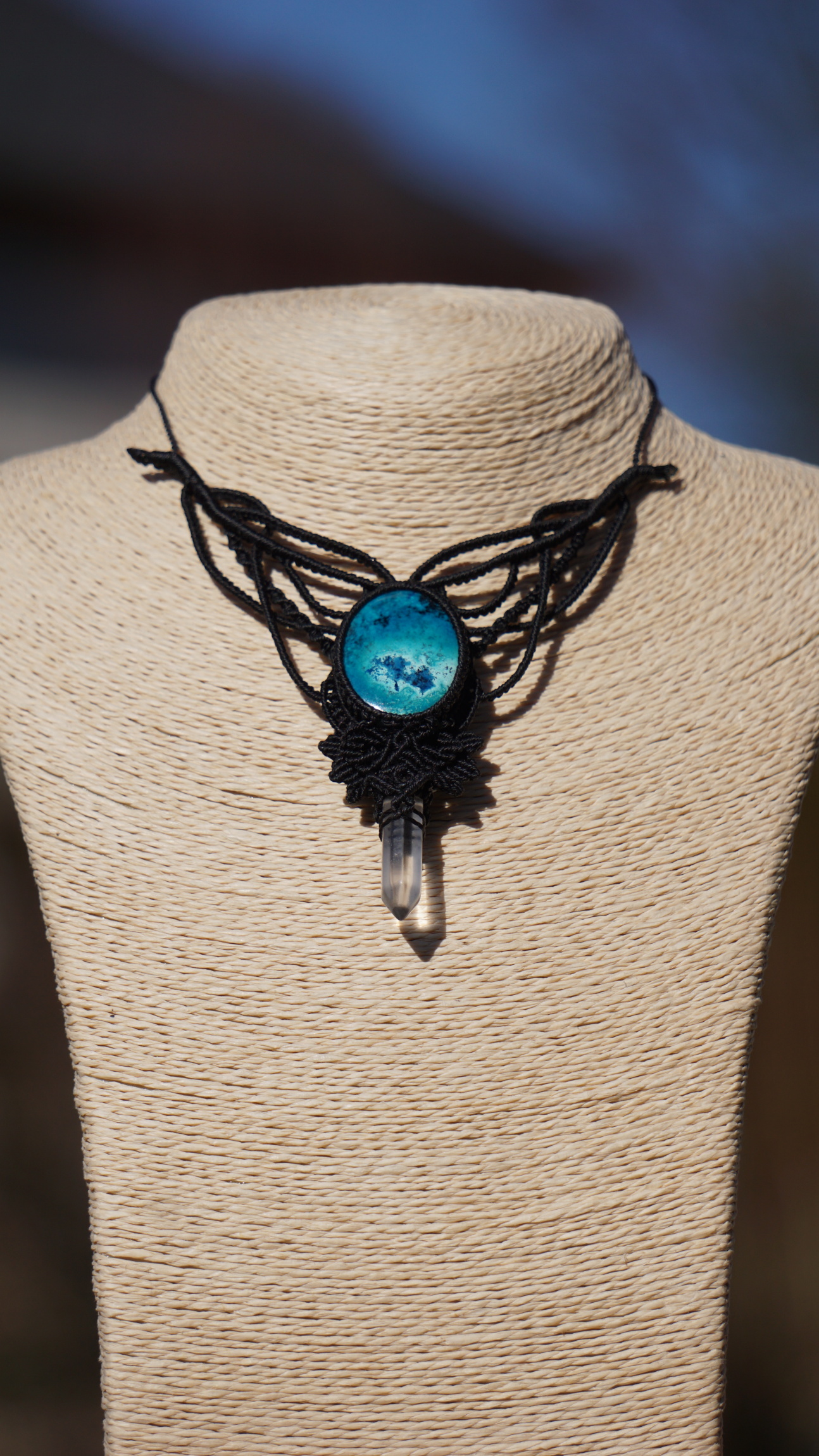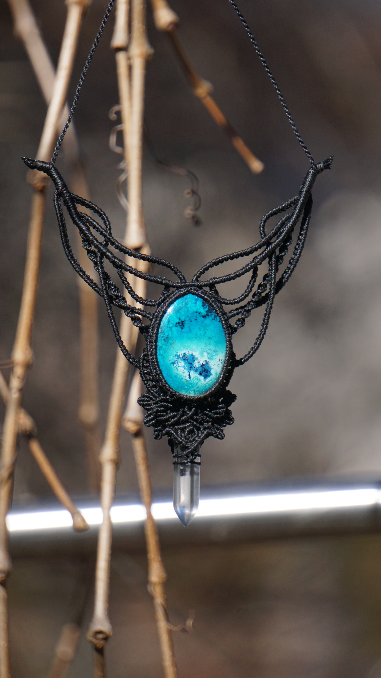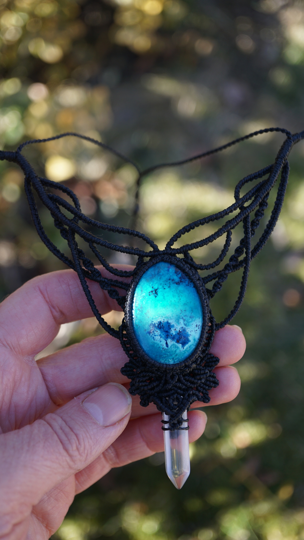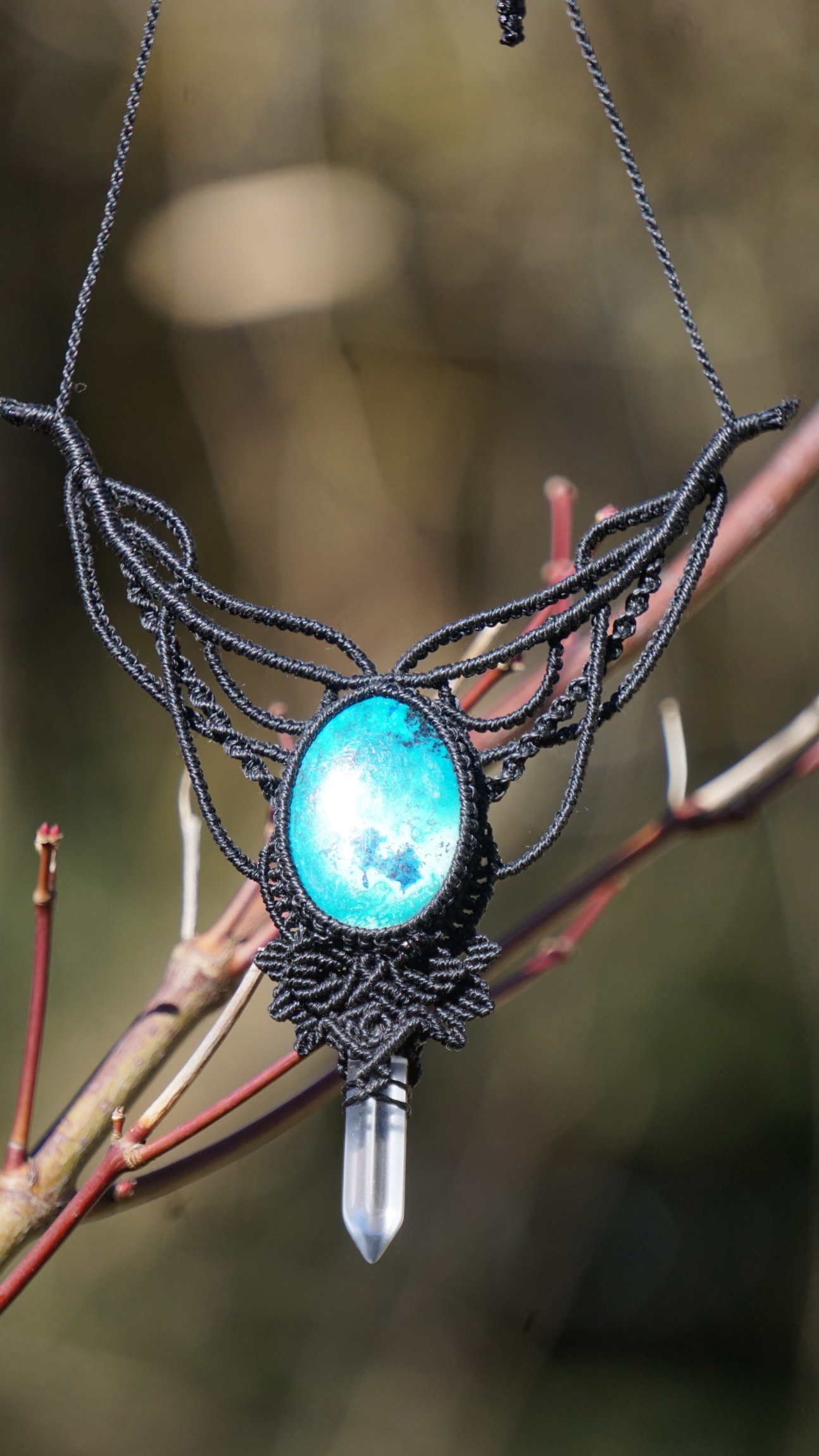 Šperk vznikl technikou micro macramé, což je uzlíkování pouze za pomoci šikovných prstů a fantasie. Používám brazilské povoskované šňůrky, které jsou jedny z nejkvalitnějších na světě pro svou pevnost a stálobarevnost. Šňůrky je možné ručně vyprat ve vlažné mýdlové lázni, vysušit v ručníku a nechat volně uschnout.