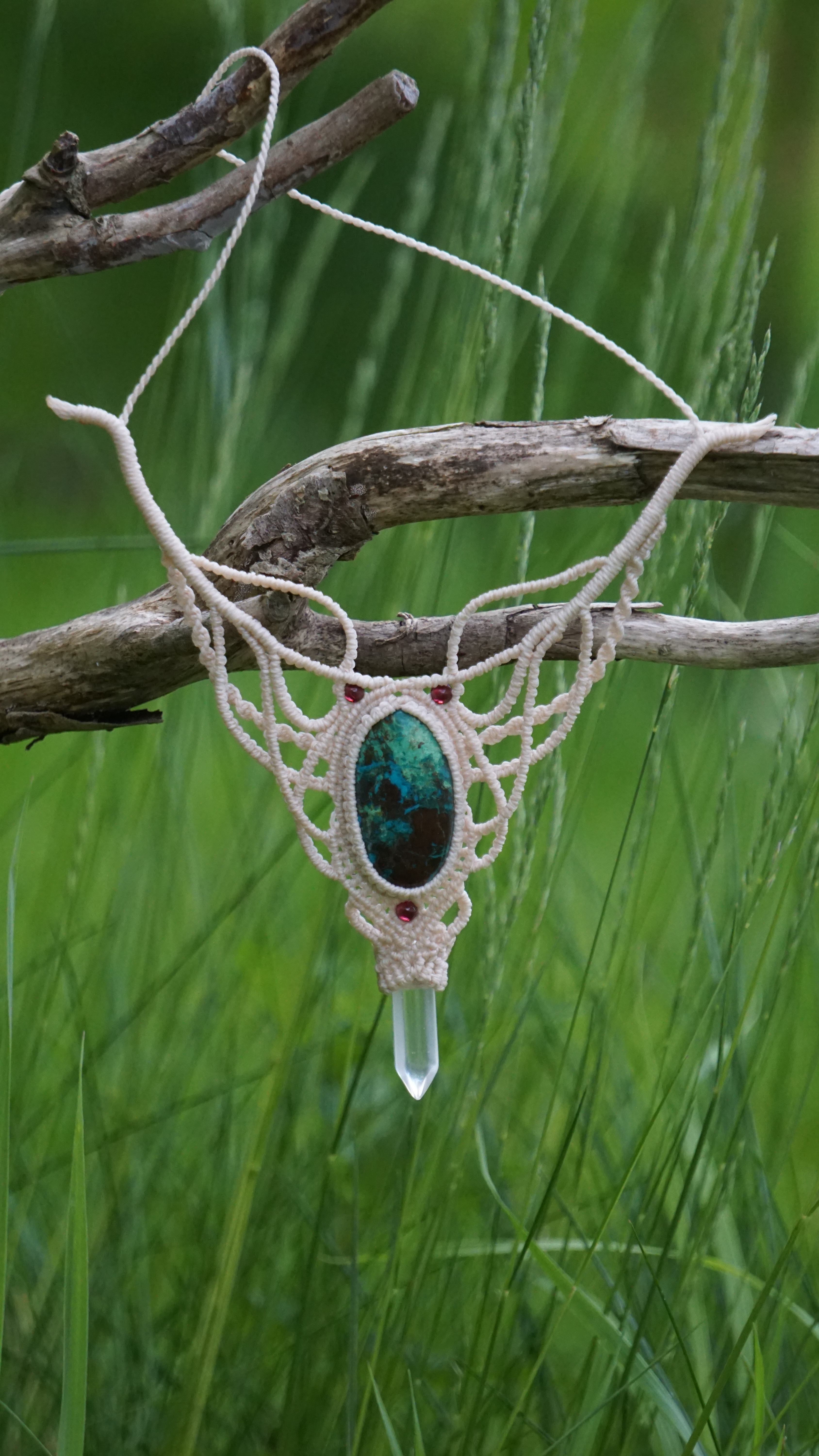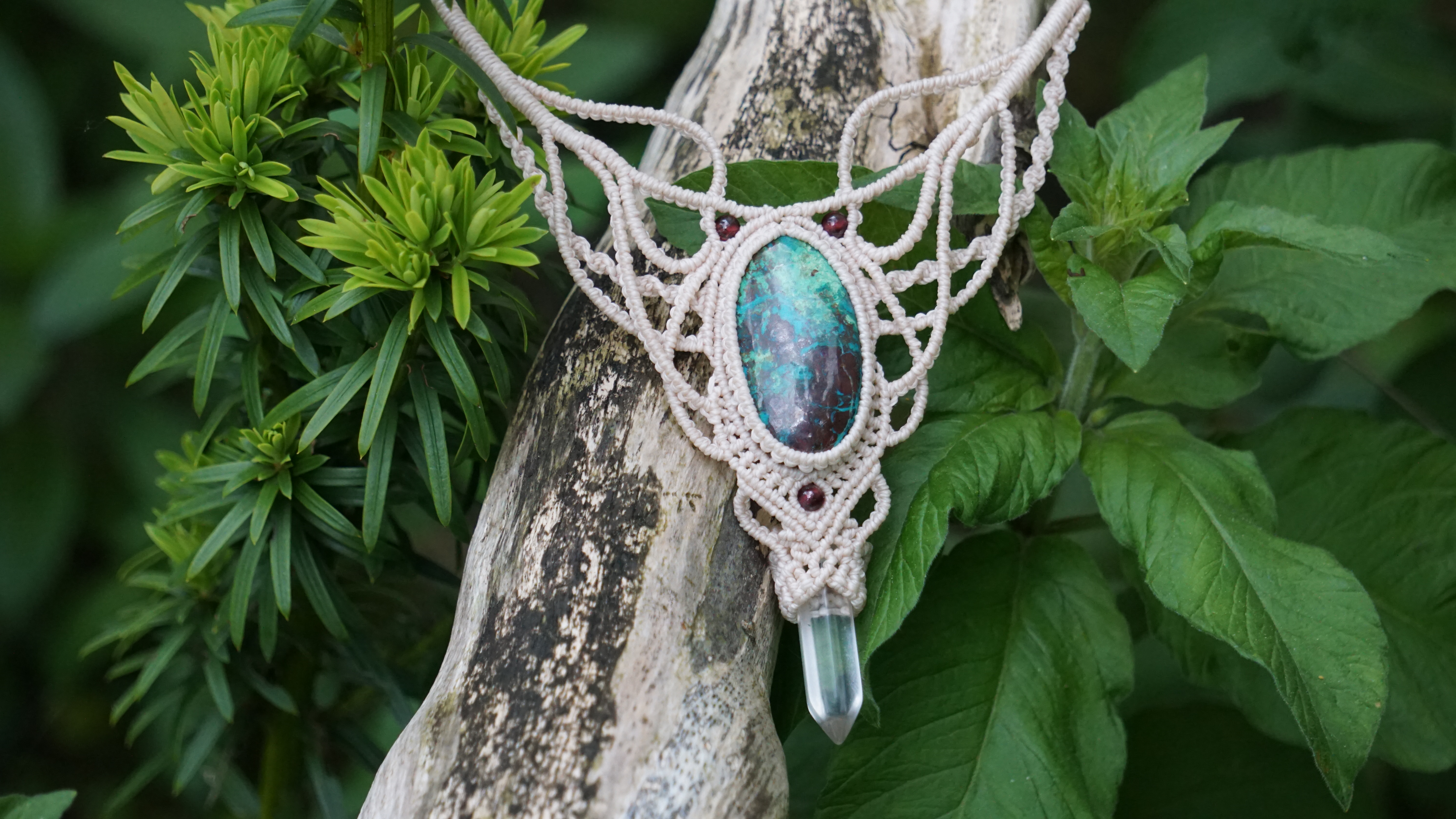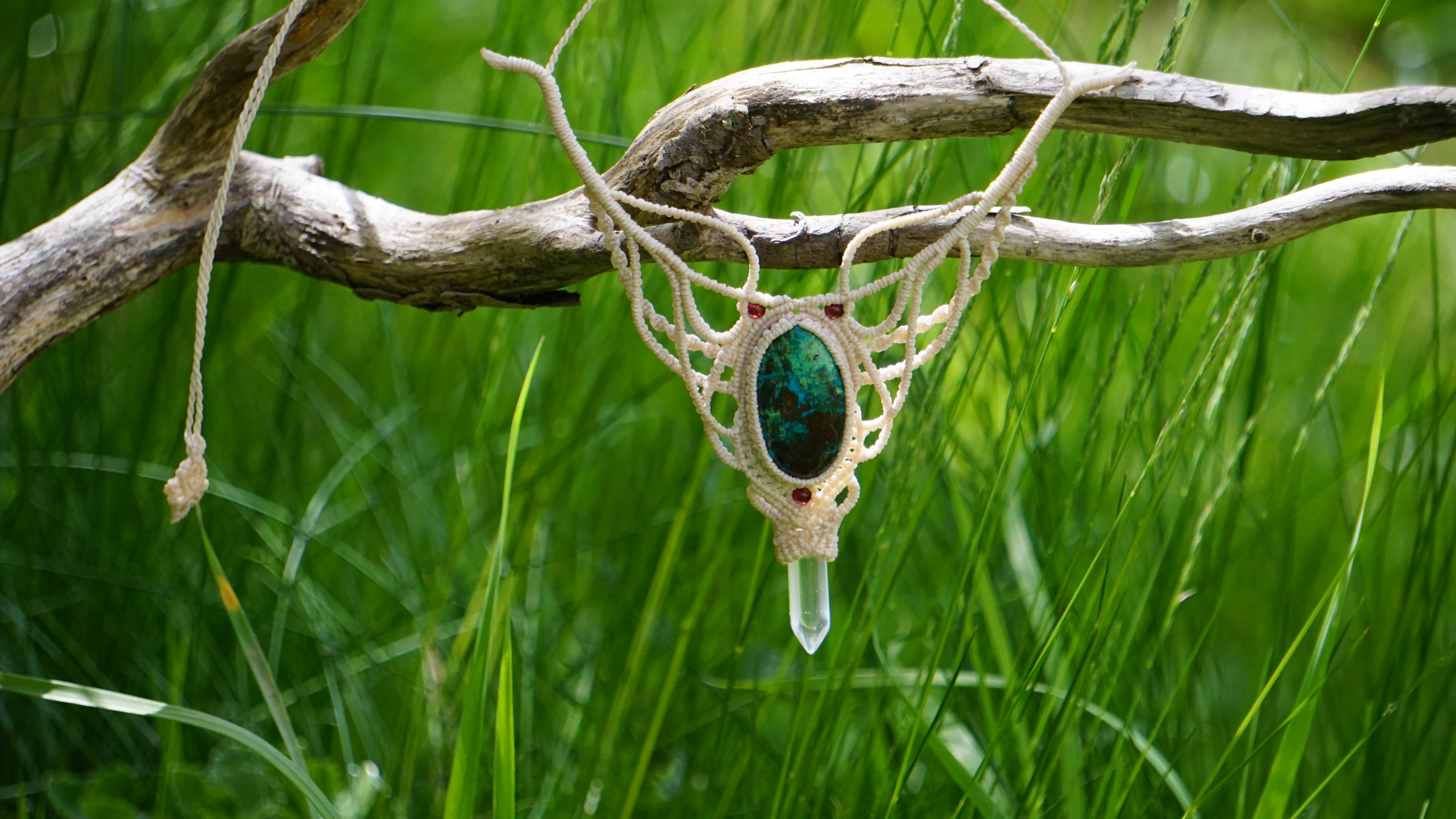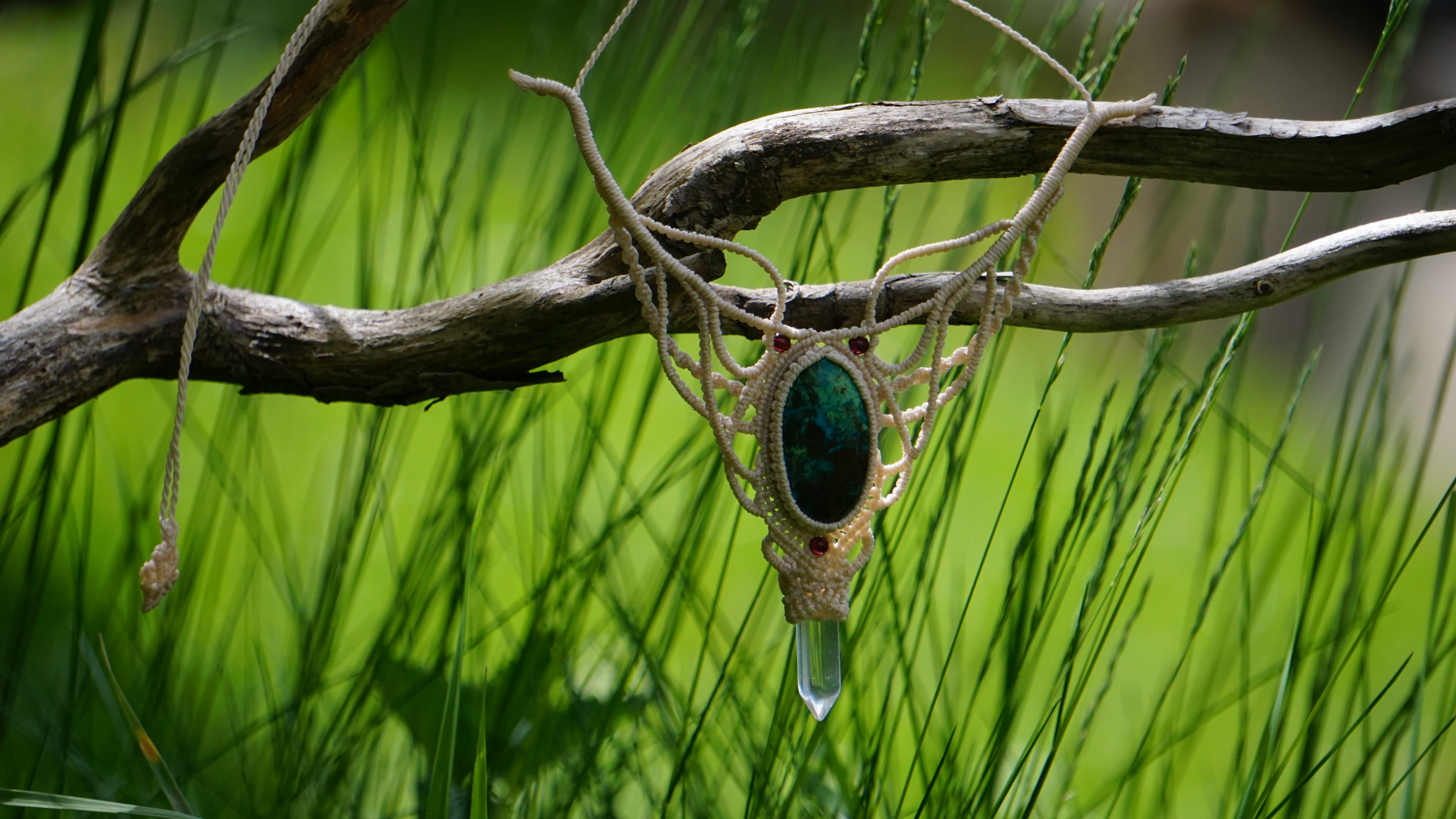 Šperk vznikl technikou micro macramé, což je uzlíkování pouze za pomoci šikovných prstů a fantasie. Používám brazilské povoskované šňůrky, které jsou jedny z nejkvalitnějších na světě pro svou pevnost a stálobarevnost. Šňůrky je možné ručně vyprat ve vlažné mýdlové lázni, vysušit v ručníku a nechat volně uschnout.