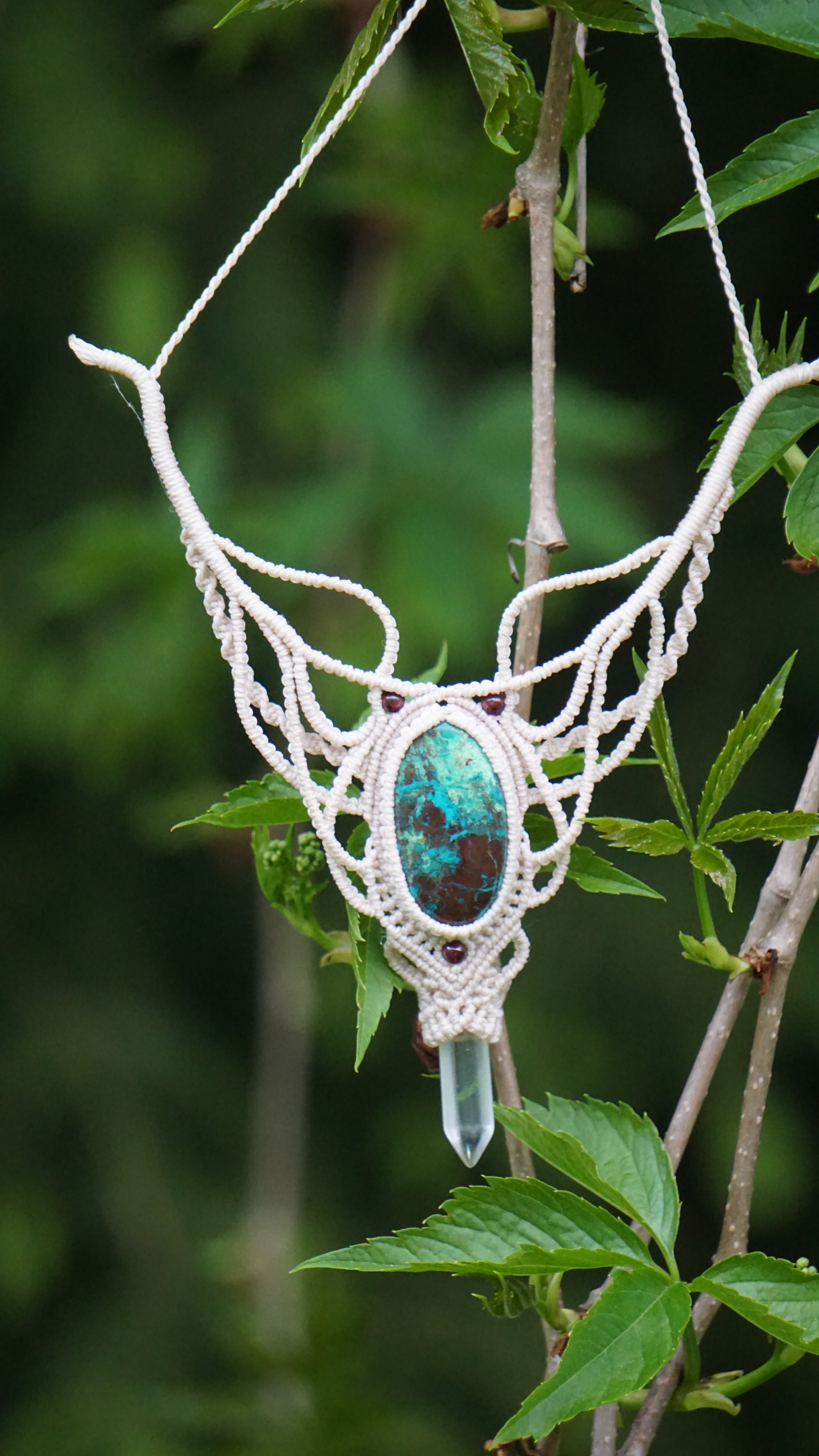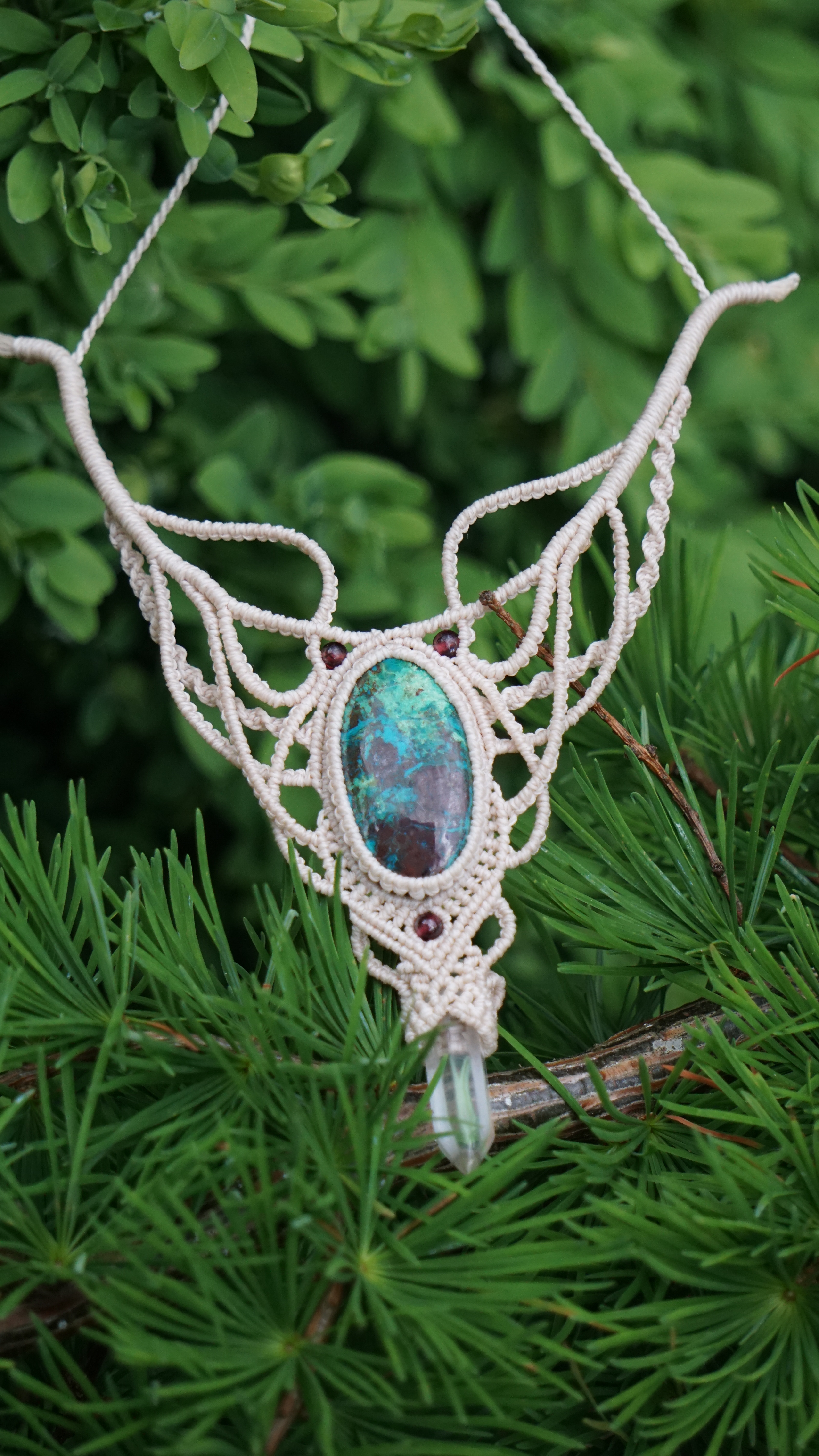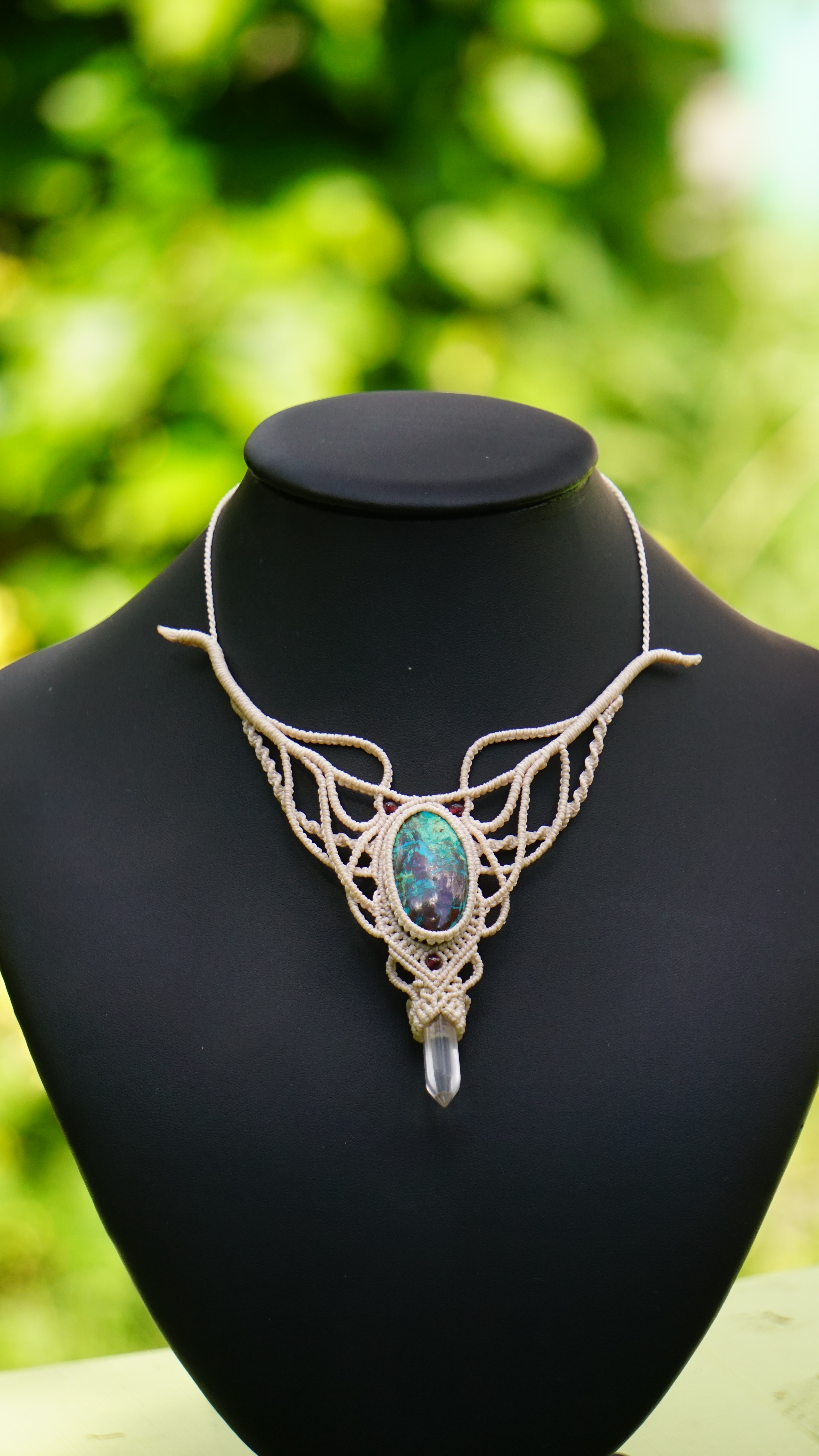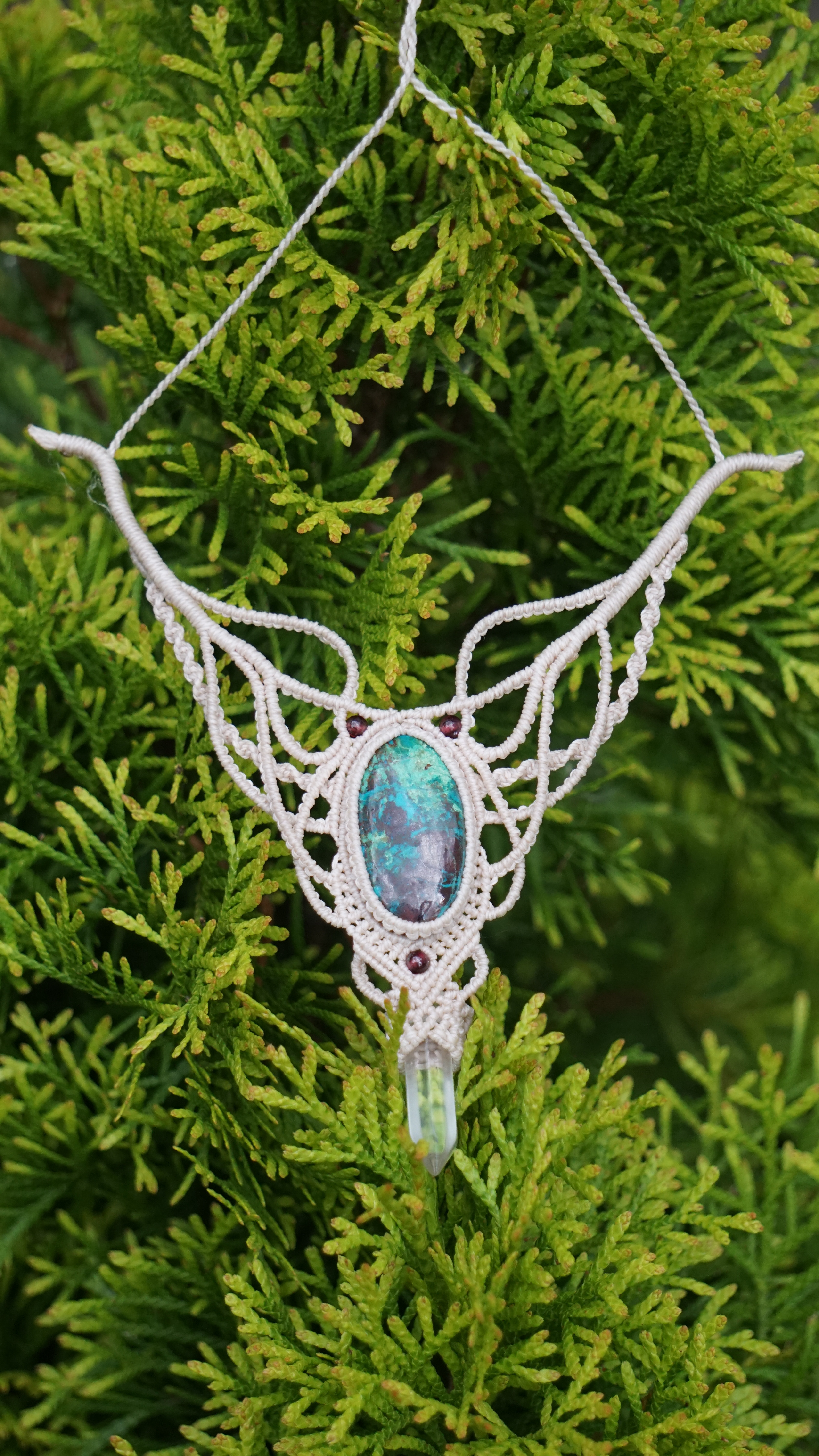 Šperk vznikl technikou micro macramé, což je uzlíkování pouze za pomoci šikovných prstů a fantasie. Používám brazilské povoskované šňůrky, které jsou jedny z nejkvalitnějších na světě pro svou pevnost a stálobarevnost. Šňůrky je možné ručně vyprat ve vlažné mýdlové lázni, vysušit v ručníku a nechat volně uschnout.
