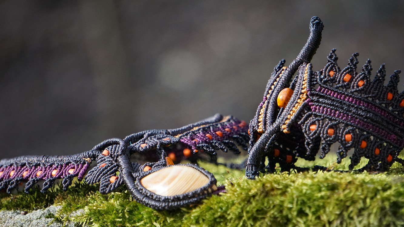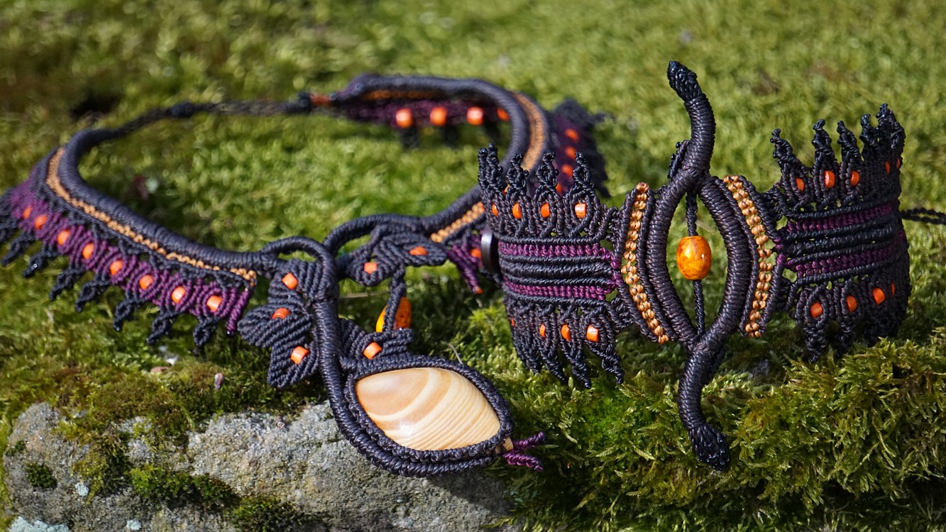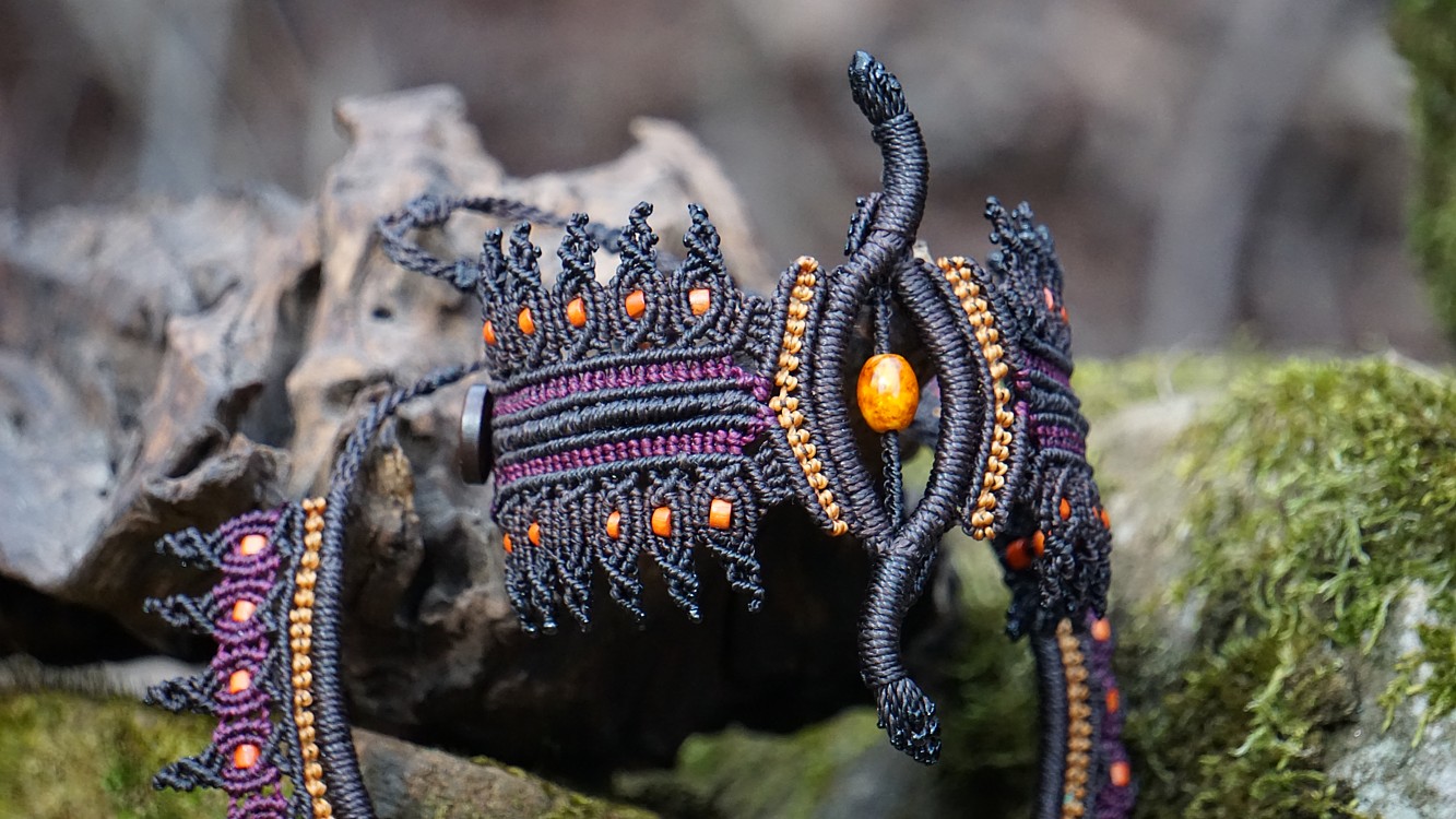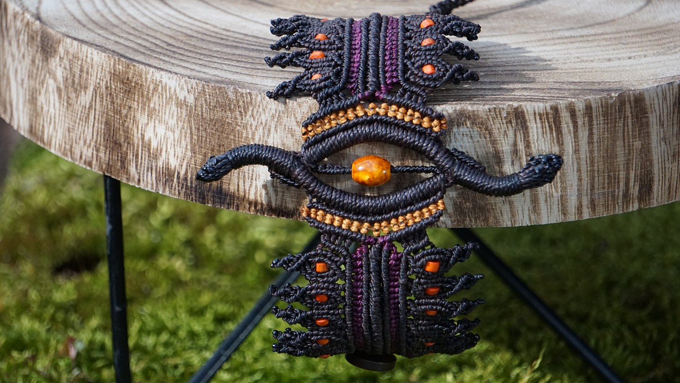 Šperk vznikl technikou micro macramé, což uzlíkování pouze za pomoci šikovných prstů a fantasie. Používám brazilské povoskované šňůrky, které jsou jedny z nejkvalitnějších na světě pro své kvality a stálobarevnost
