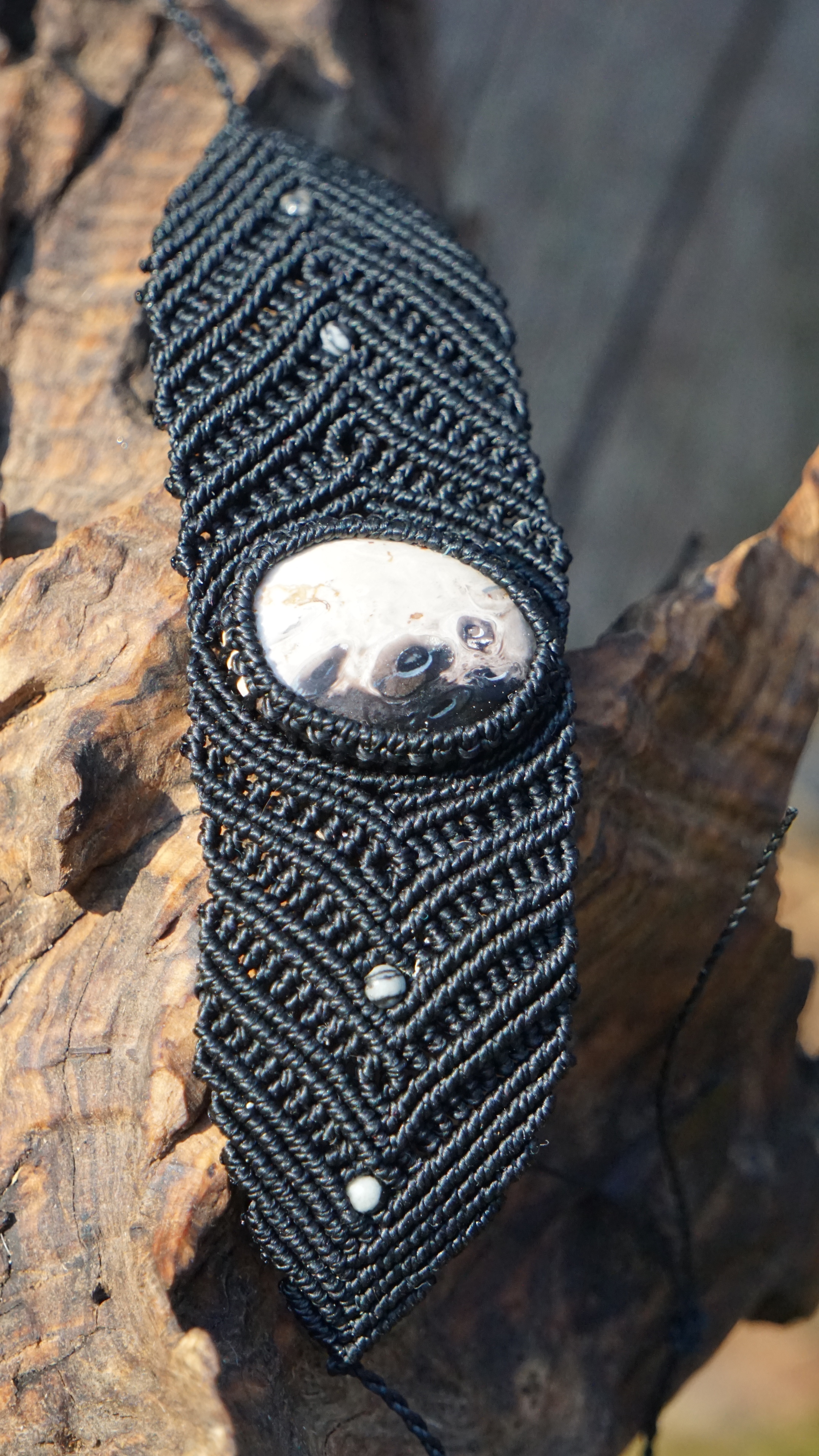 Šperk vznikl technikou micro macramé, což uzlíkování pouze za pomoci šikovných prstů a fantasie. Používám brazilské povoskované šňůrky, které jsou jedny z nejkvalitnějších na světě pro své kvality a stálobarevnost.