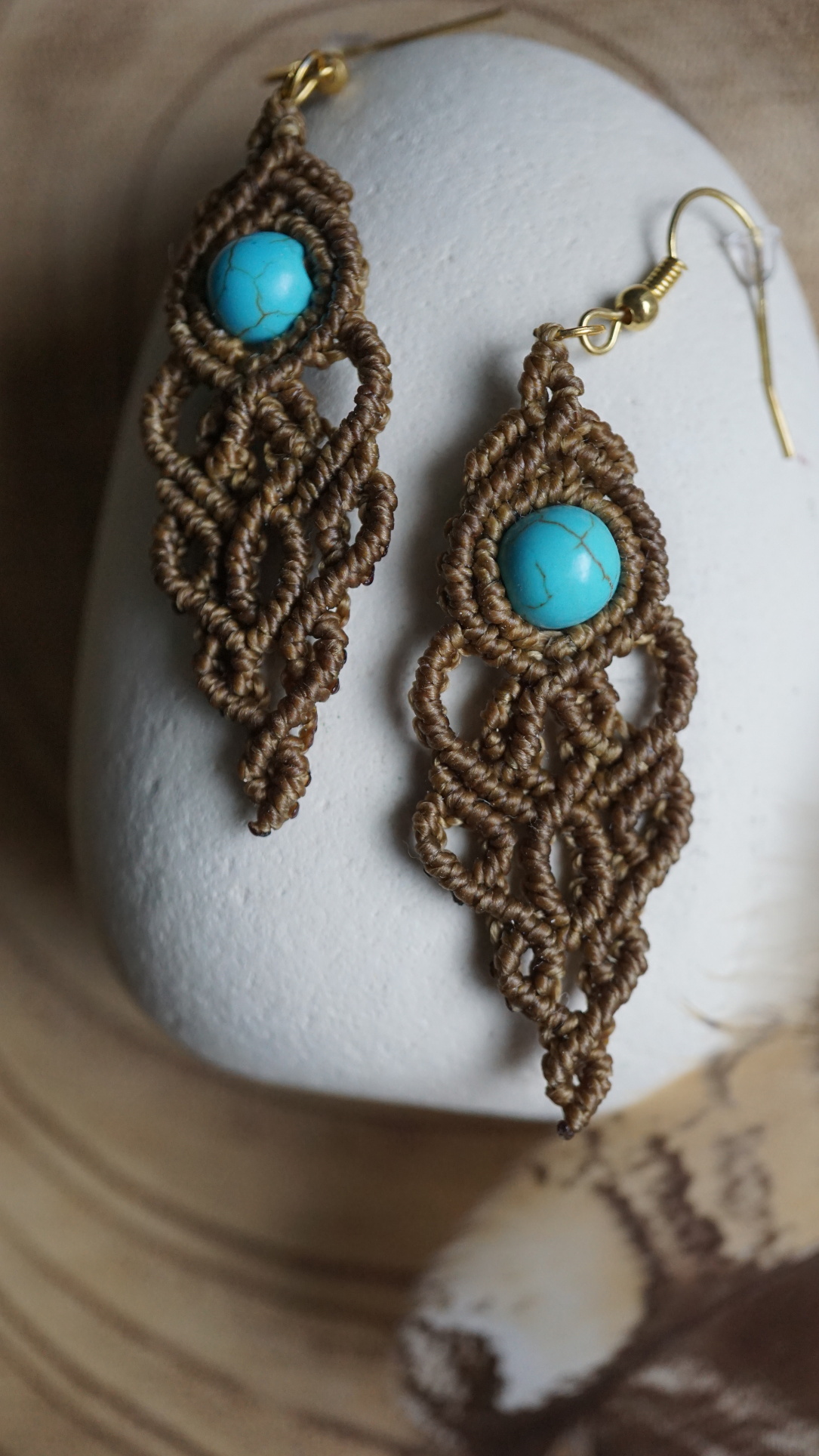 Náušnice vznikly technikou micro macramé, což je uzlíkování pouze za pomoci šikovných prstů a fantasie. Používám brazilské povoskované šňůrky, které jsou jedny z nejkvalitnějších na světě pro svou pevnost a stálobarevnost.