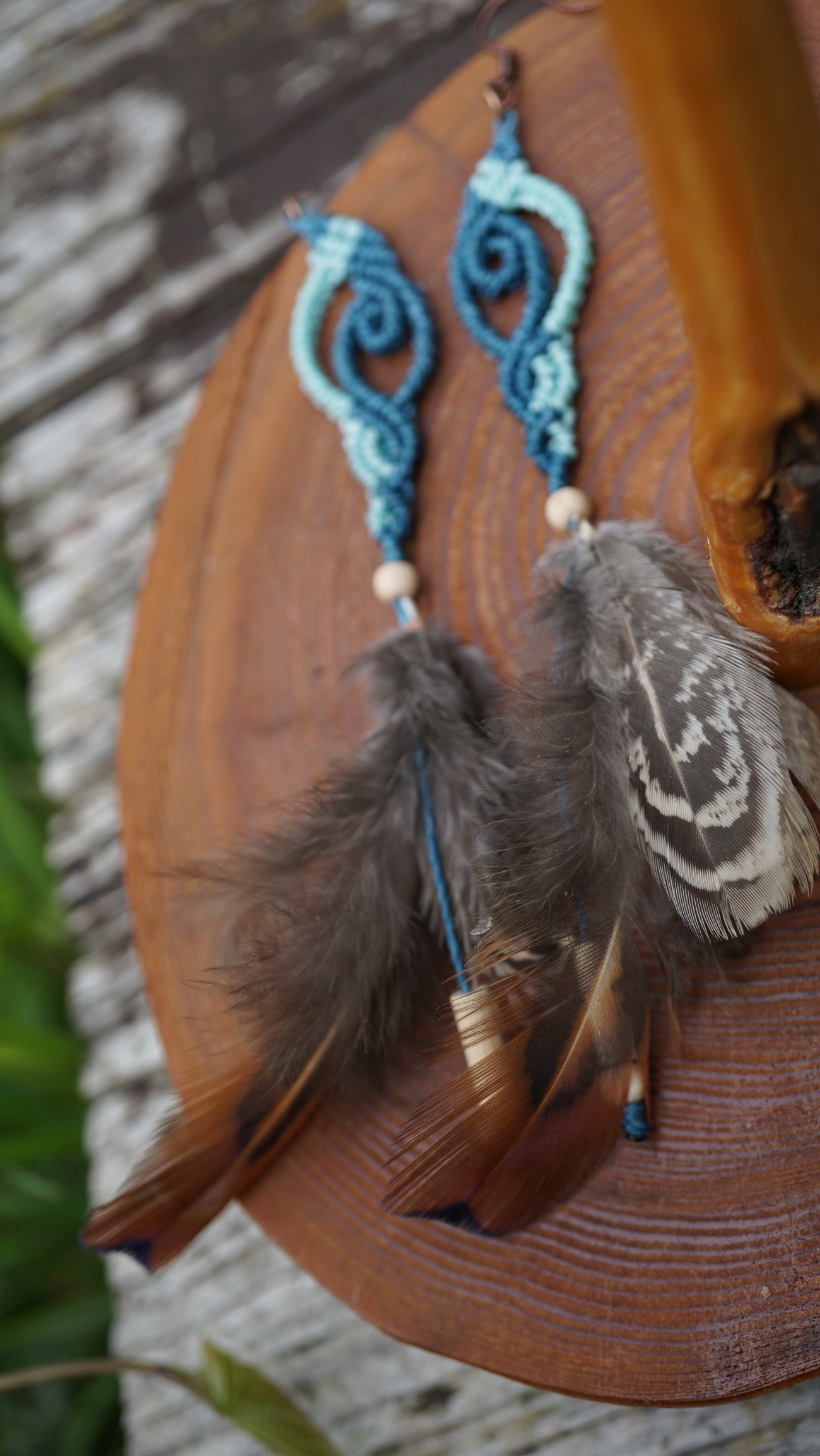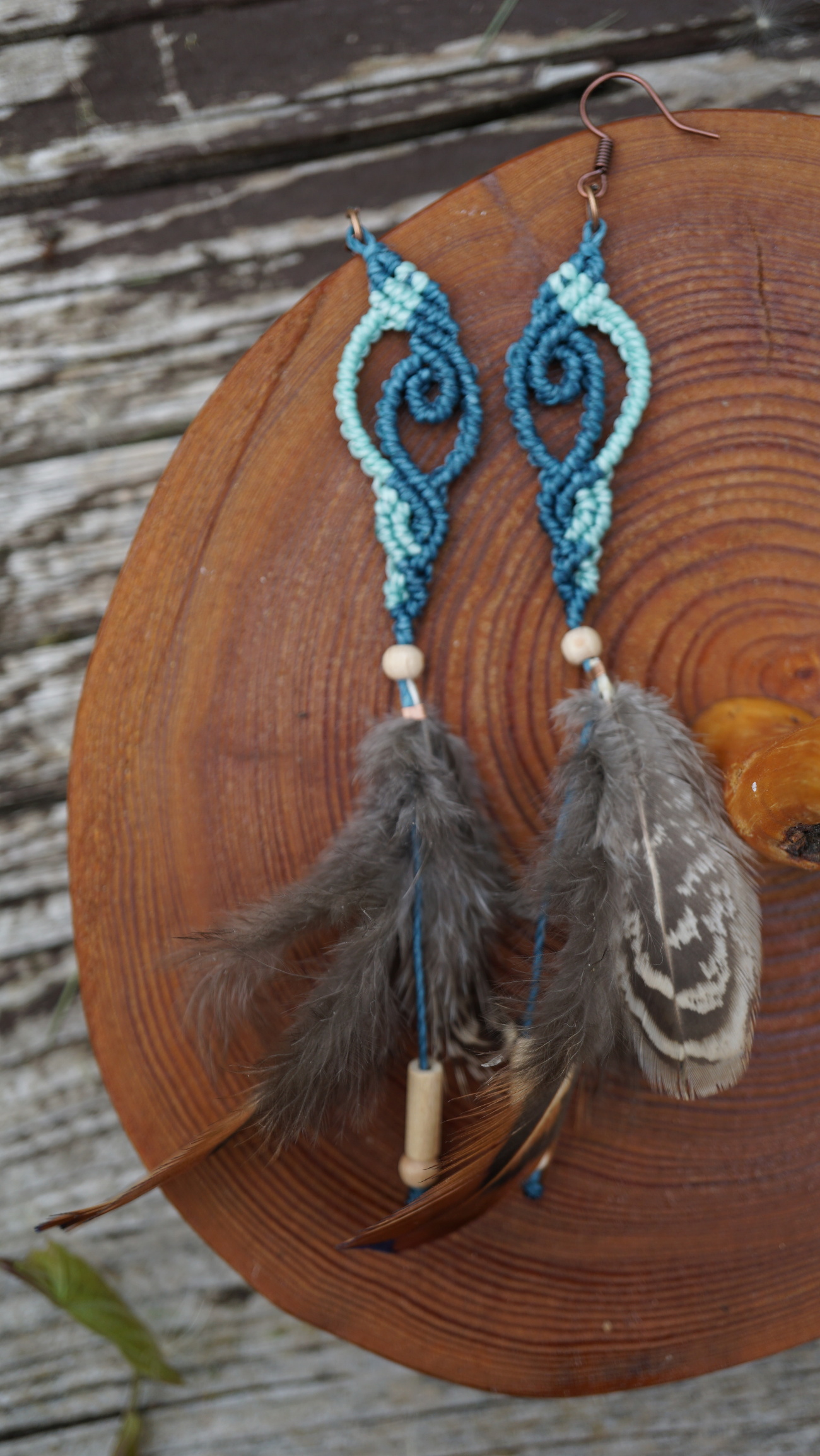 Barva šňůrek je ve dvou odstínech tyrkysu, peříčka koroptví.