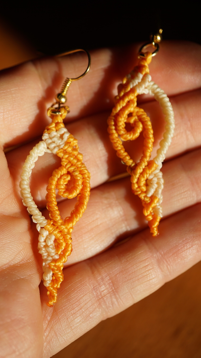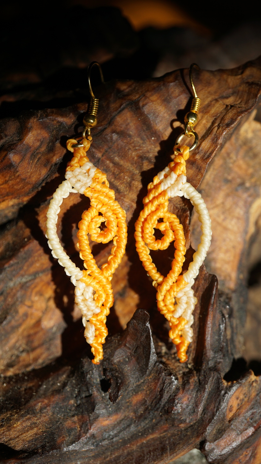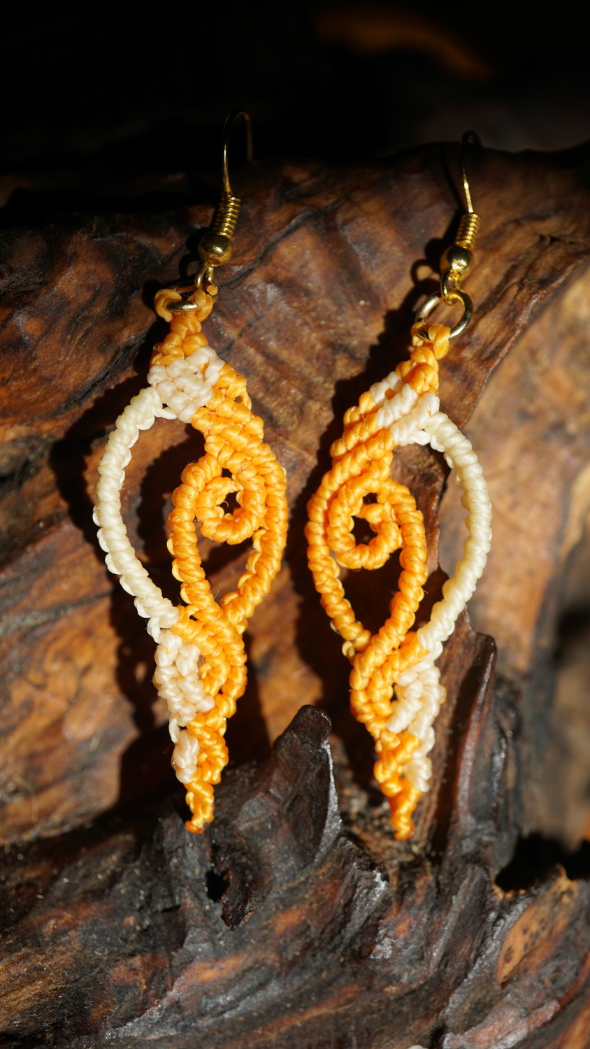 Náušnice vznikly technikou micro macramé, což je uzlíkování pouze za pomoci šikovných prstů a fantasie. Používám brazilské povoskované šňůrky, které jsou jedny z nejkvalitnějších na světě pro svou pevnost a stálobarevnost.