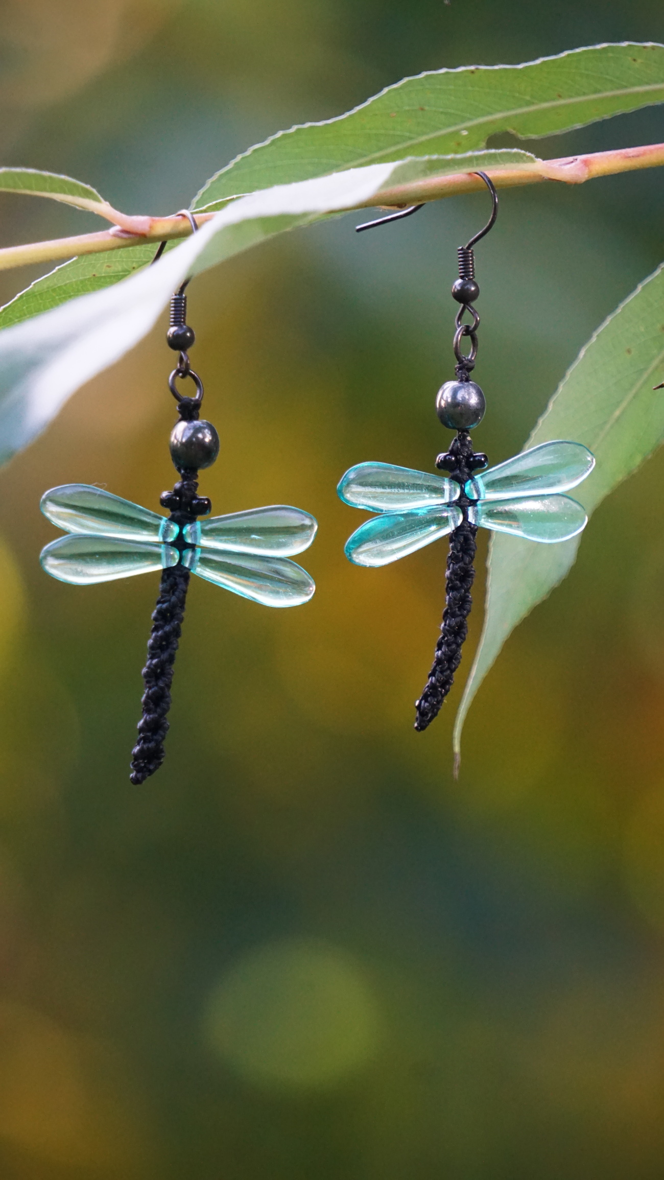 Křidélka vážky jsou z českého skla v krásných průhldných světle tyrkysových odlescích, barva nitek černá, technika se jmenuje micro macramé (vázání uzlů, drhání), kuličky jsou z hematitu.