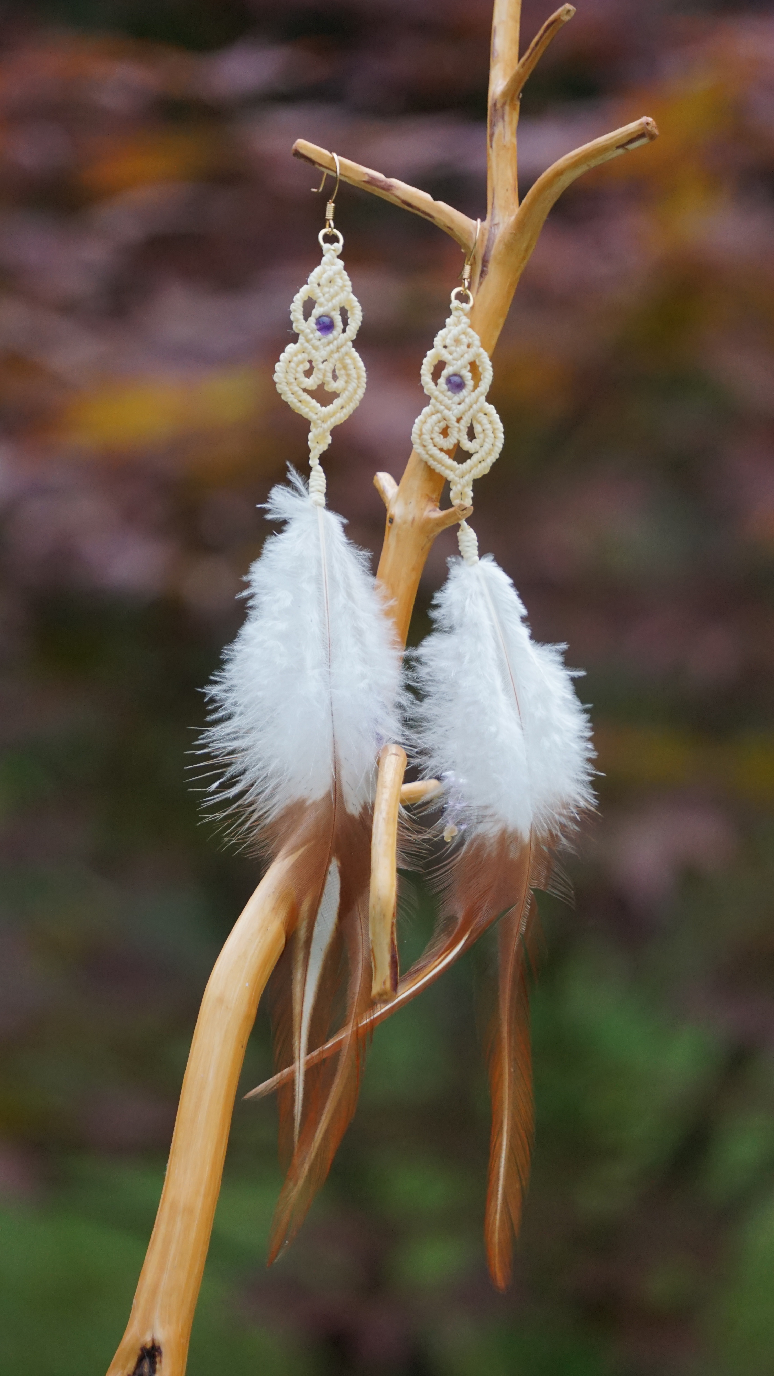Barva nitek je světle béžová. Minerální korálky jsou ametystové, pírka kohoutí.