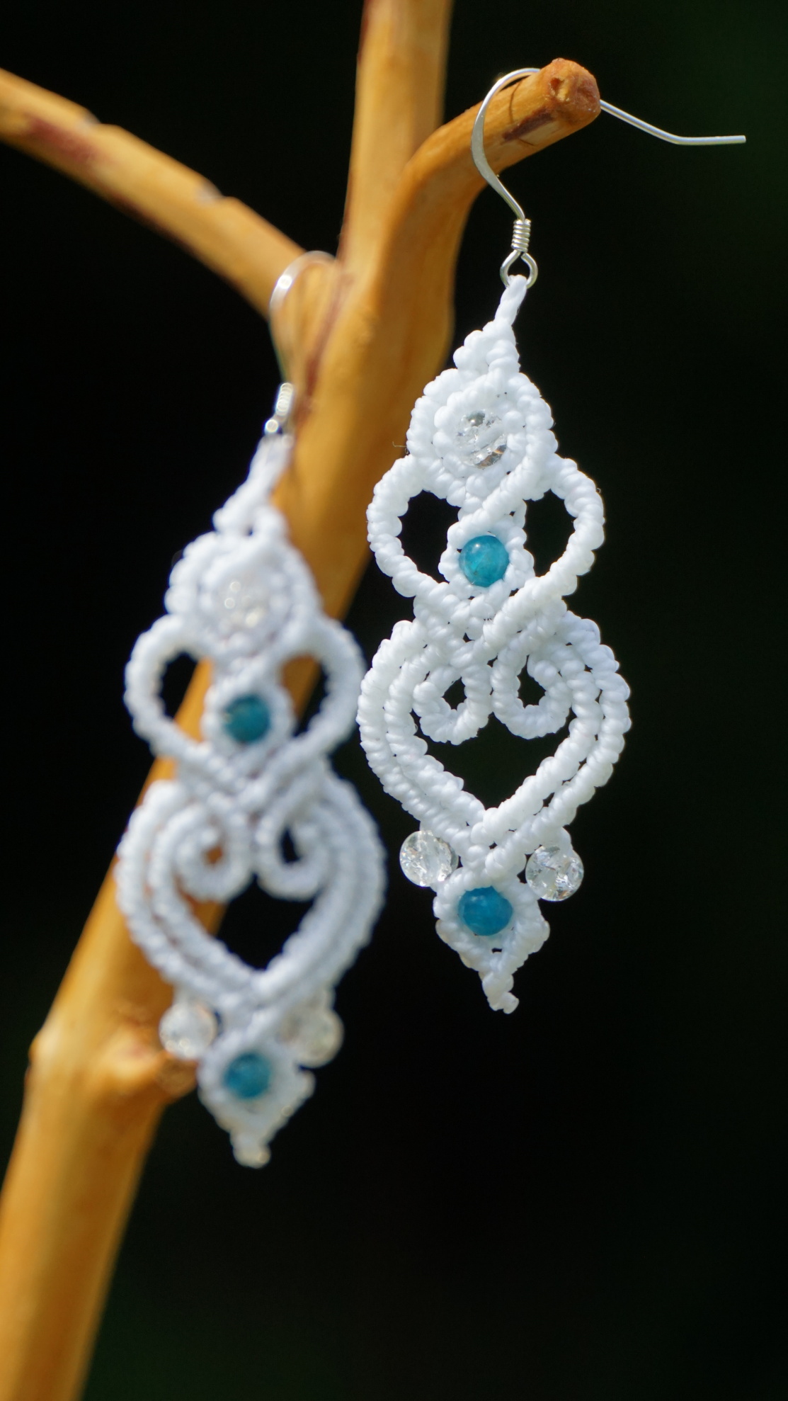 Velmi jemné bílé náušnice s přírodním (nedobarvovaným) apatitem a praskaným křišťálem s afroháčky ze sterlingového stříbra (925 Ag).