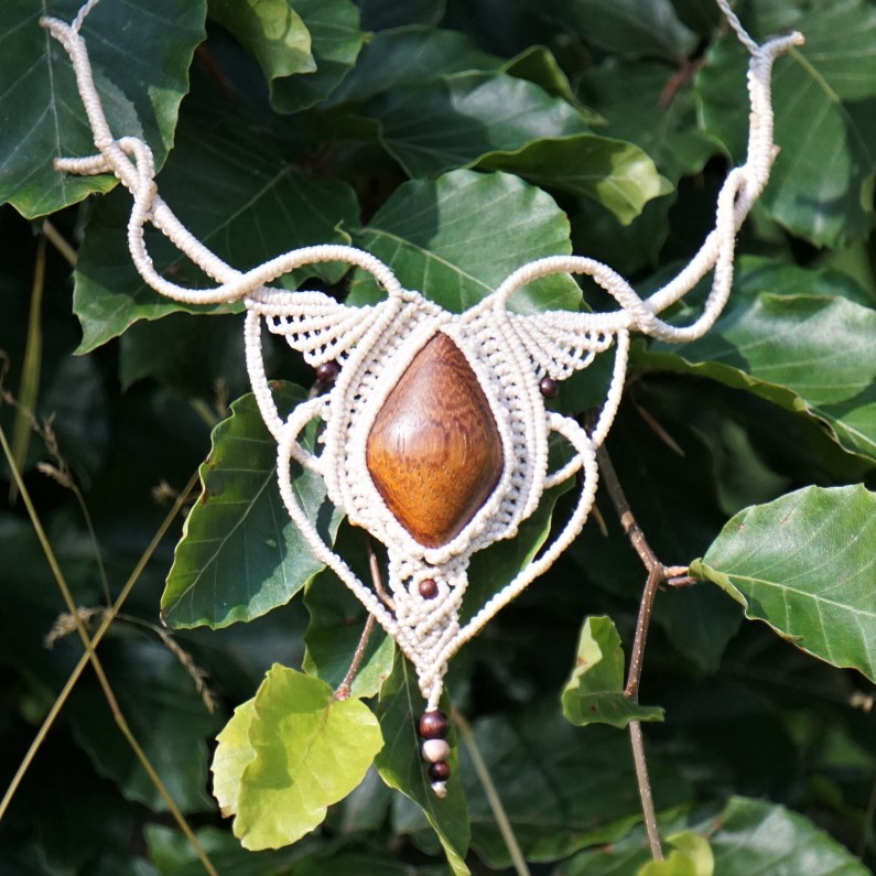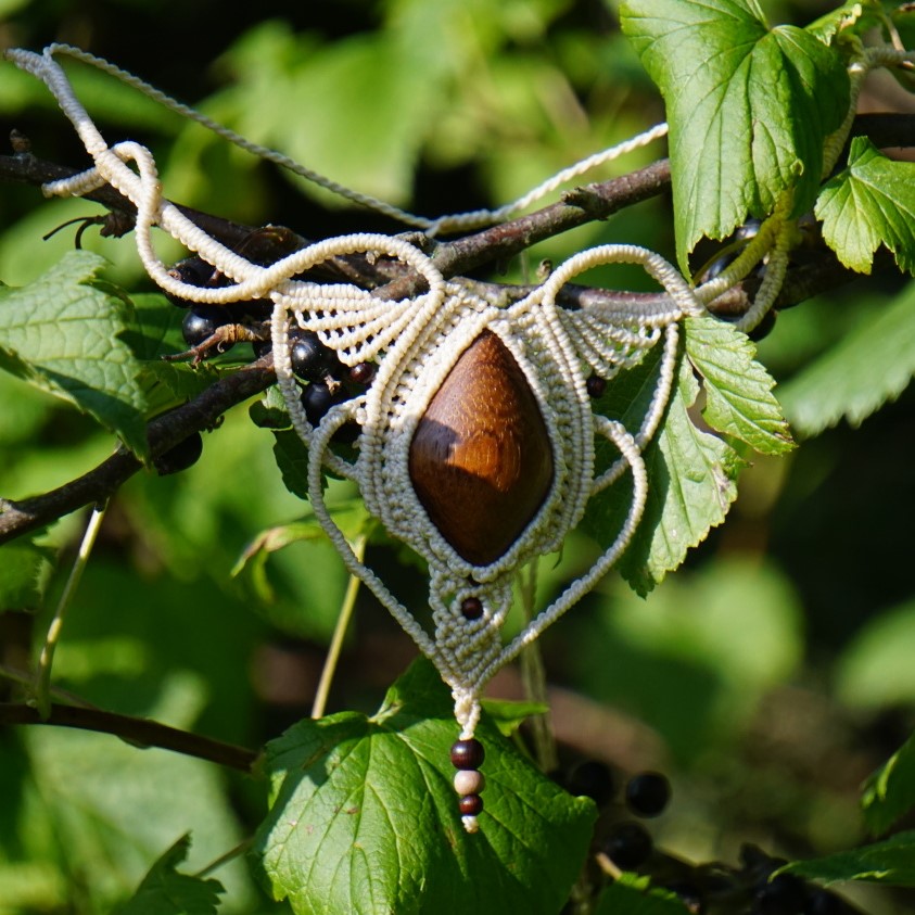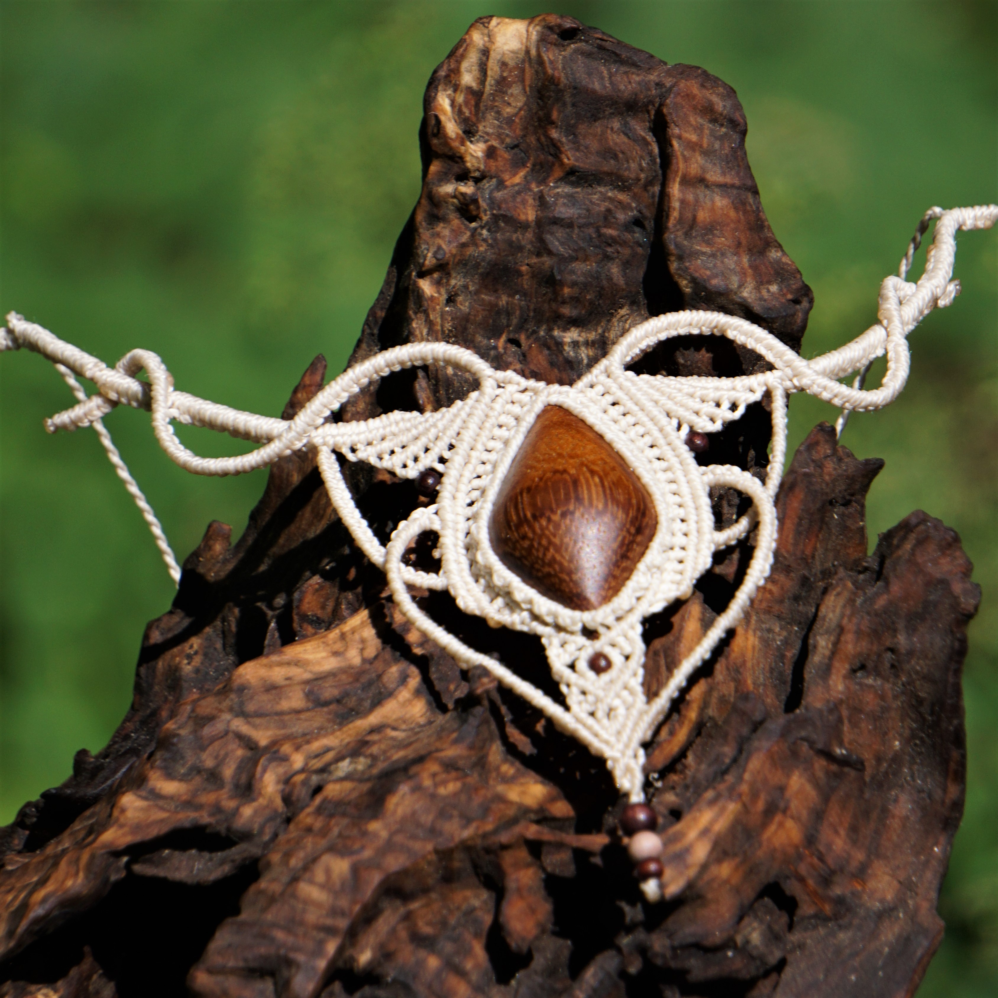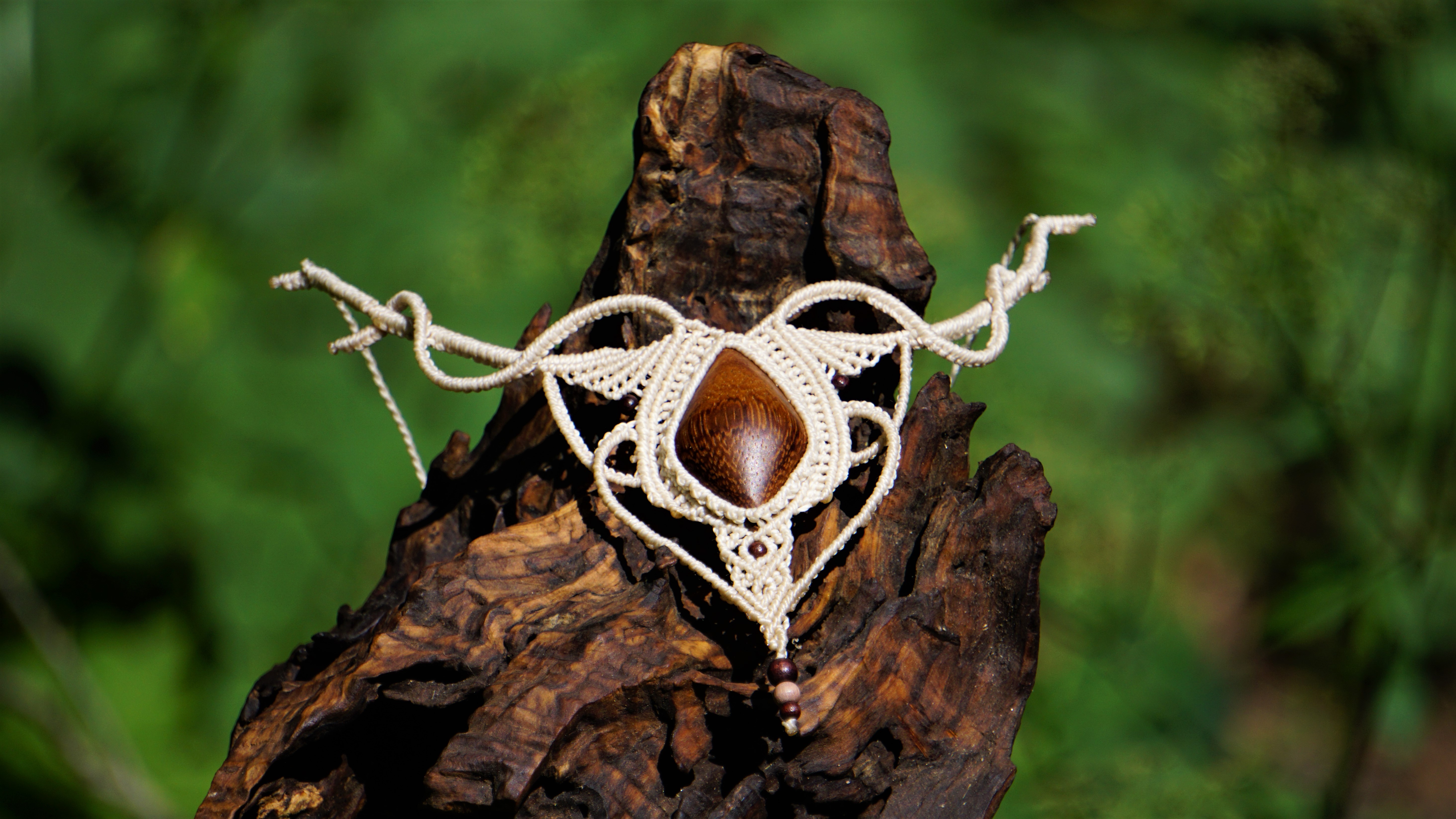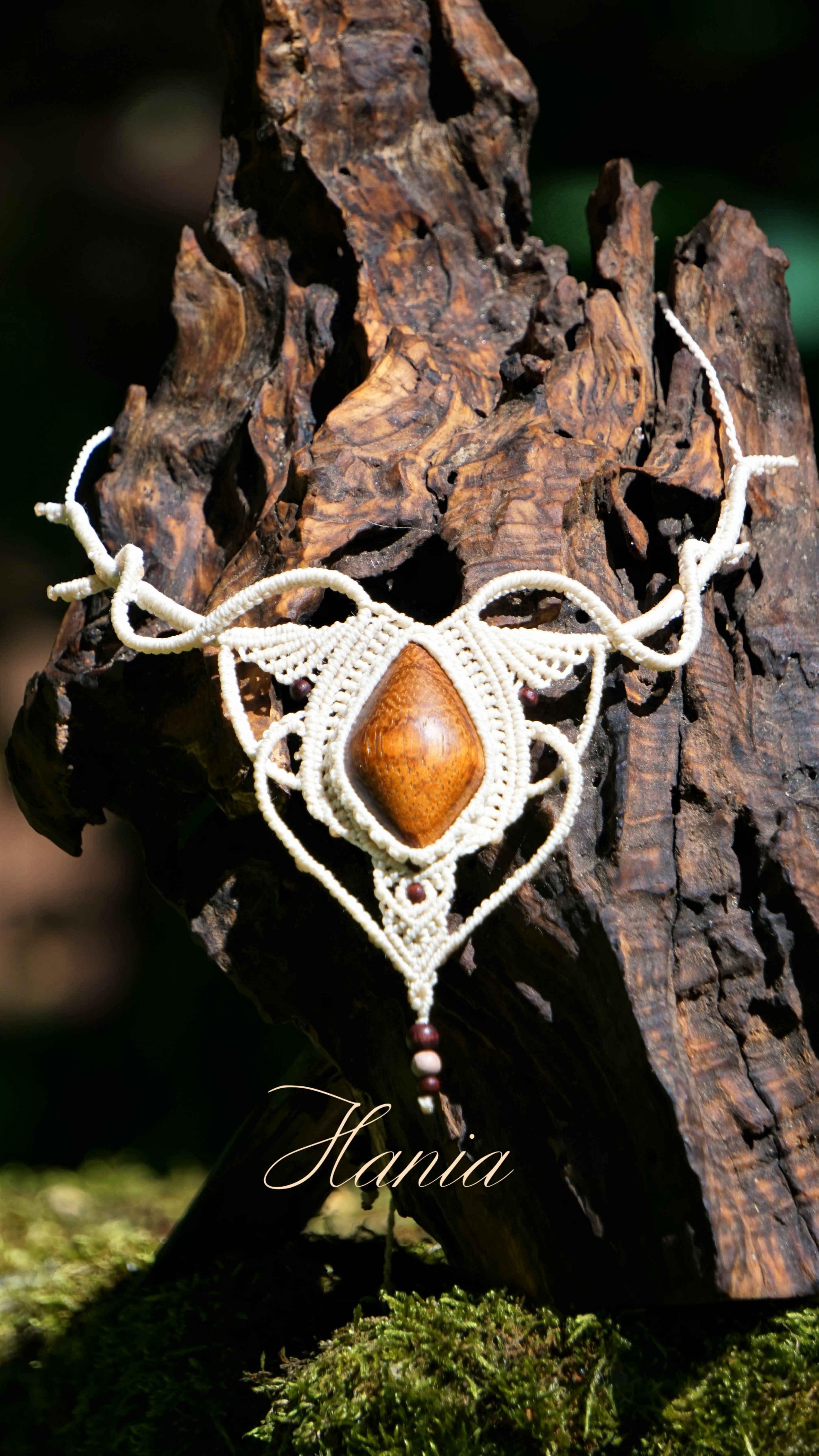 Dřevo uprostřed je ručně vyráběno v domácí dílně od kmene (mým partnerem), vybrušováno a ošetřeno oleji.. Výhodou dřeva je absorbování vonných olejů. Pokud si na spodní stranu šperku kápnete esenciální olej s vaší osobní vůní, proměníte svůj šperk v nositele příjemého aroma nejen pro vás, ale i pro vaše okolí ve velmi jemné a přitažlivé podobě. Stačí 1 kapka za den :-). Centimetrová kostička dřeva má totiž v sobě v podobě cestiček a průduchů plochu o velikosti fotbalového stadionu. Vaše kůže olej zahřívá a proto je esence voňavá velmi dlouho.Šperky vznikly technikou micro macramé, což je uzlíkování pouze za pomoci šikovných prstů a fantasie. Používám brazilské povoskované šňůrky, které jsou jedny z nejkvalitnějších na světě pro svou pevnost a stálobarevnost.