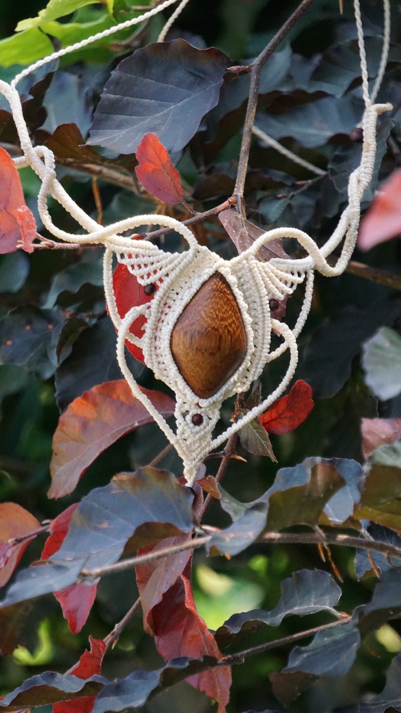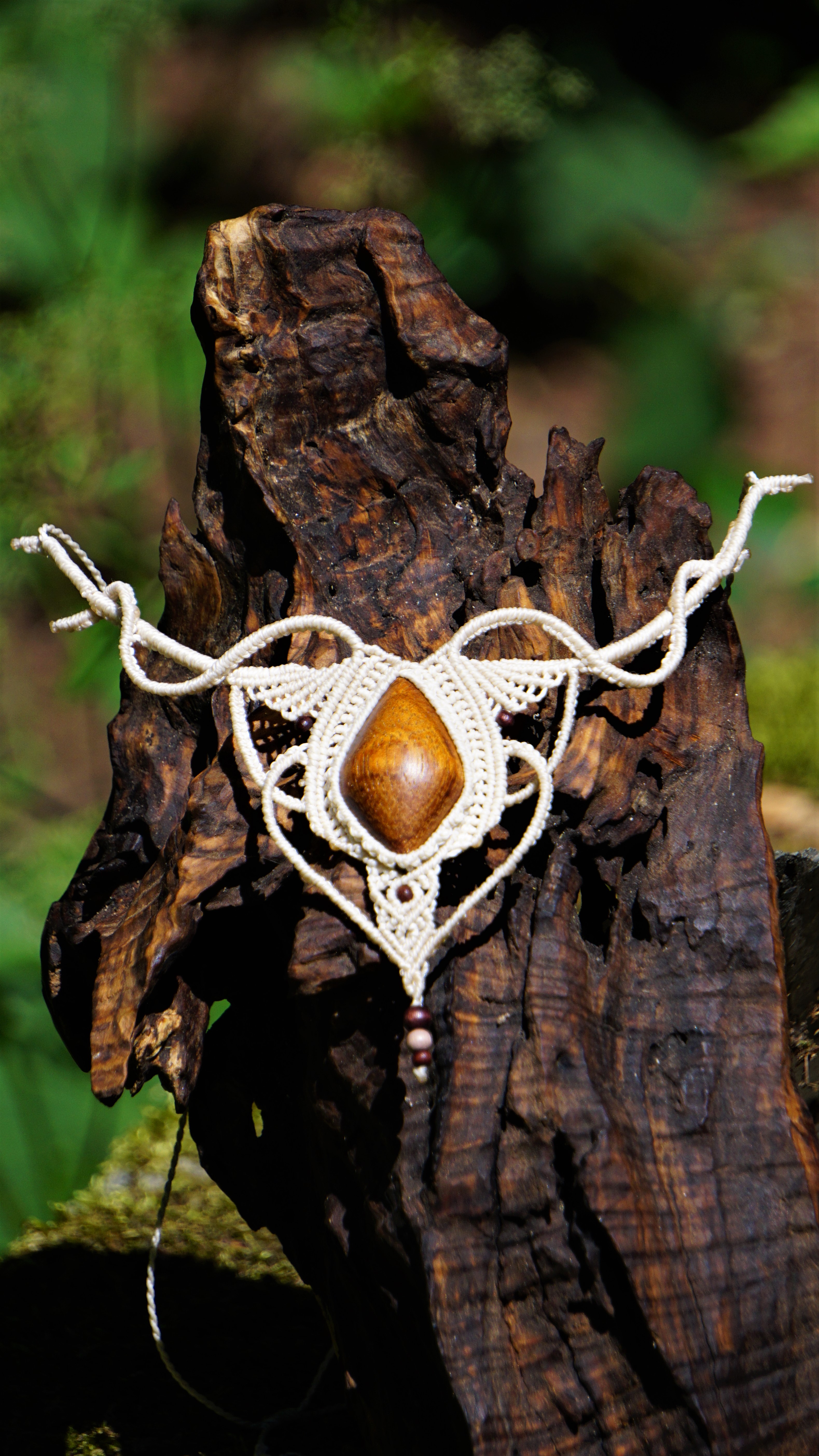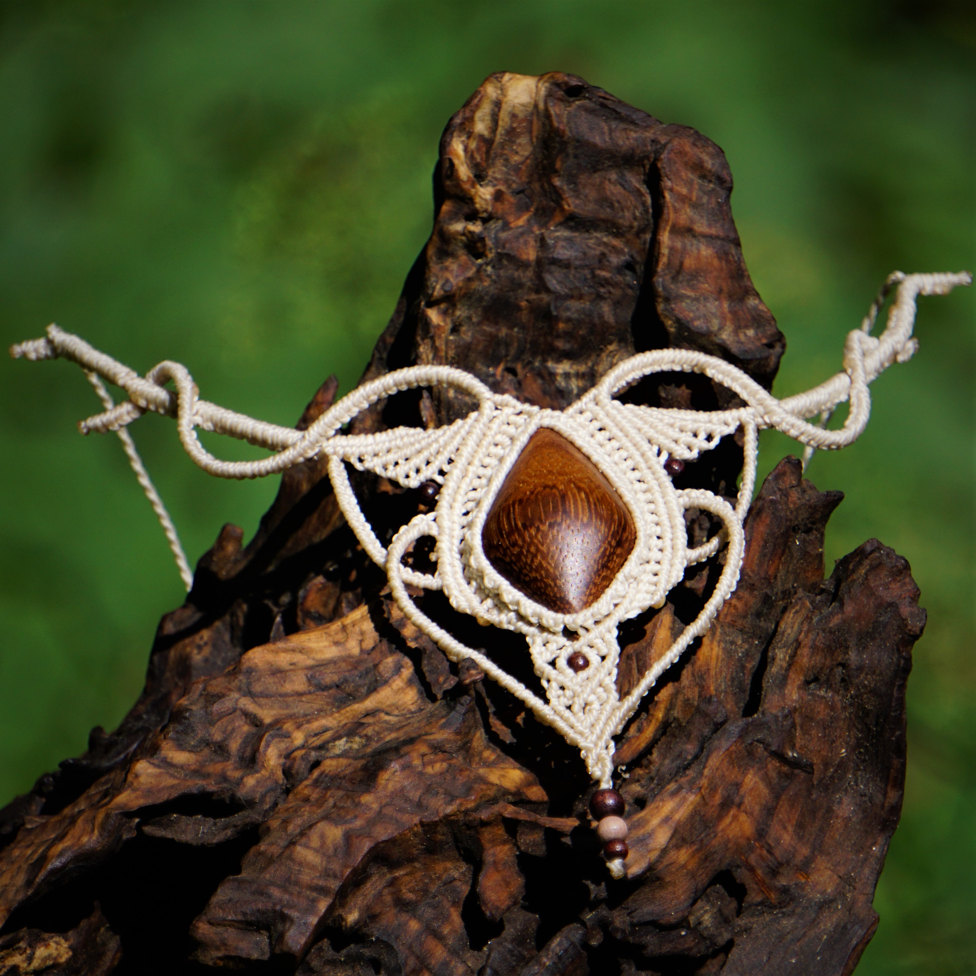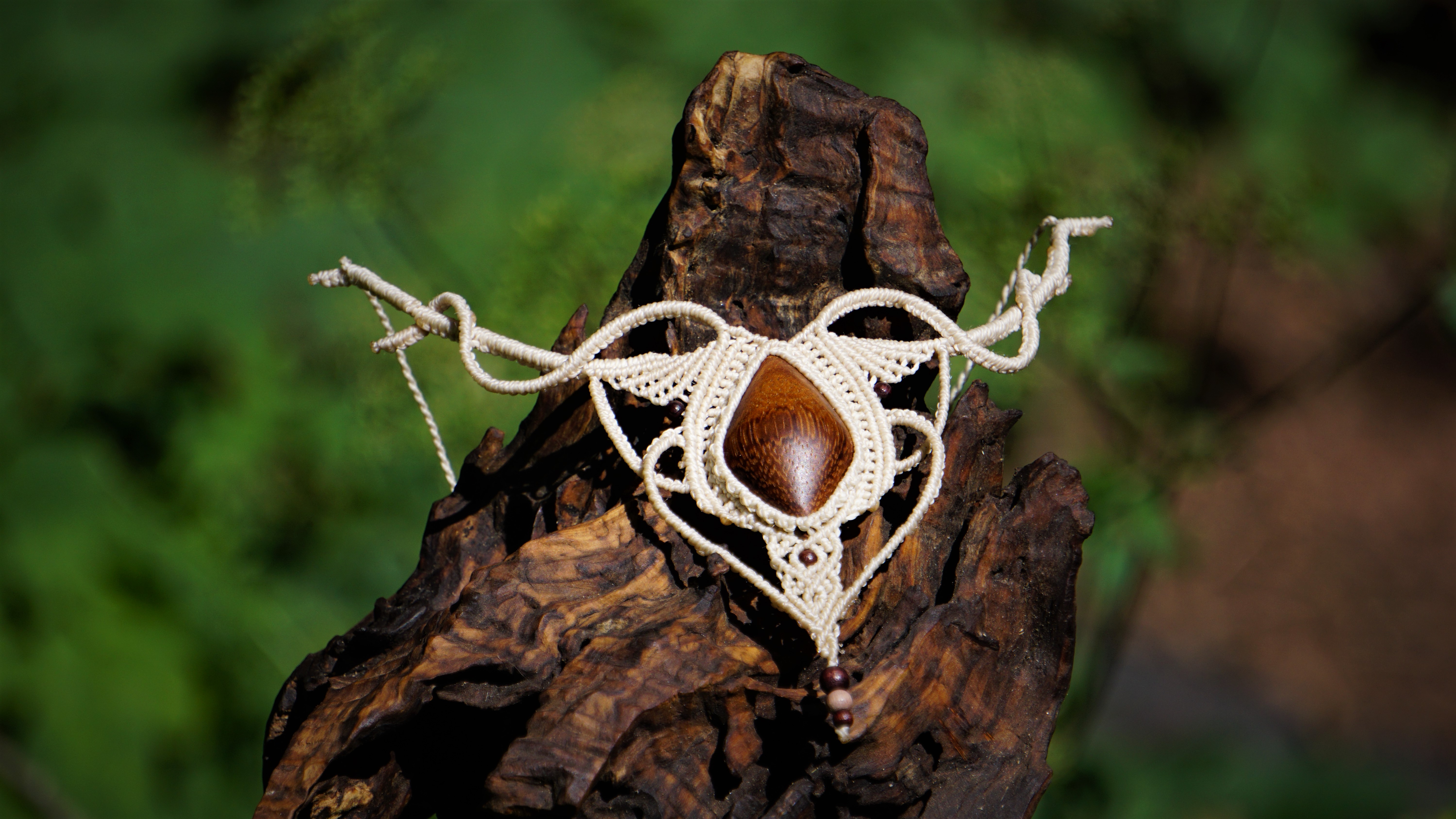 Dřevo uprostřed je ručně vyráběno v domácí dílně od kmene (mým partnerem), vybrušováno a ošetřeno oleji.. Výhodou dřeva je absorbování vonných olejů. Pokud si na spodní stranu šperku kápnete esenciální olej s vaší osobní vůní, proměníte svůj šperk v nositele příjemého aroma nejen pro vás, ale i pro vaše okolí ve velmi jemné a přitažlivé podobě. Stačí 1 kapka za den :-). Centimetrová kostička dřeva má totiž v sobě v podobě cestiček a průduchů plochu o velikosti fotbalového stadionu. Vaše kůže olej zahřívá a proto je esence voňavá velmi dlouho.Šperky vznikly technikou micro macramé, což je uzlíkování pouze za pomoci šikovných prstů a fantasie. Používám brazilské povoskované šňůrky, které jsou jedny z nejkvalitnějších na světě pro svou pevnost a stálobarevnost.