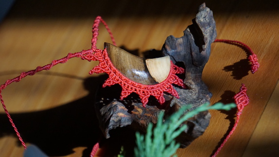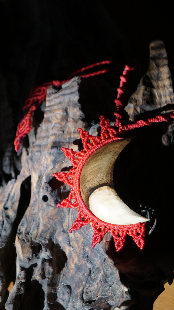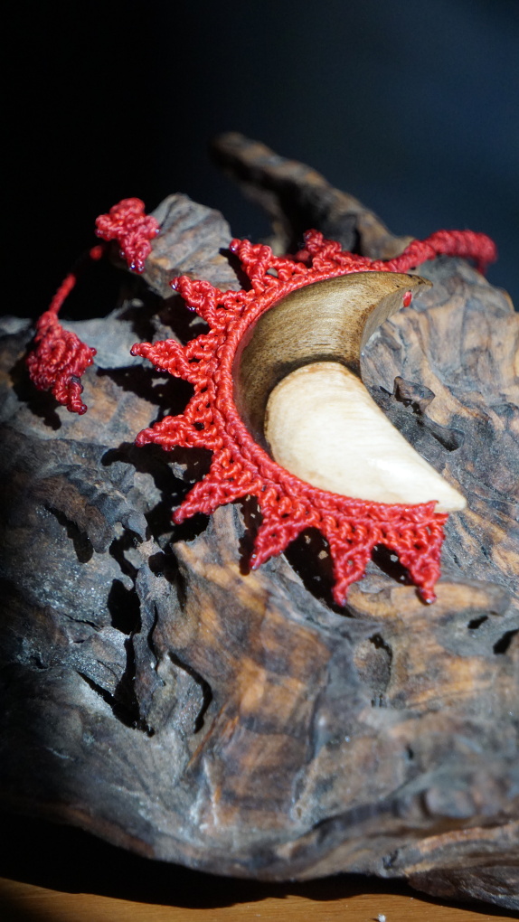 Šperk vznikl technikou micro macramé, což je uzlíkování pouze za pomoci šikovných prstů a fantasie. Používám brazilské povoskované šňůrky, které jsou jedny z nejkvalitnějších na světě pro svou pevnost a stálobarevnost. Šňůrky je možné ručně vyprat ve vlažné mýdlové lázni, vysušit v ručníku a nechat volně uschnout.