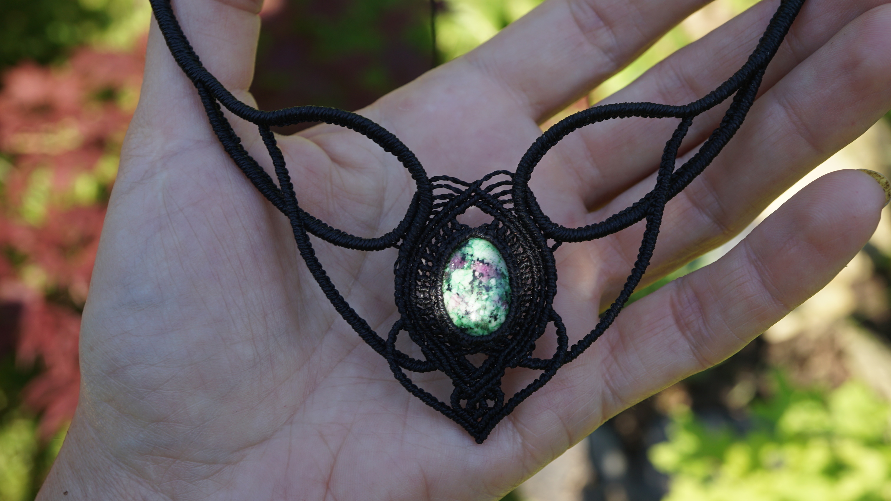 Náhrdelník je na utahování, takže též umožňuje různou délku závěsu. Boky náhrdelníku jsou tvarovatelné, můžete tedy i jemně upravit tvar podle své šíje. Použila jsem extra jemné brazilské povoskované nitky černé barvy a síle 0,5 mm. Práce je velmi precizní a několikahodinová. Na konci jsou dva minerální korálky z přírodního obsidiánu.