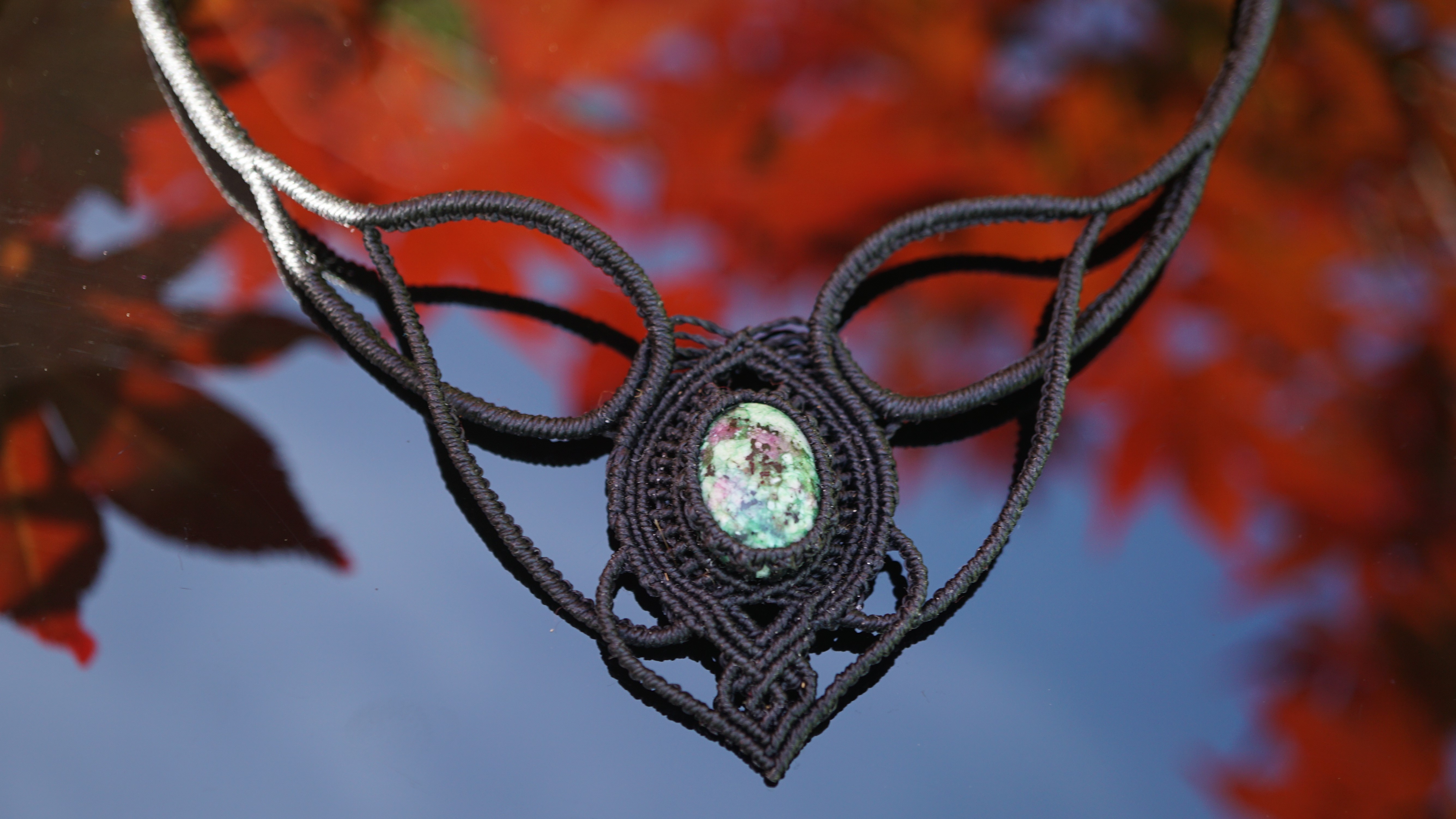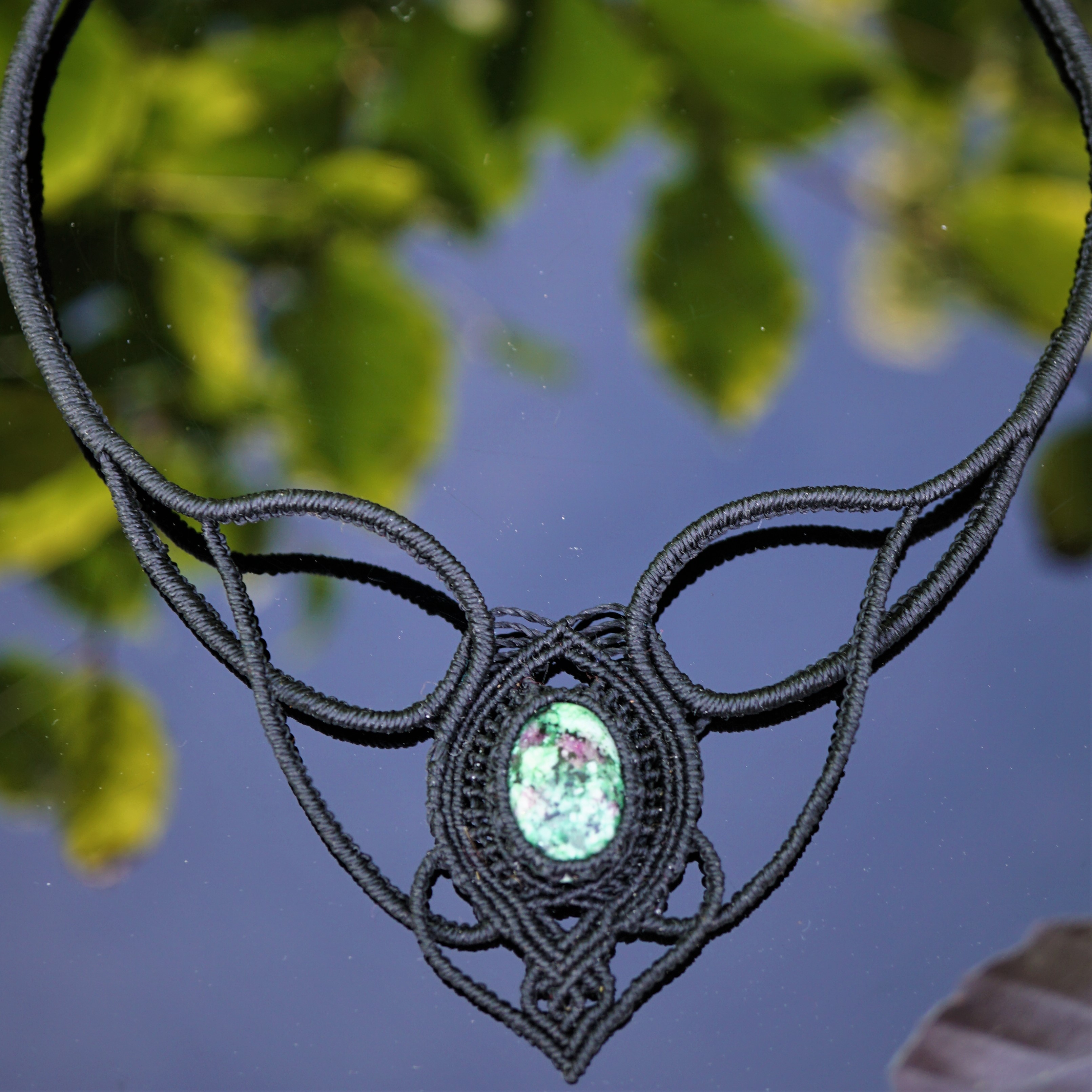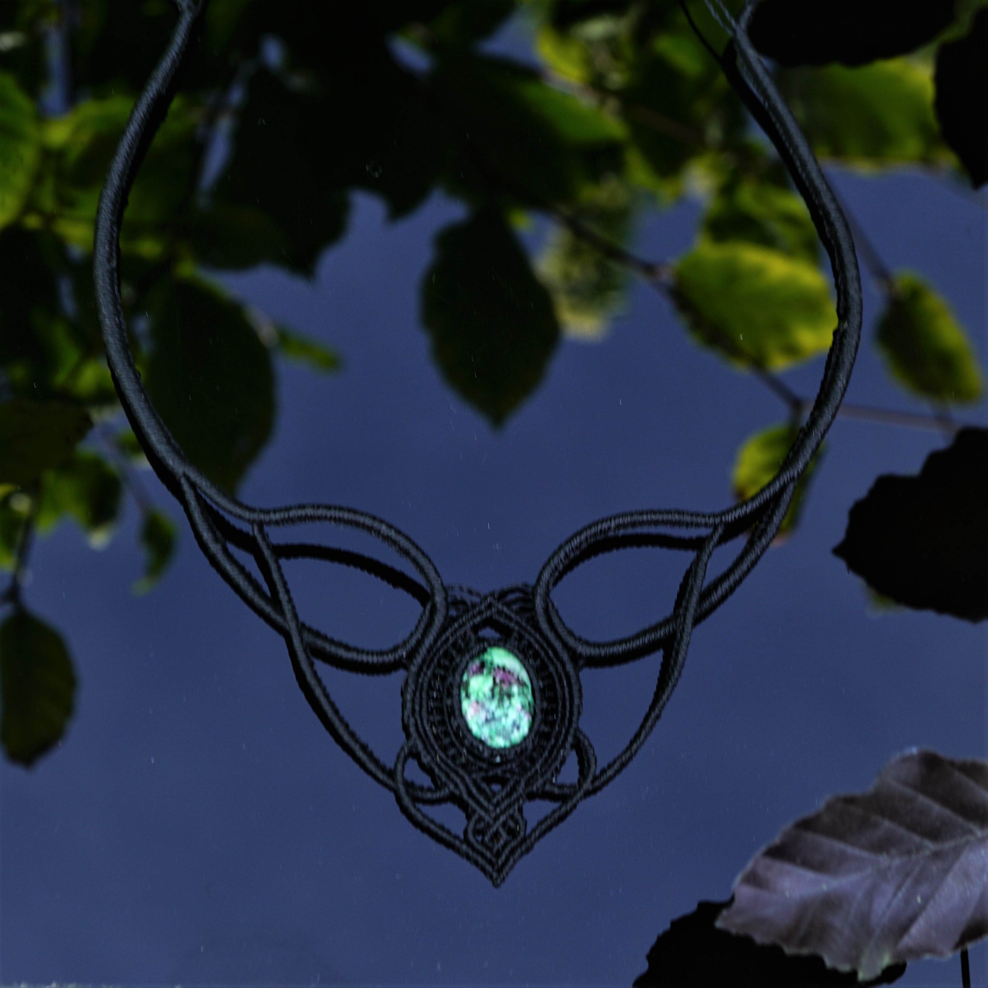 Náhrdelník je na utahování, takže též umožňuje různou délku závěsu. Boky náhrdelníku jsou tvarovatelné, můžete tedy i jemně upravit tvar podle své šíje. Použila jsem extra jemné brazilské povoskované nitky černé barvy a síle 0,5 mm. Práce je velmi precizní a několikahodinová. Na konci jsou dva minerální korálky z přírodního obsidiánu.