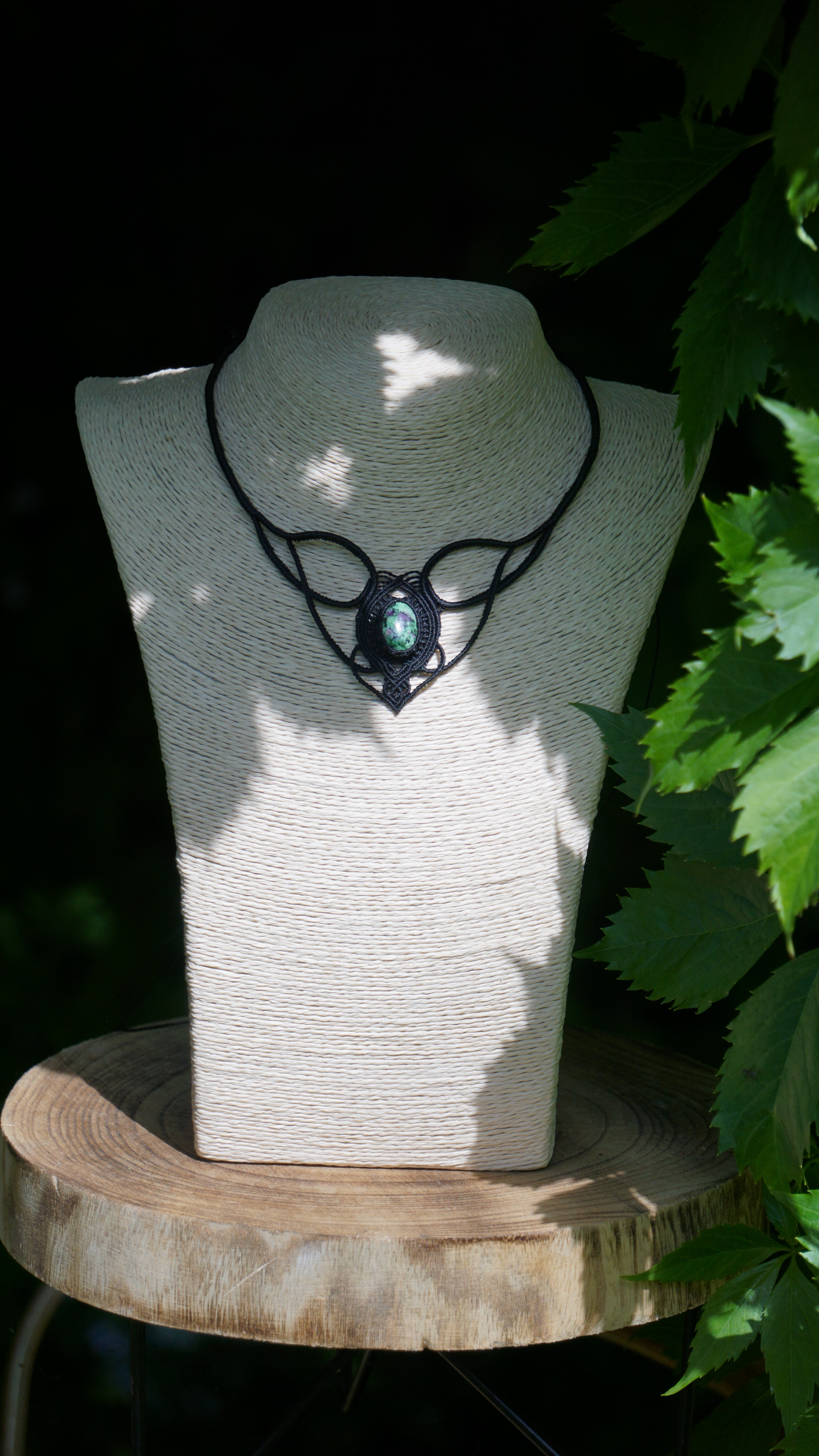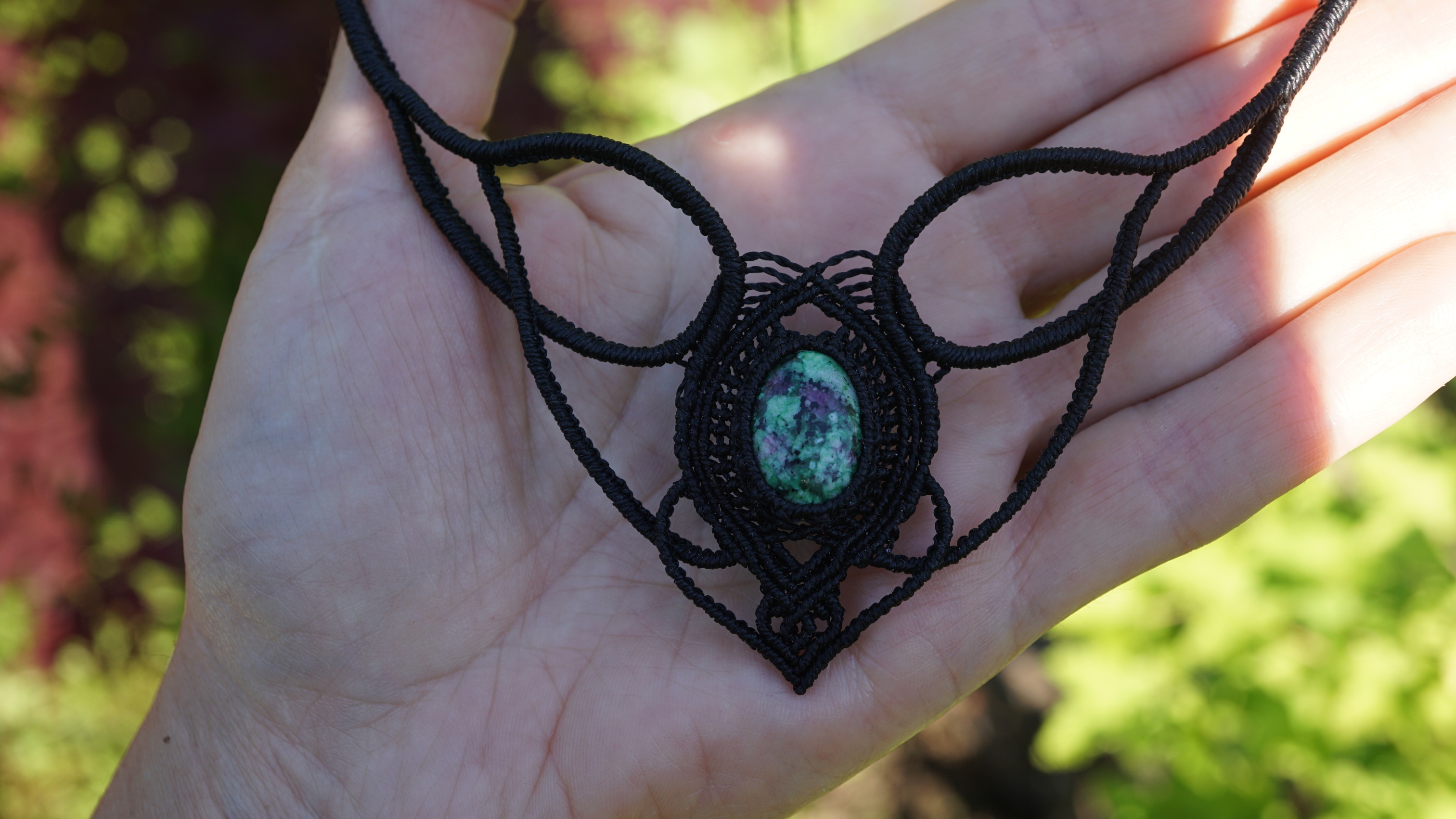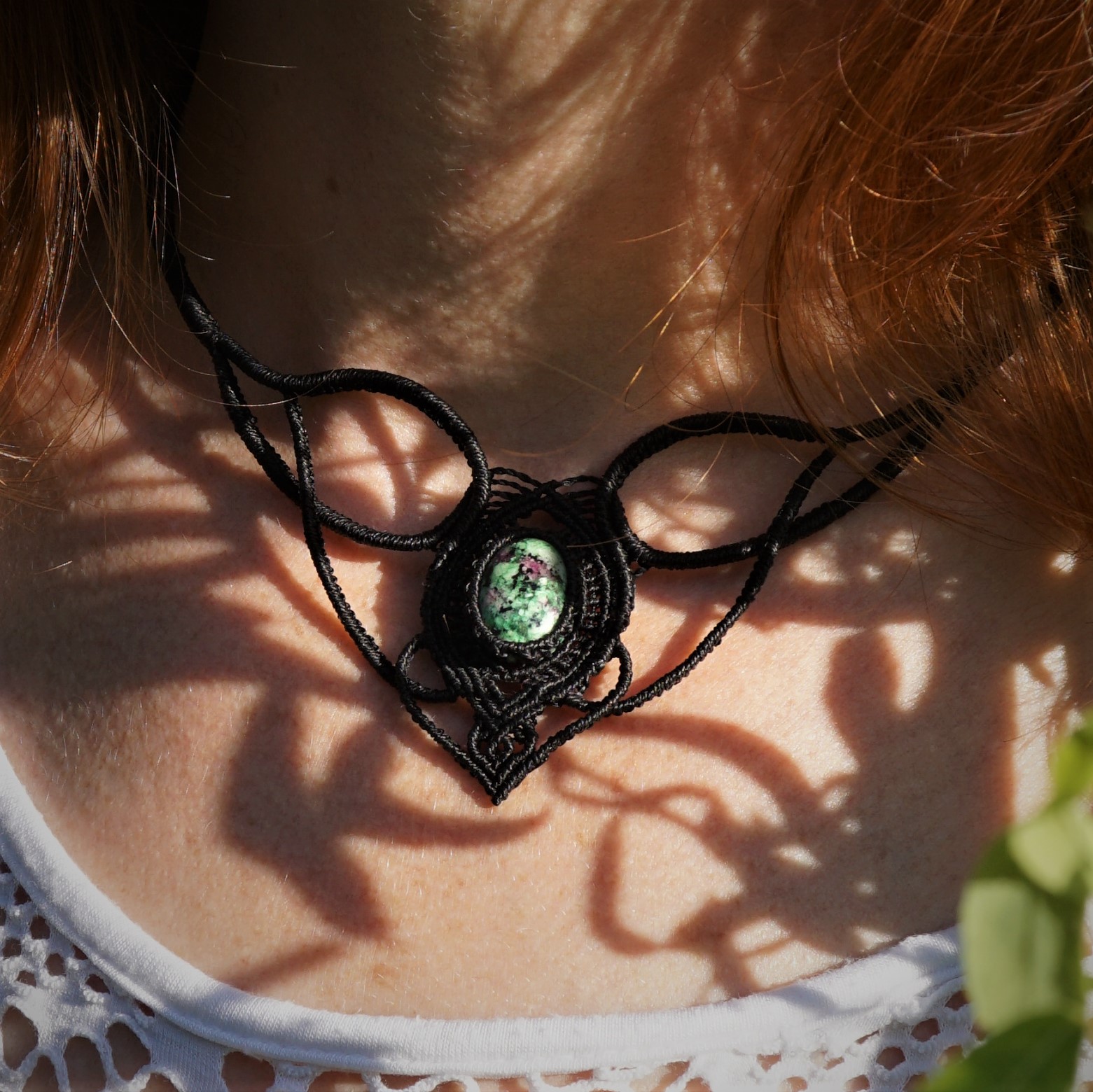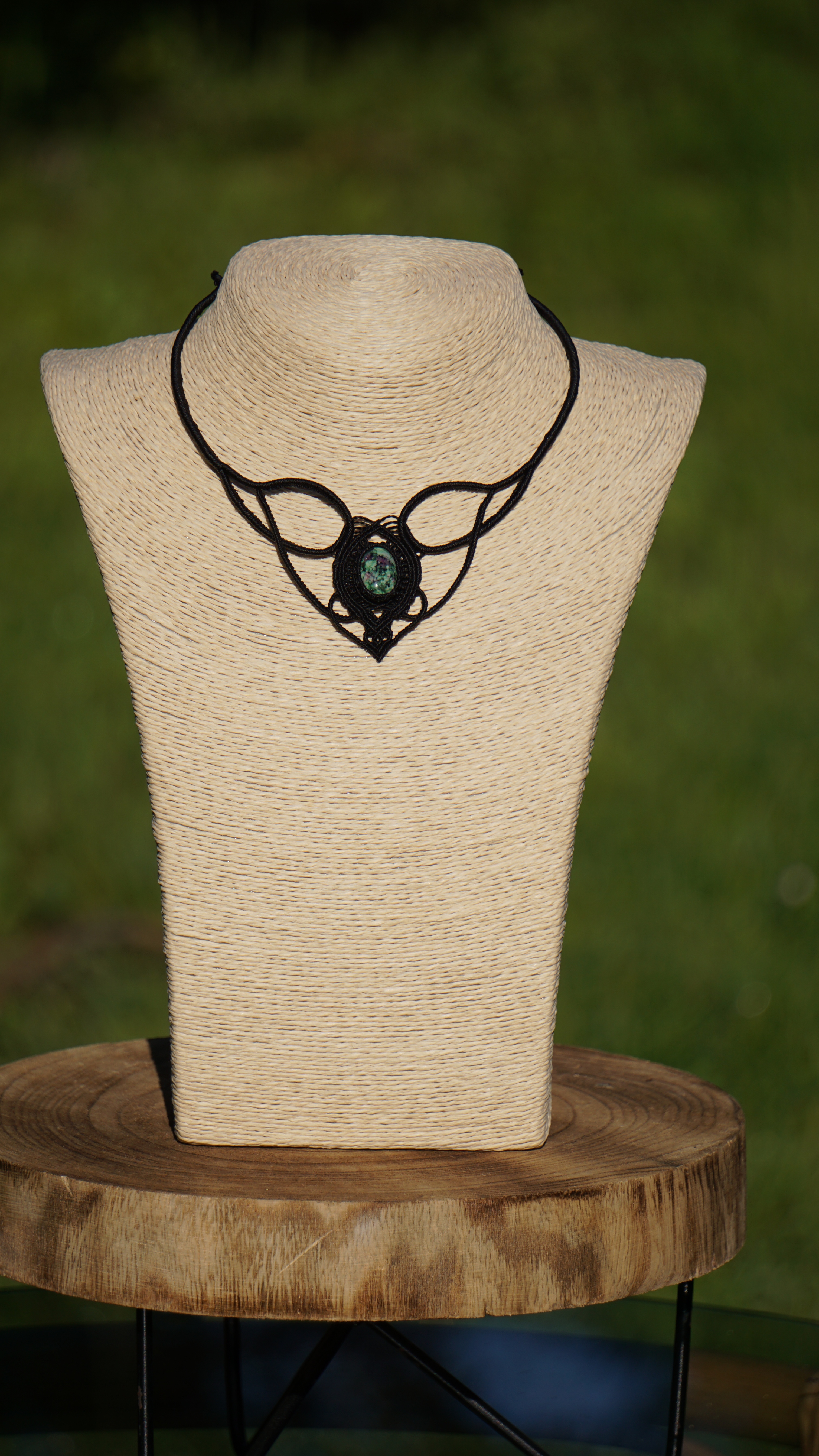 Náhrdelník je na utahování, takže též umožňuje různou délku závěsu. Boky náhrdelníku jsou tvarovatelné, můžete tedy i jemně upravit tvar podle své šíje. Použila jsem extra jemné brazilské povoskované nitky černé barvy a síle 0,5 mm. Práce je velmi precizní a několikahodinová. Na konci jsou dva minerální korálky z přírodního obsidiánu.