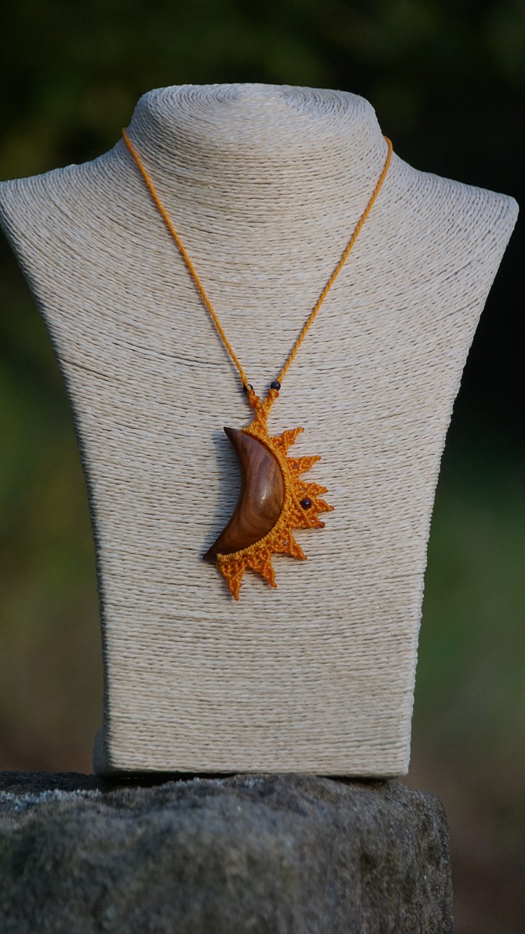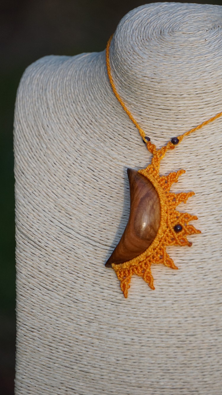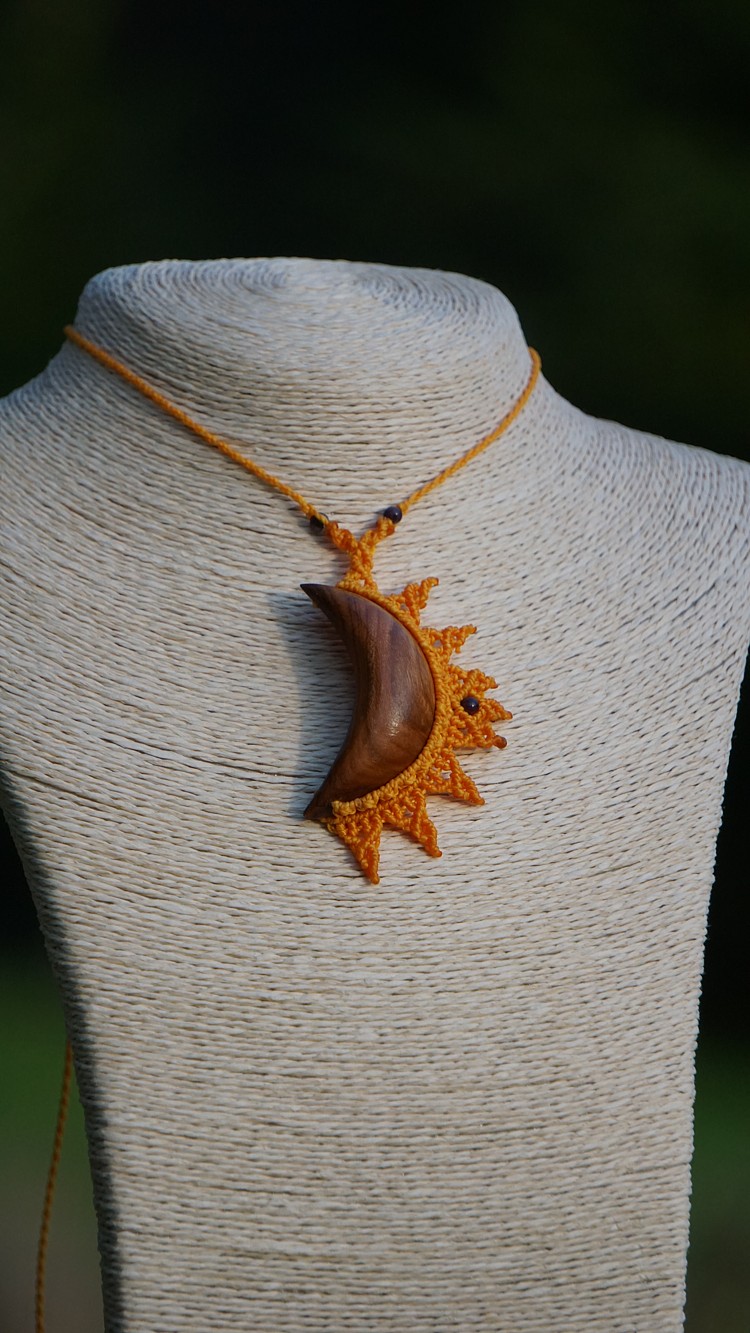Šperk vznikl technikou micro macramé, což je uzlíkování pouze za pomoci šikovných prstů a fantasie. Používám brazilské povoskované šňůrky, které jsou jedny z nejkvalitnějších na světě pro svou pevnost a stálobarevnost. Šňůrky je možné ručně vyprat ve vlažné mýdlové lázni, vysušit v ručníku a nechat volně uschnout.