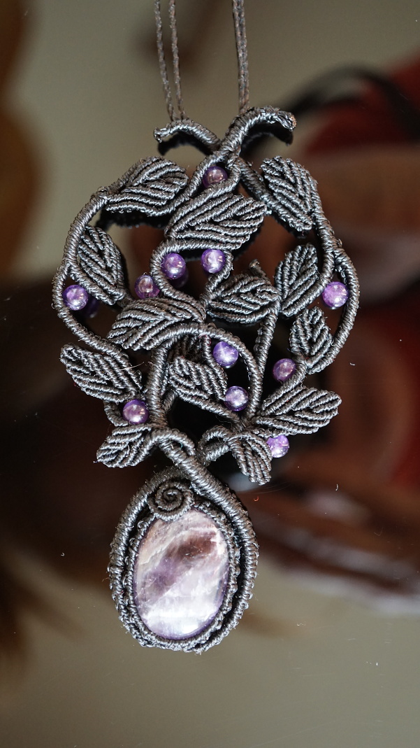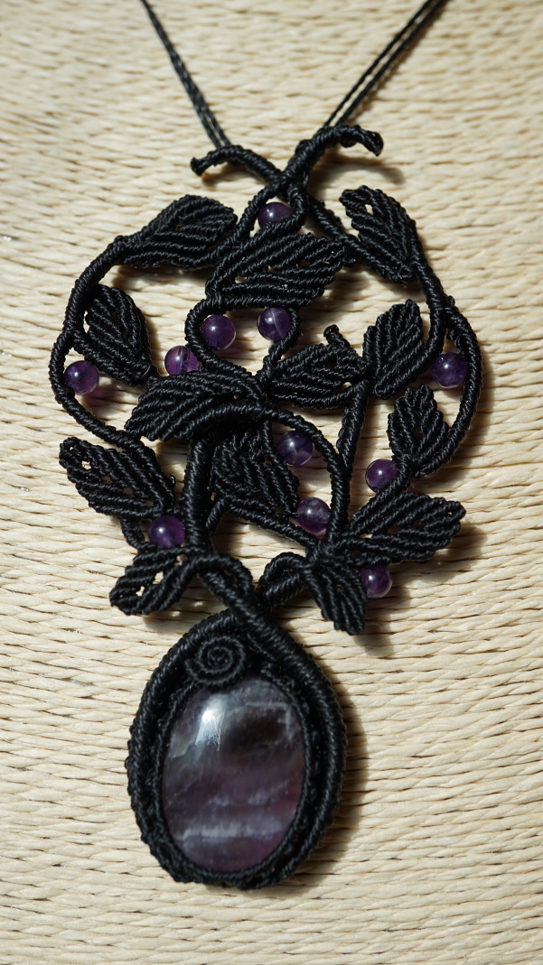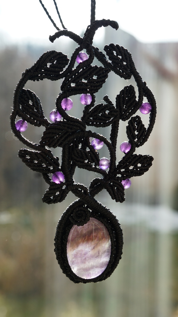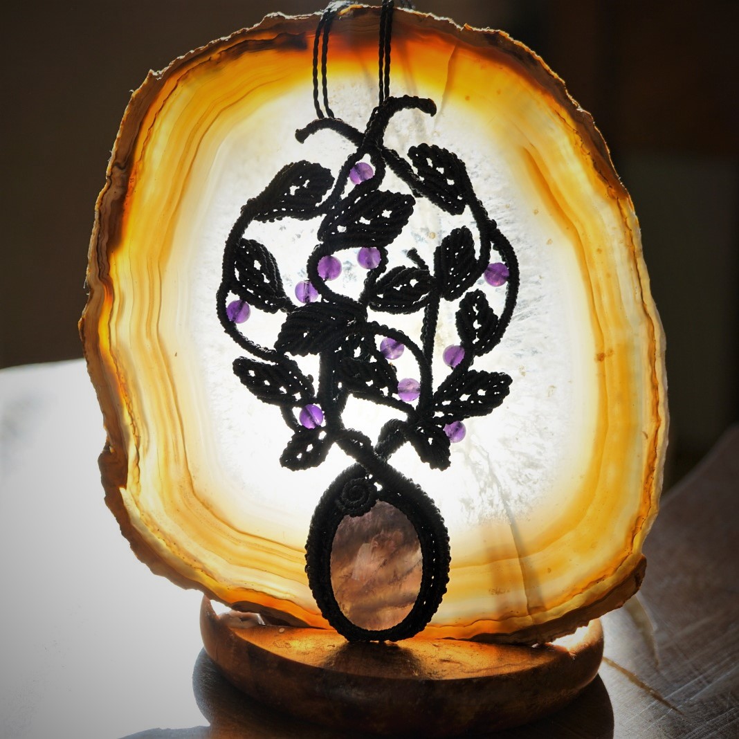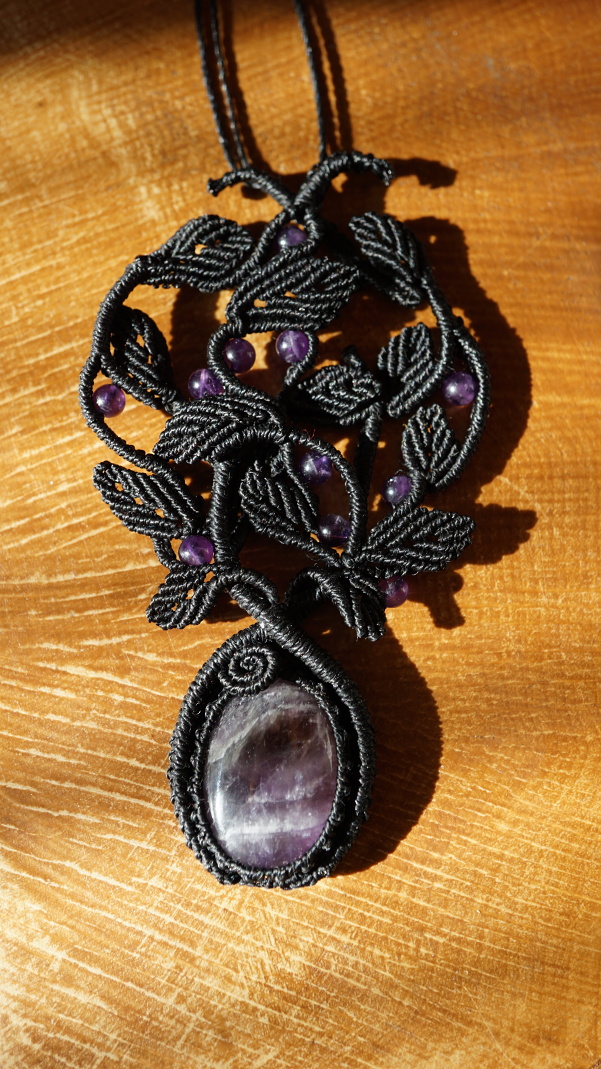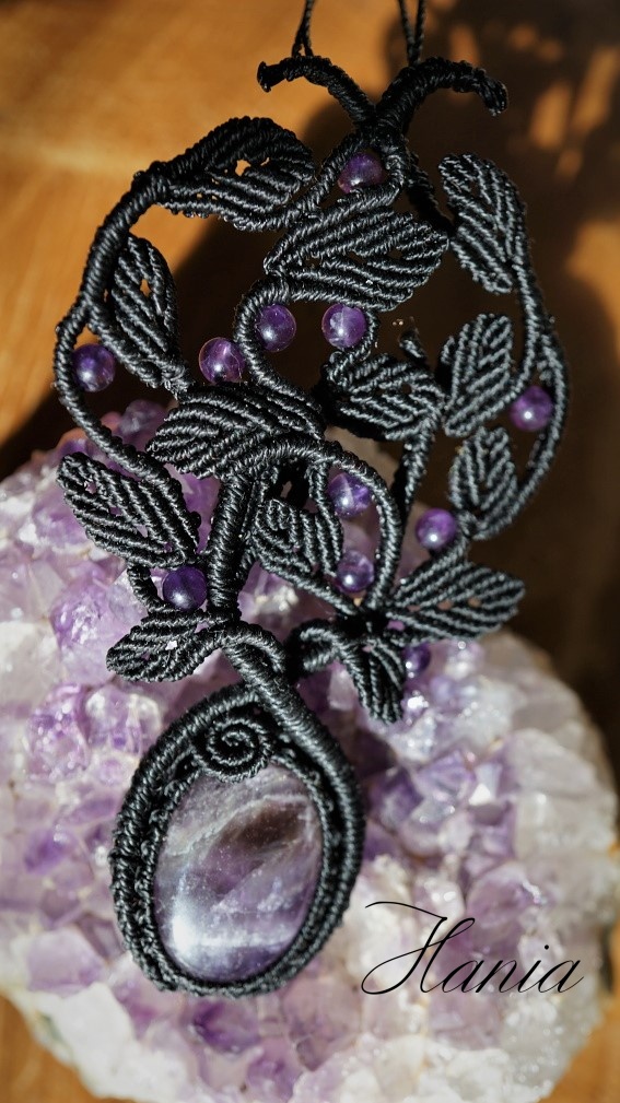 Šperk vznikl technikou micro macramé, což je uzlíkování pouze za pomoci šikovných prstů a fantasie. Používám brazilské povoskované šňůrky, které jsou jedny z nejkvalitnějších na světě pro svou pevnost a stálobarevnost. Šňůrky je možné ručně vyprat ve vlažné mýdlové lázni, vysušit v ručníku a nechat volně uschnout.