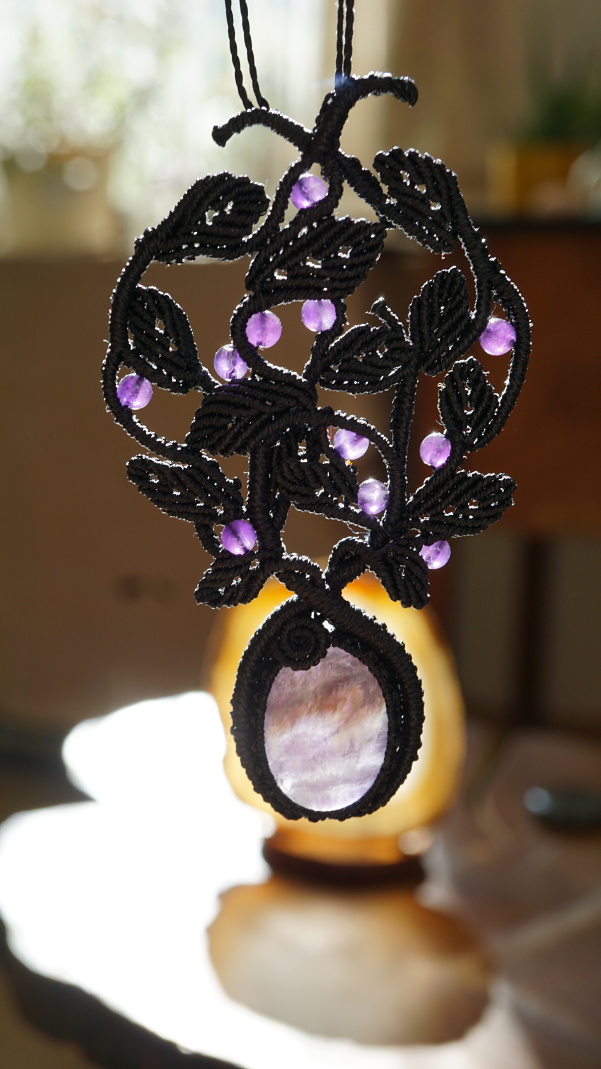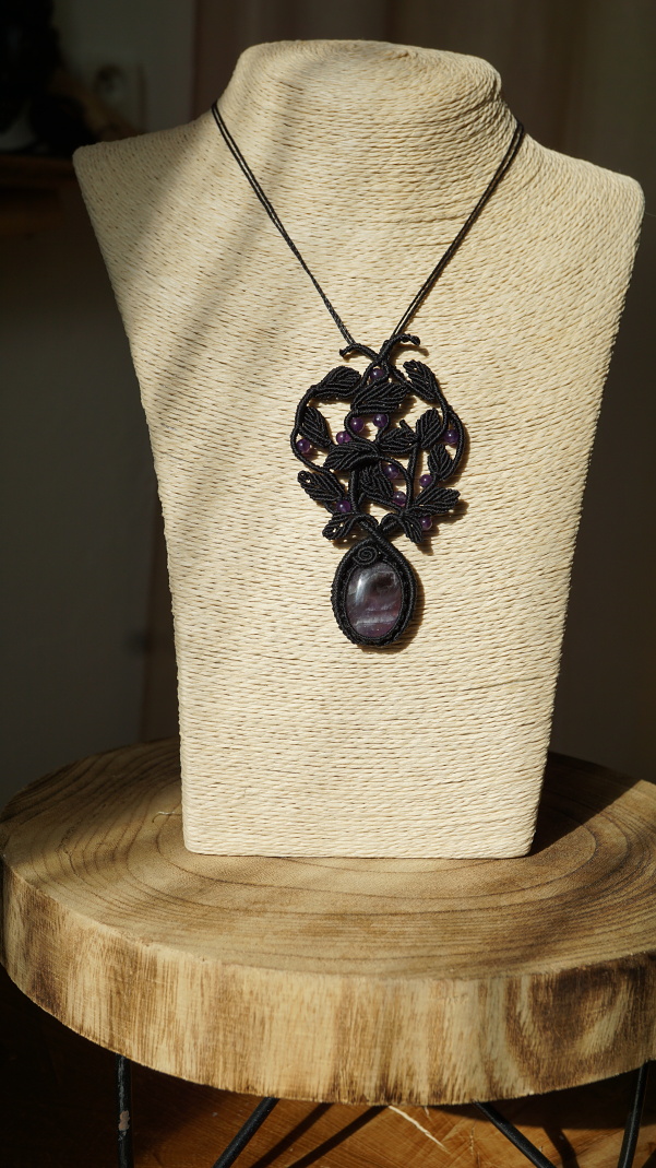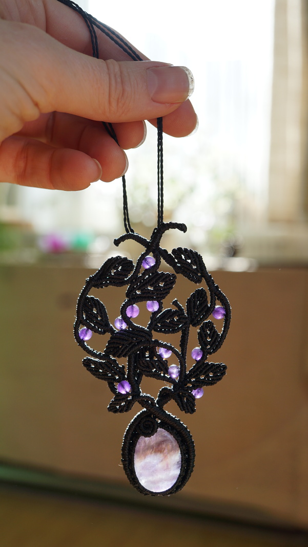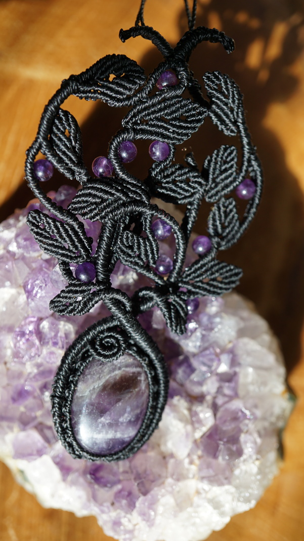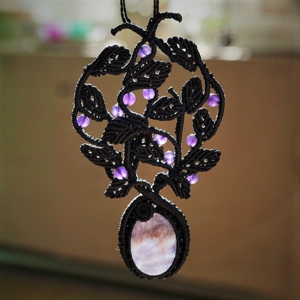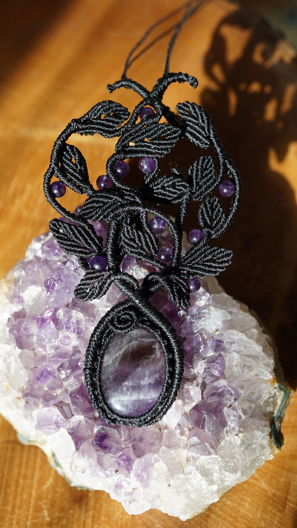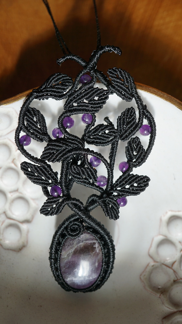 Šperk vznikl technikou micro macramé, což je uzlíkování pouze za pomoci šikovných prstů a fantasie. Používám brazilské povoskované šňůrky, které jsou jedny z nejkvalitnějších na světě pro svou pevnost a stálobarevnost. Šňůrky je možné ručně vyprat ve vlažné mýdlové lázni, vysušit v ručníku a nechat volně uschnout.
