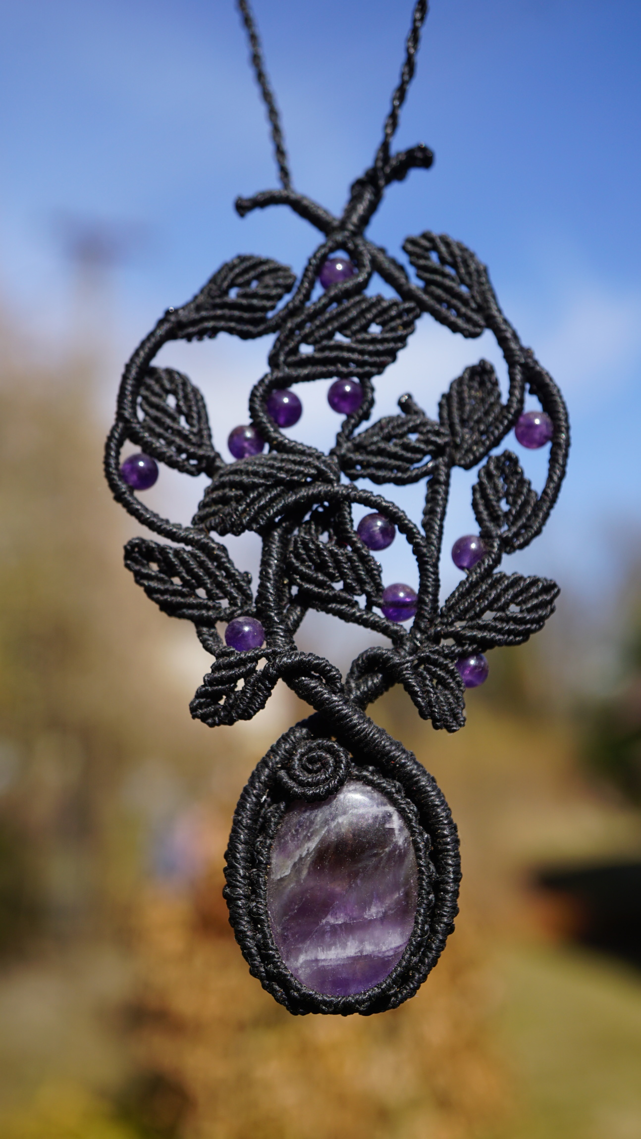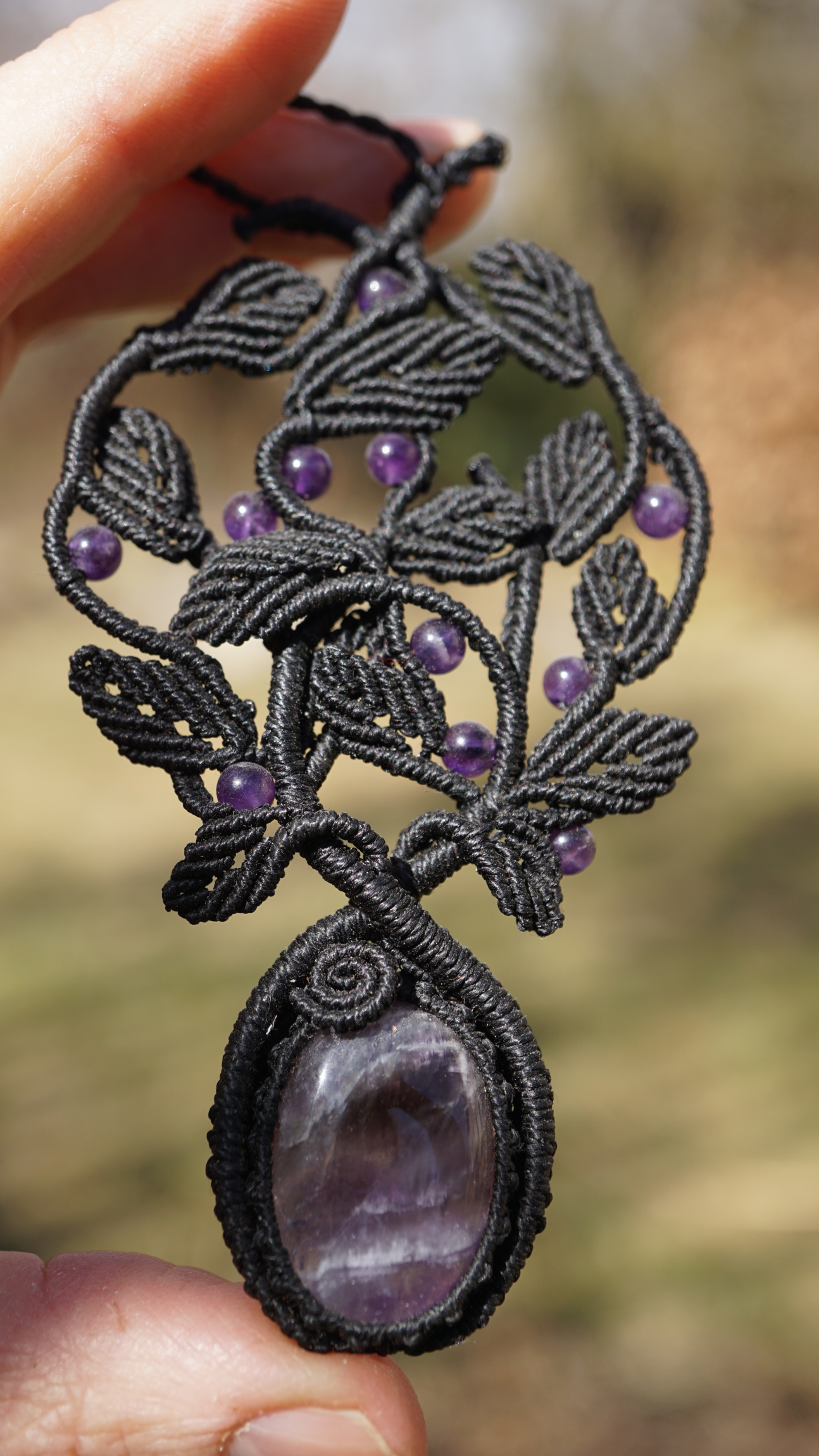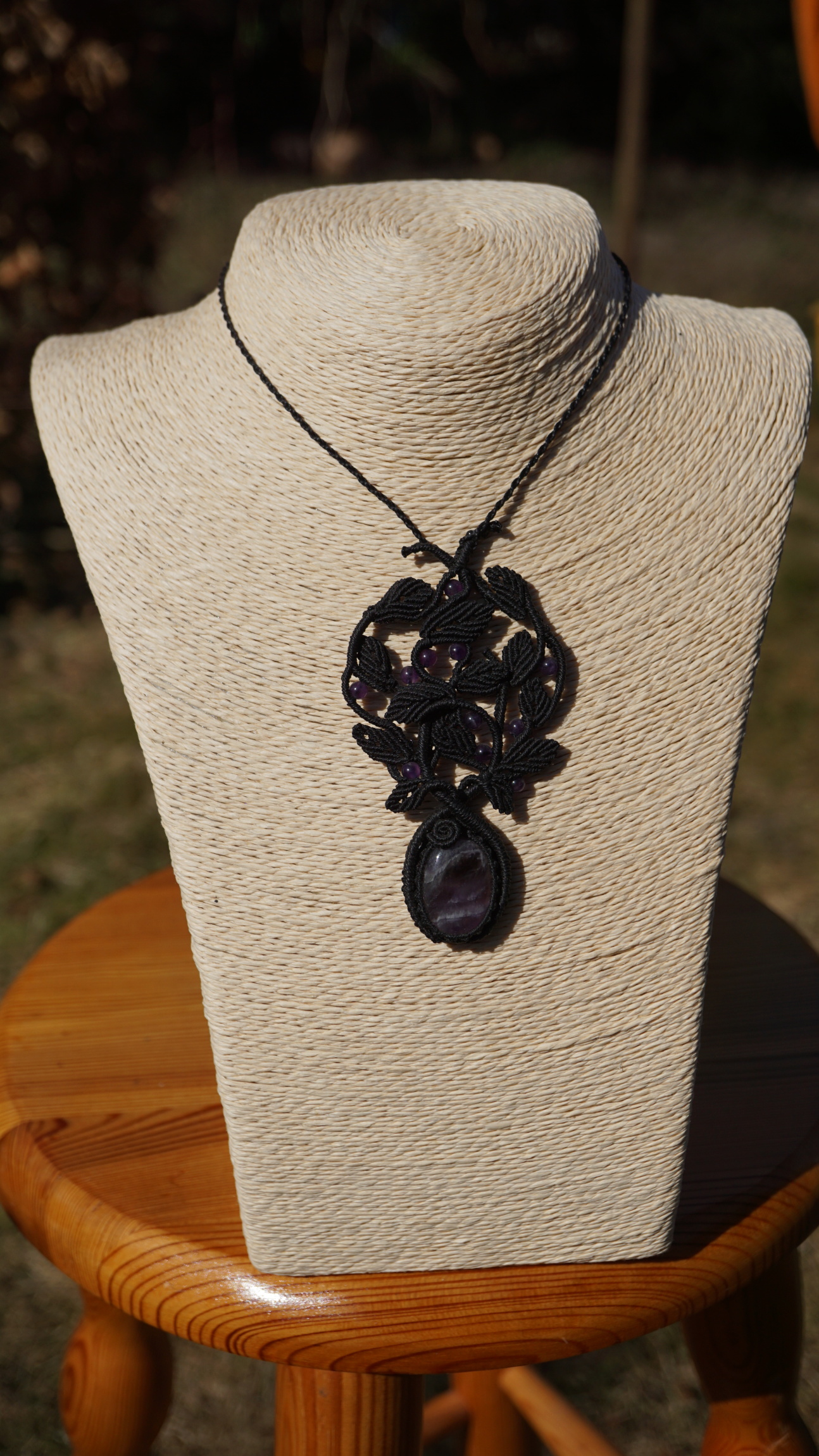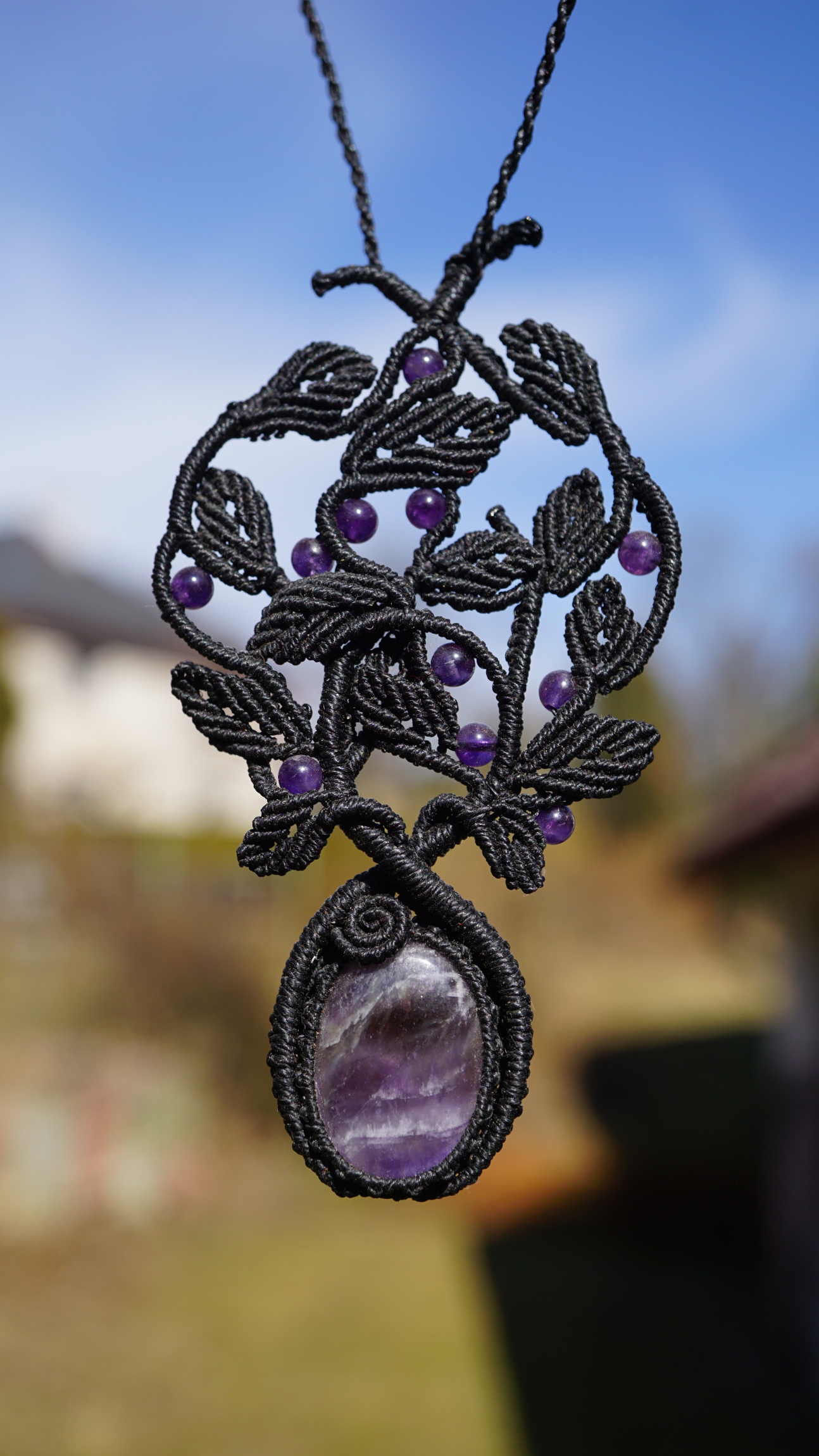 Šperk vznikl technikou micro macramé, což je uzlíkování pouze za pomoci šikovných prstů a fantasie. Používám brazilské povoskované šňůrky, které jsou jedny z nejkvalitnějších na světě pro svou pevnost a stálobarevnost. Šňůrky je možné ručně vyprat ve vlažné mýdlové lázni, vysušit v ručníku a nechat volně uschnout.