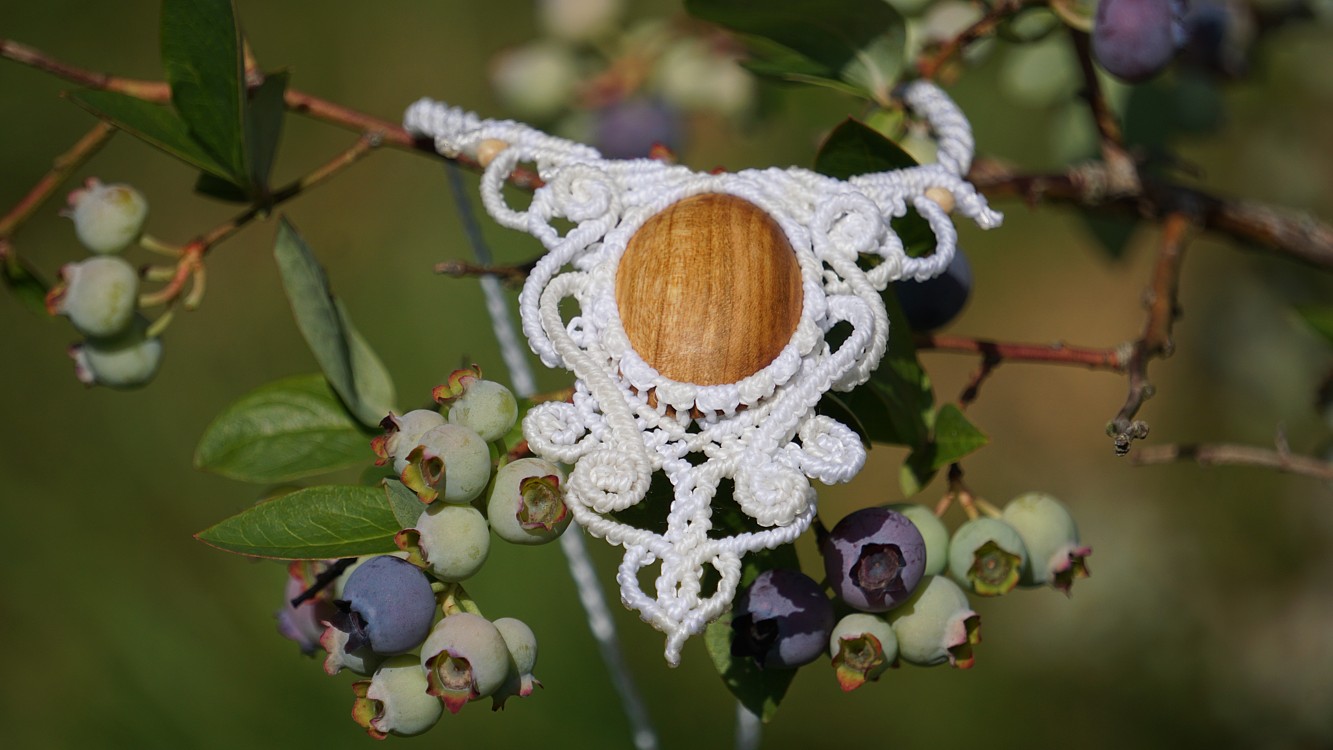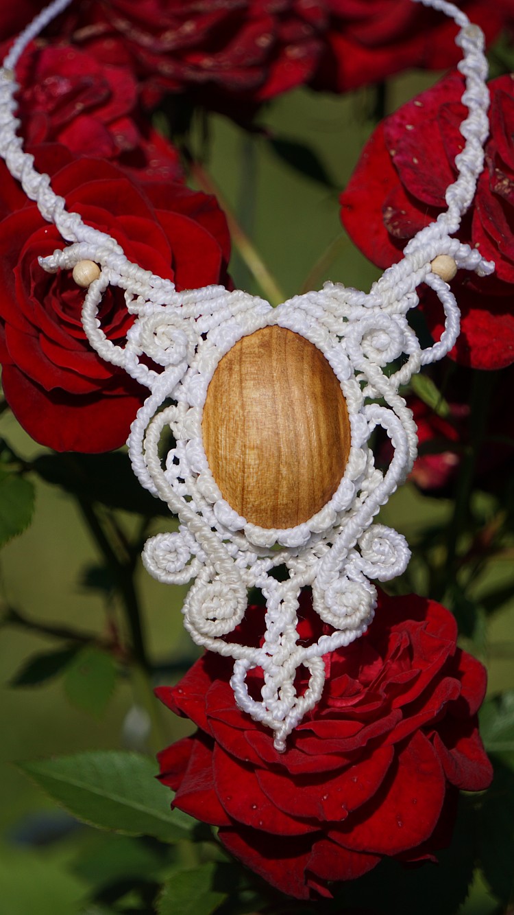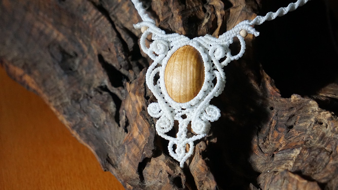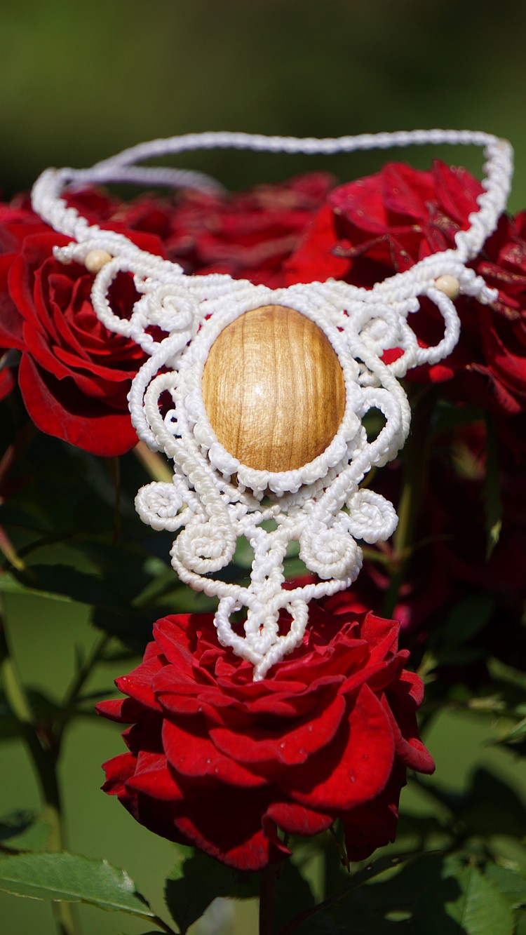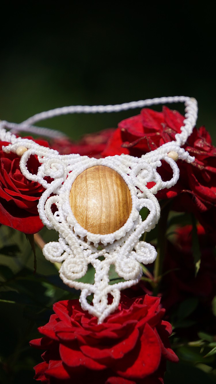 Šperk vznikl technikou micro macramé, což je uzlíkování pouze za pomoci šikovných prstů a fantasie. Používám brazilské povoskované šňůrky, které jsou jedny z nejkvalitnějších na světě pro svou pevnost a stálobarevnost. Šňůrky je možné ručně vyprat ve vlažné mýdlové lázni, vysušit v ručníku a nechat volně uschnout. Barva šňůrek je ve dvou odstínech bílé - čistě bílá a bílá natura. Lépe to podtrhne kresbu ornamentů.