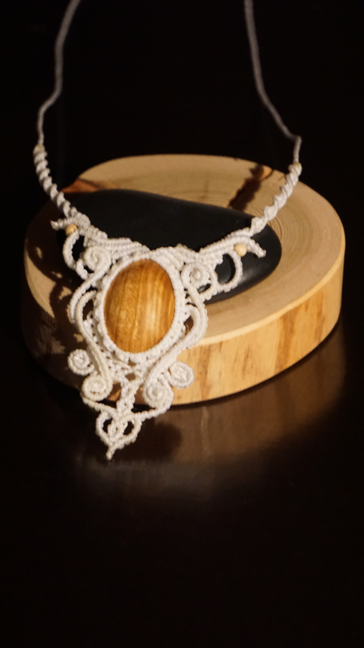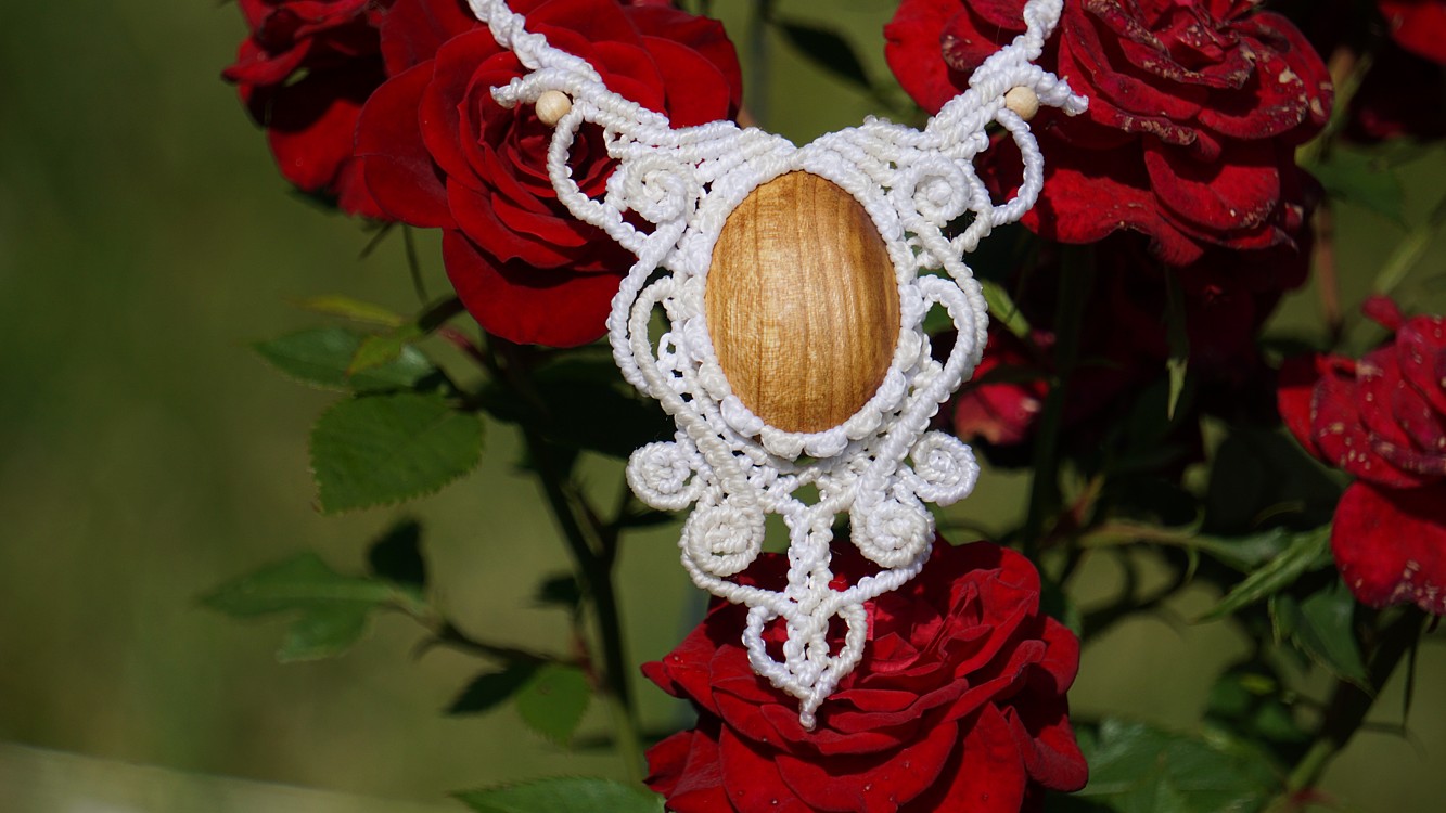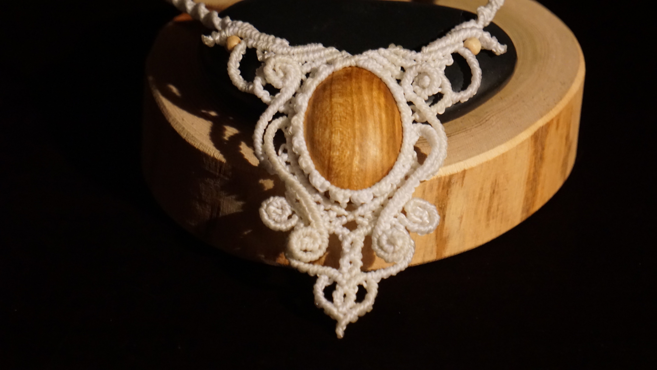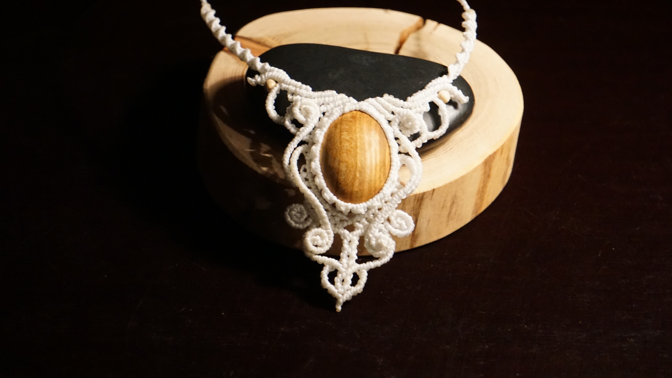 Šperk vznikl technikou micro macramé, což je uzlíkování pouze za pomoci šikovných prstů a fantasie. Používám brazilské povoskované šňůrky, které jsou jedny z nejkvalitnějších na světě pro svou pevnost a stálobarevnost. Šňůrky je možné ručně vyprat ve vlažné mýdlové lázni, vysušit v ručníku a nechat volně uschnout. Barva šňůrek je ve dvou odstínech bílé - čistě bílá a bílá natura. Lépe to podtrhne kresbu ornamentů.