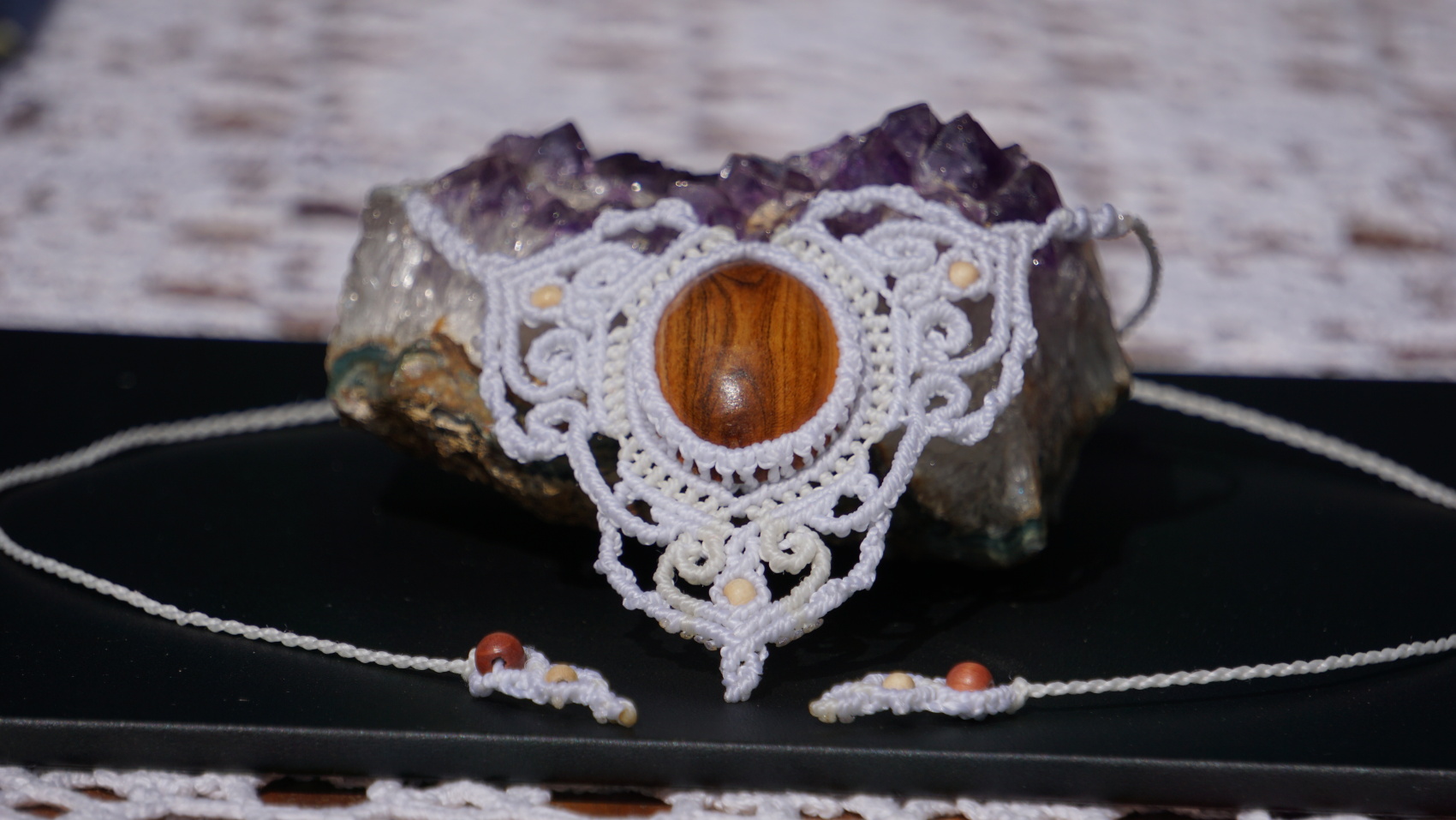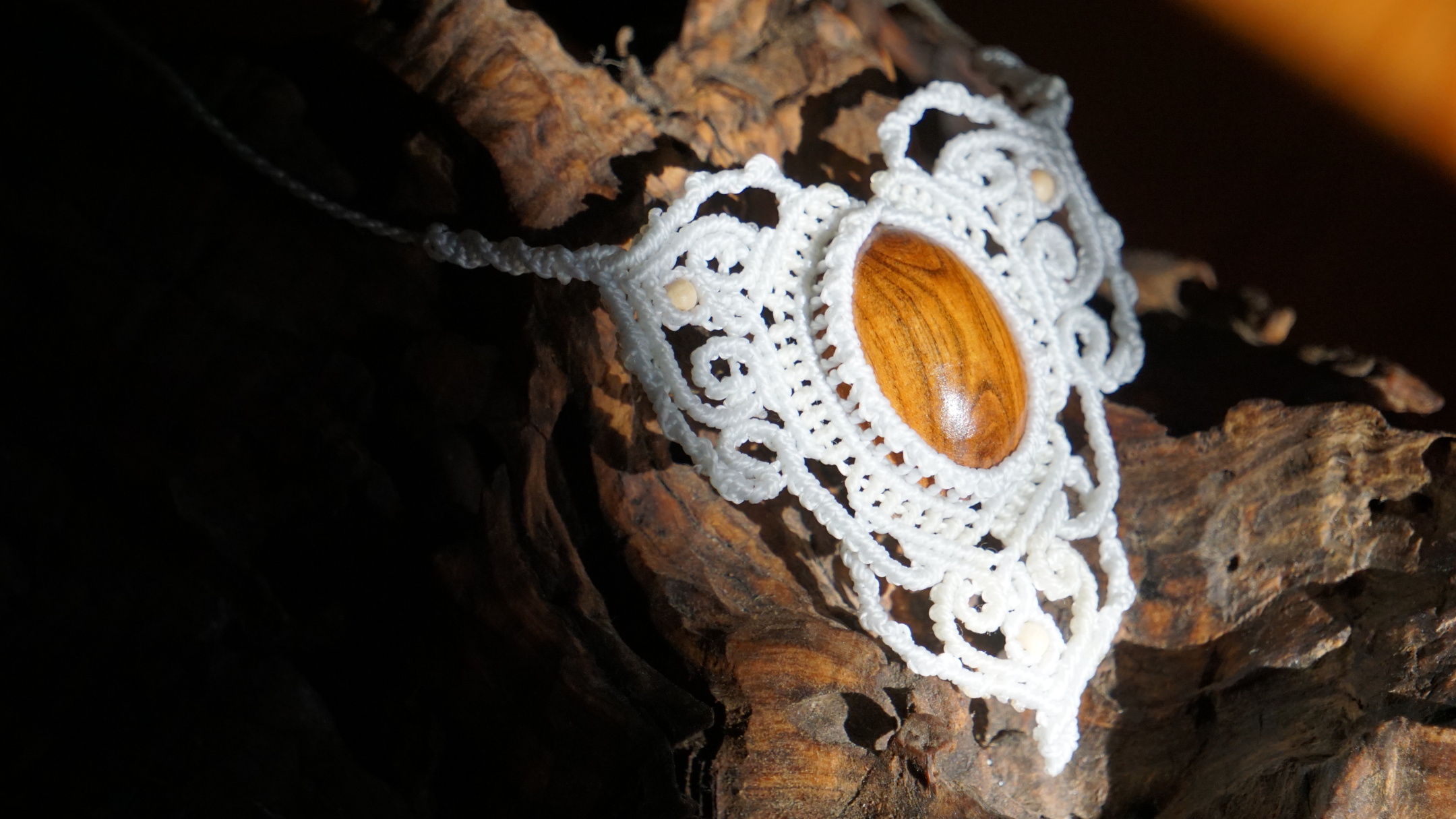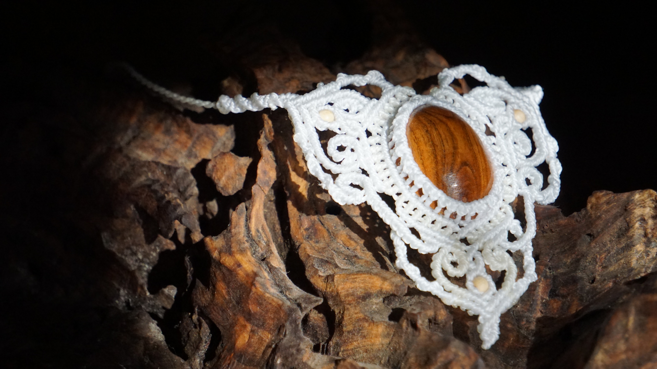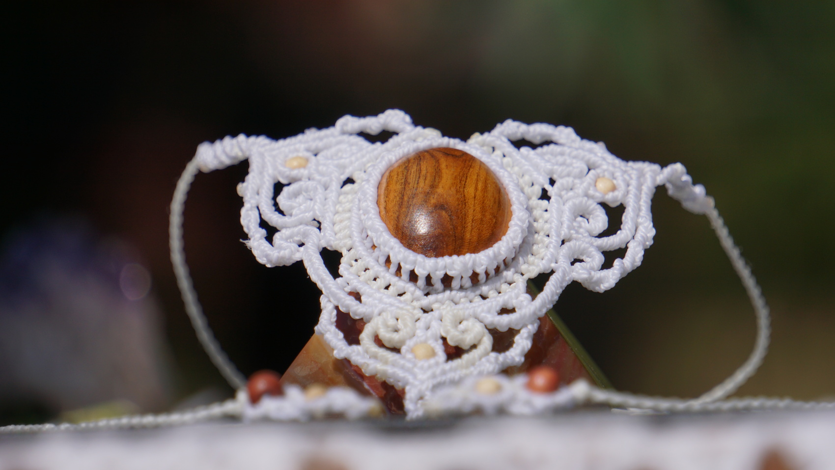 Šperk vznikl technikou micro macramé, což je uzlíkování pouze za pomoci šikovných prstů a fantasie. Používám brazilské povoskované šňůrky, které jsou jedny z nejkvalitnějších na světě pro svou pevnost a stálobarevnost. Šňůrky je možné ručně vyprat ve vlažné mýdlové lázni, vysušit v ručníku a nechat volně uschnout.