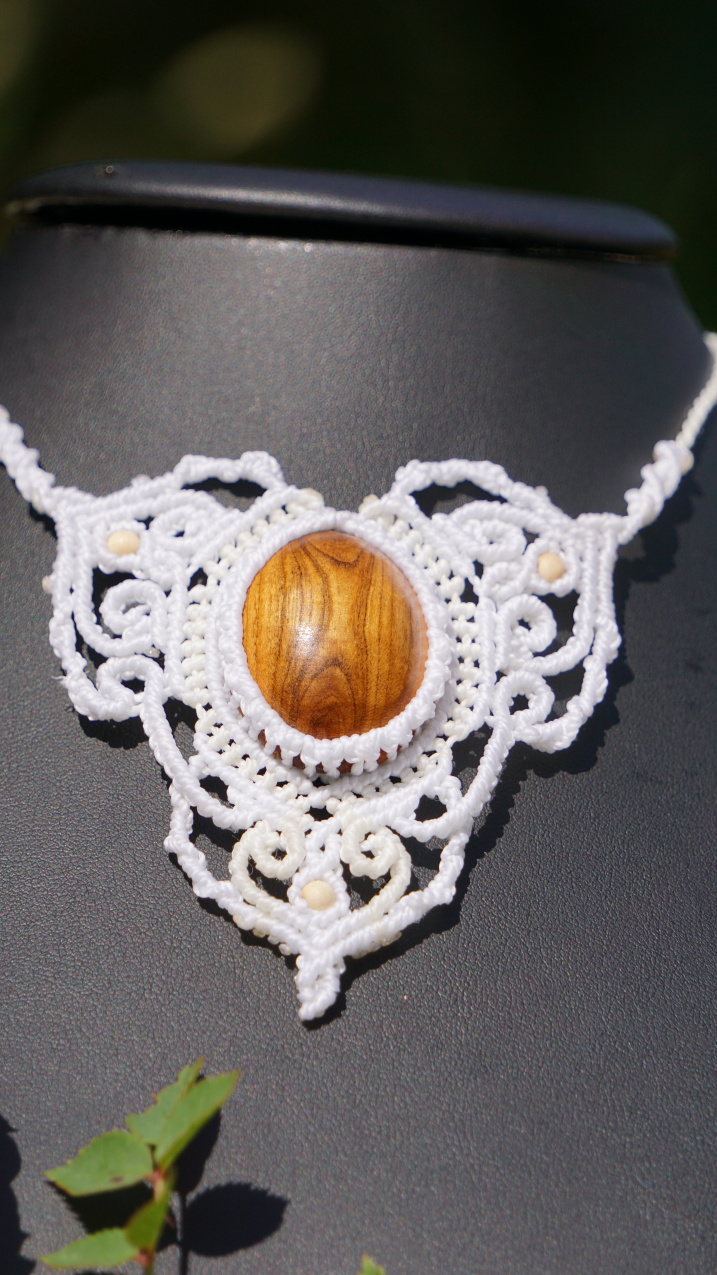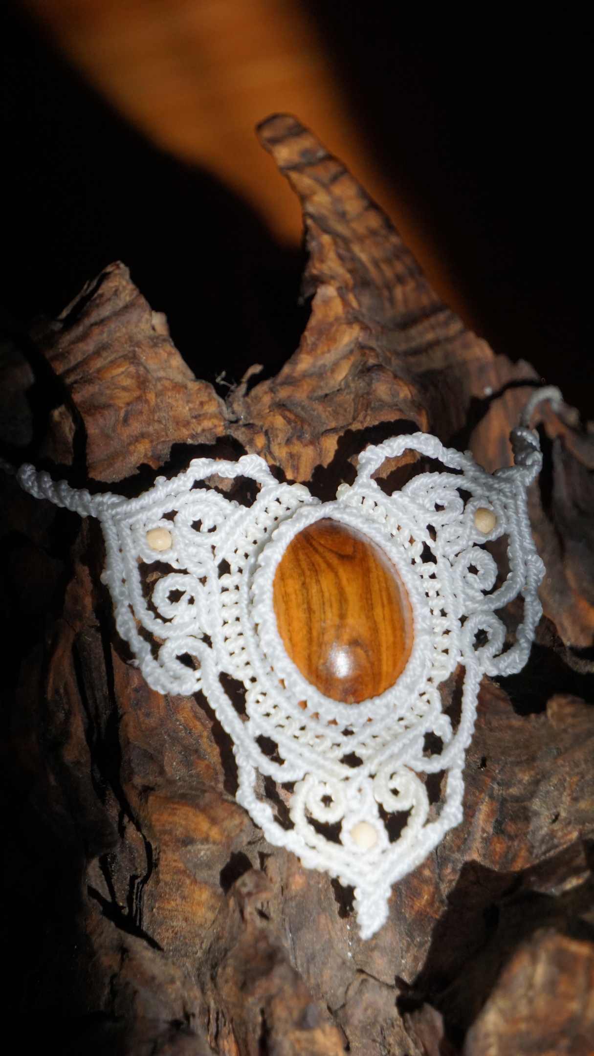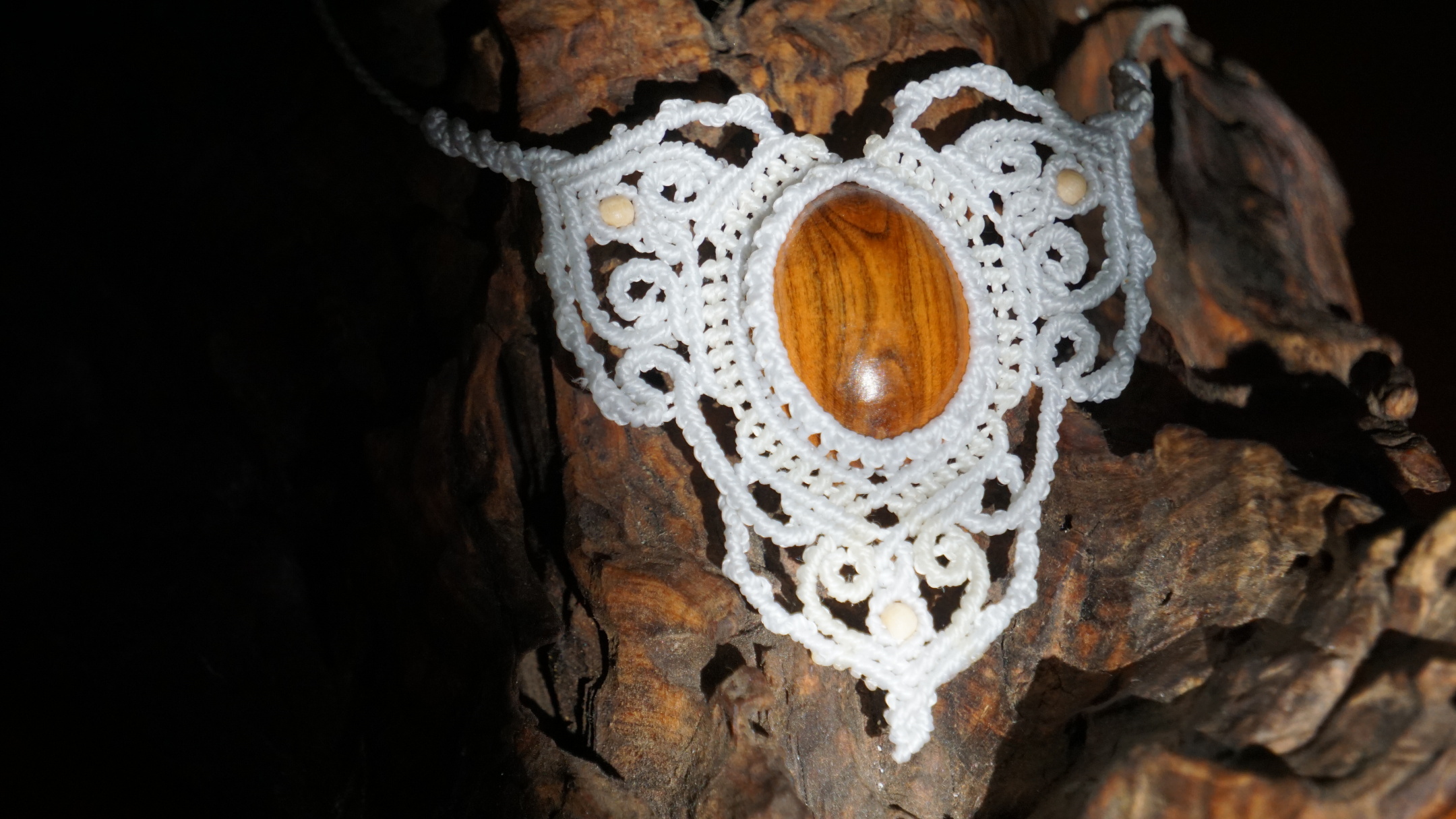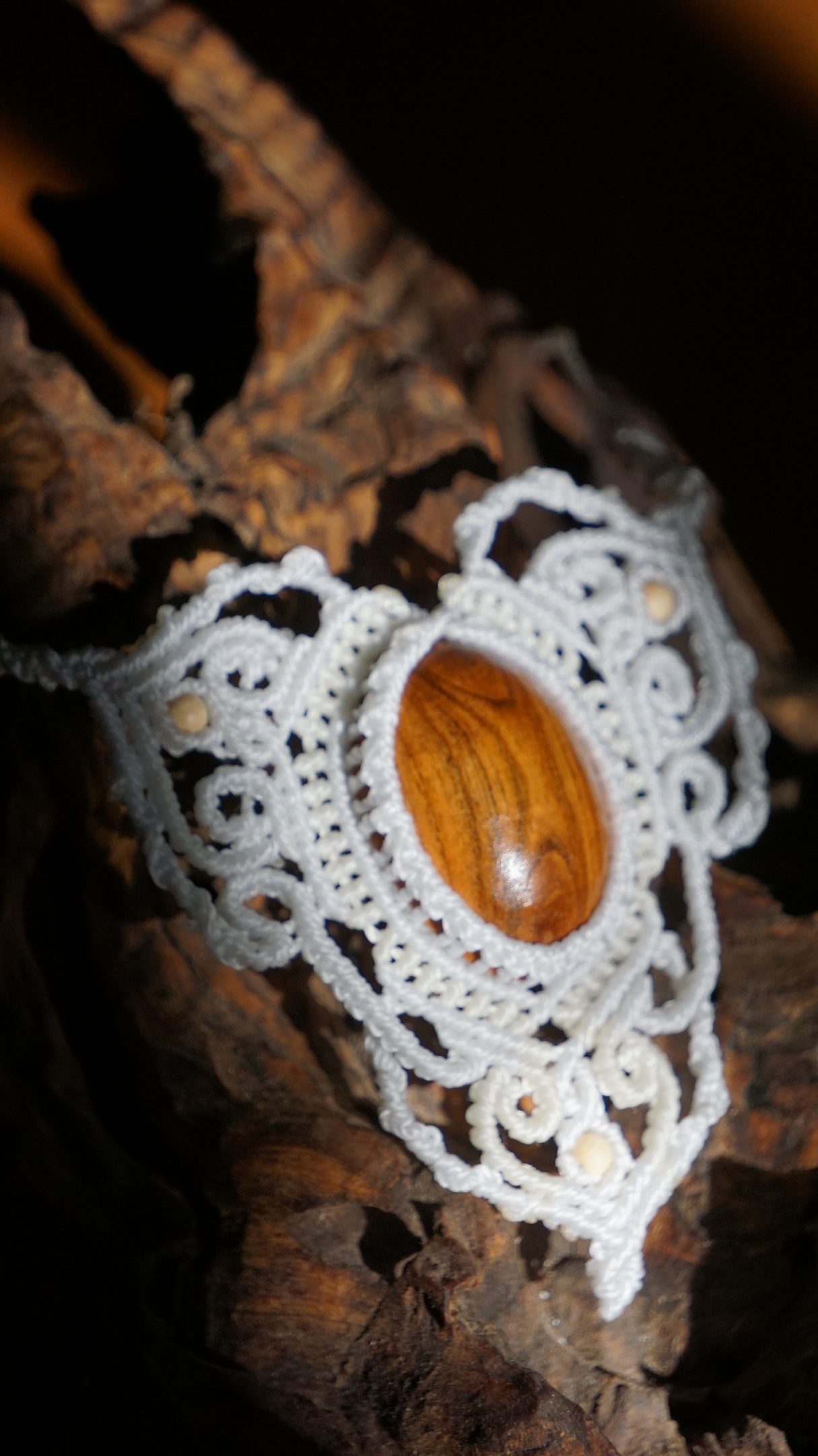 Šperk vznikl technikou micro macramé, což je uzlíkování pouze za pomoci šikovných prstů a fantasie. Používám brazilské povoskované šňůrky, které jsou jedny z nejkvalitnějších na světě pro svou pevnost a stálobarevnost. Šňůrky je možné ručně vyprat ve vlažné mýdlové lázni, vysušit v ručníku a nechat volně uschnout.