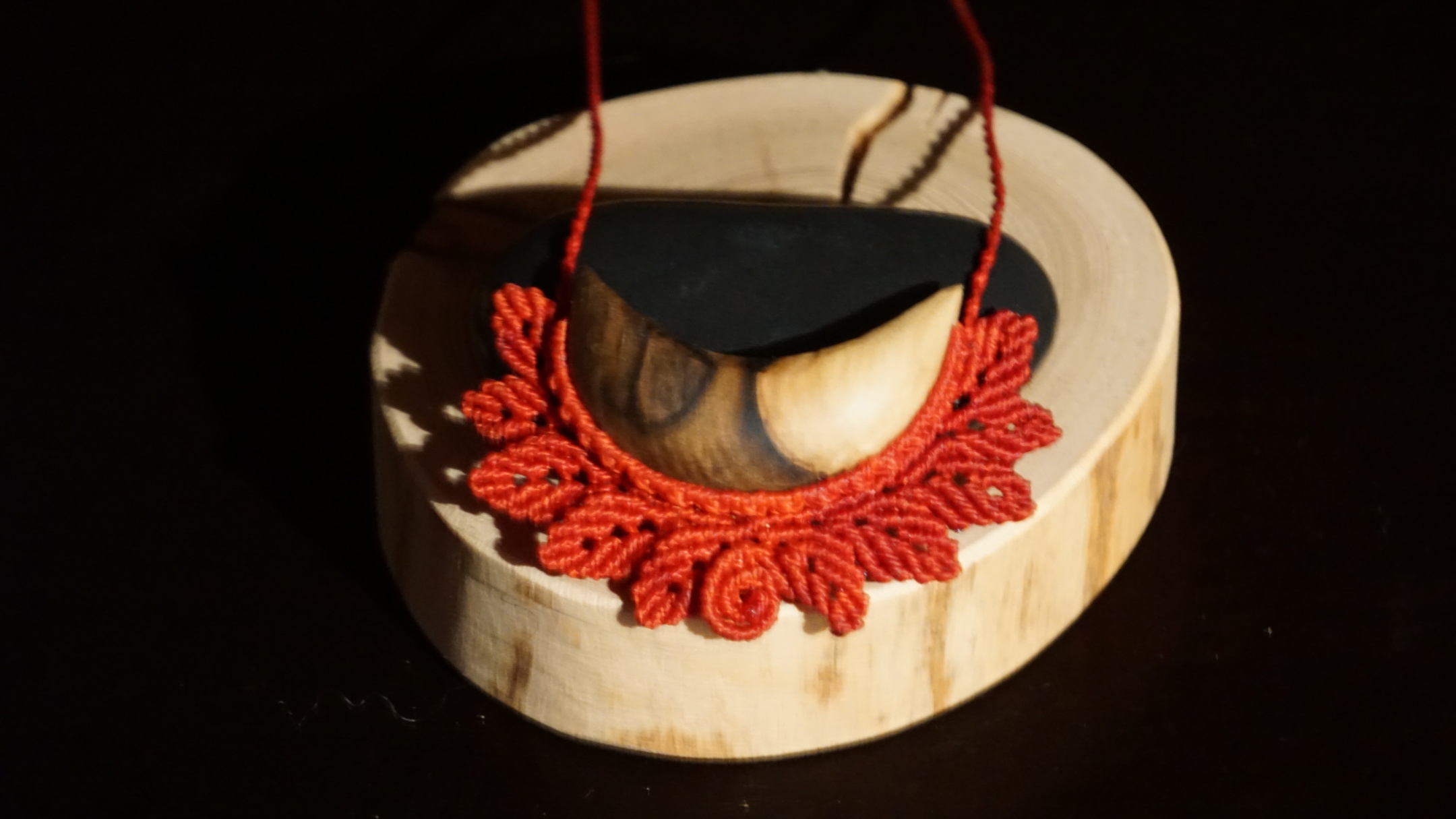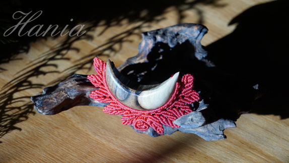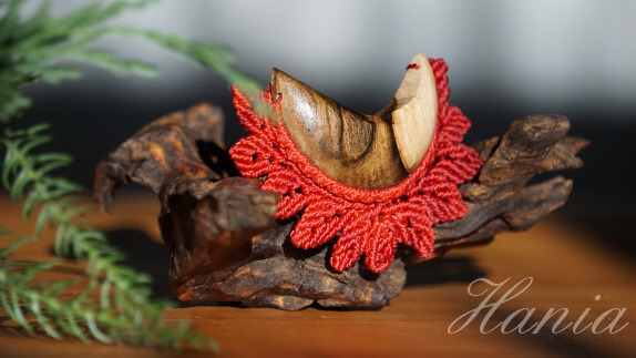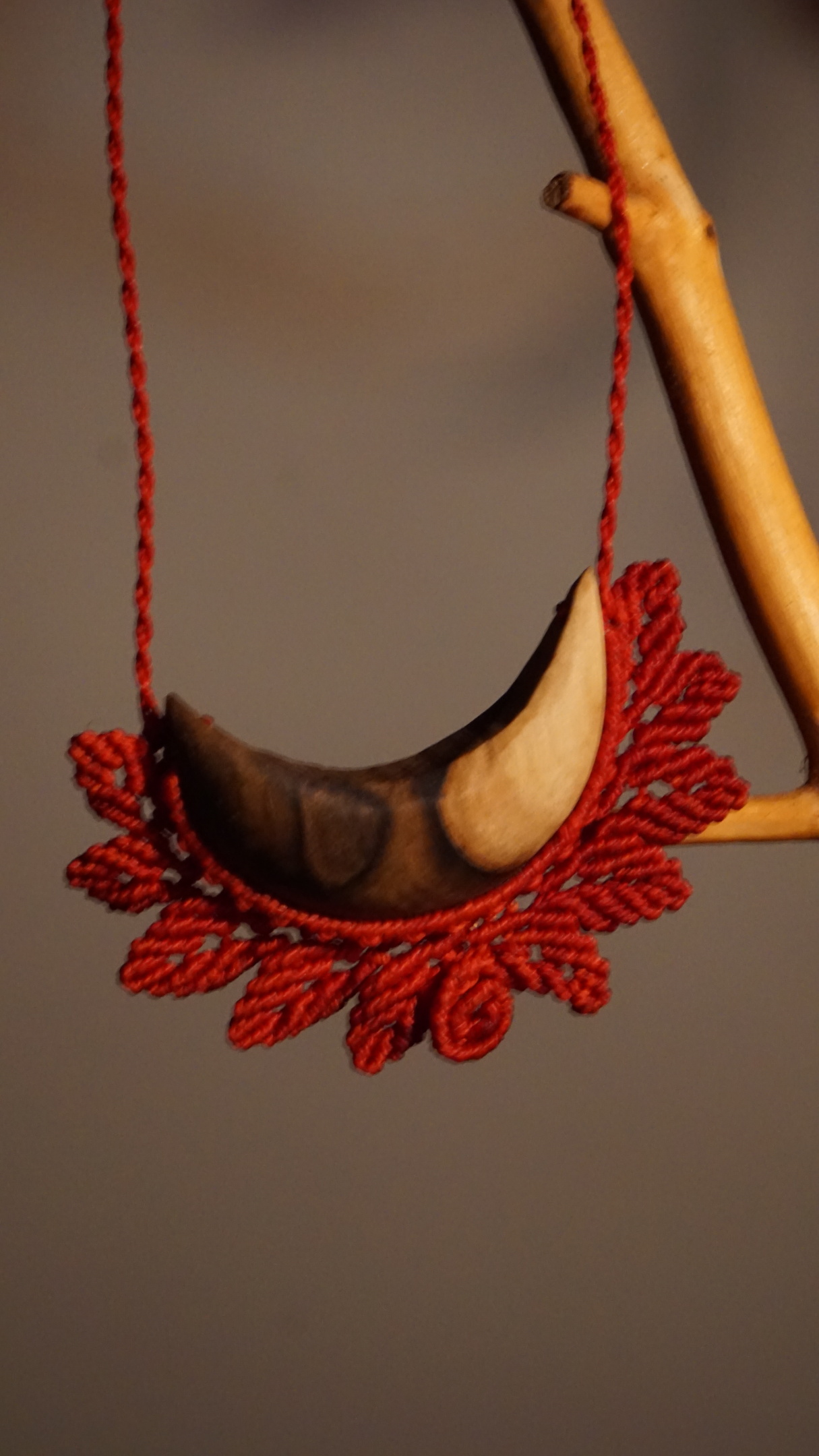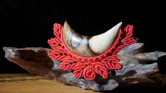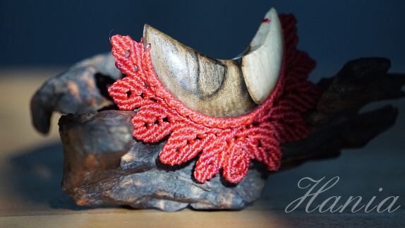 Šperk vznikl technikou micro macramé, což je uzlíkování pouze za pomoci šikovných prstů a fantasie. Používám brazilské povoskované šňůrky, které jsou jedny z nejkvalitnějších na světě pro svou pevnost a stálobarevnost. Šňůrky je možné ručně vyprat ve vlažné mýdlové lázni, vysušit v ručníku a nechat volně uschnout.
